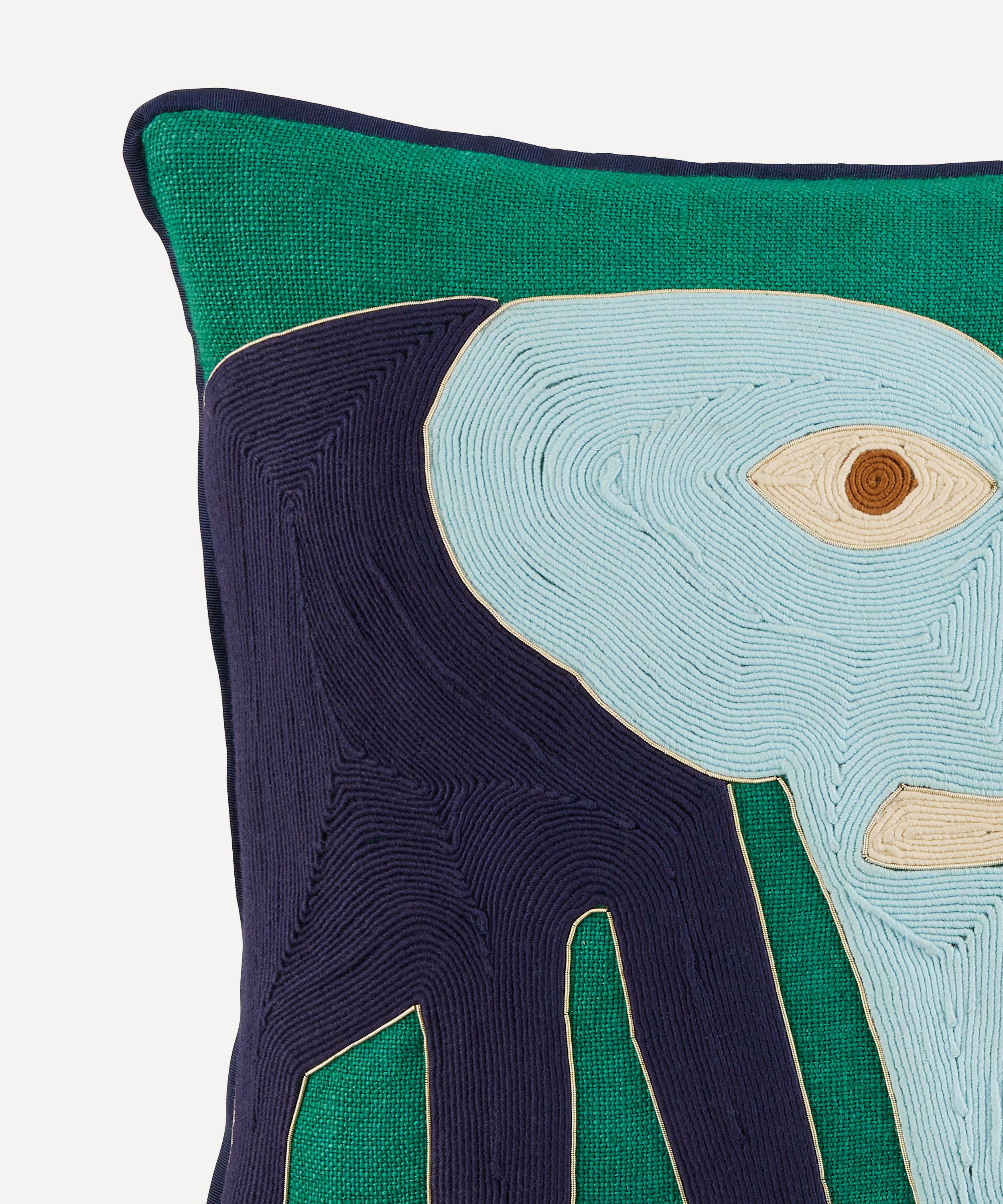 Crafted from linen in a rich, dark-green hue, it’s decorated with concentric cord embroidery with metallic gold trims for a subtle sparkle. Use it as an eye-catching accent on its own or pair it with your own favourite soft furnishings to add colour to your armchair, daybed or sofa.