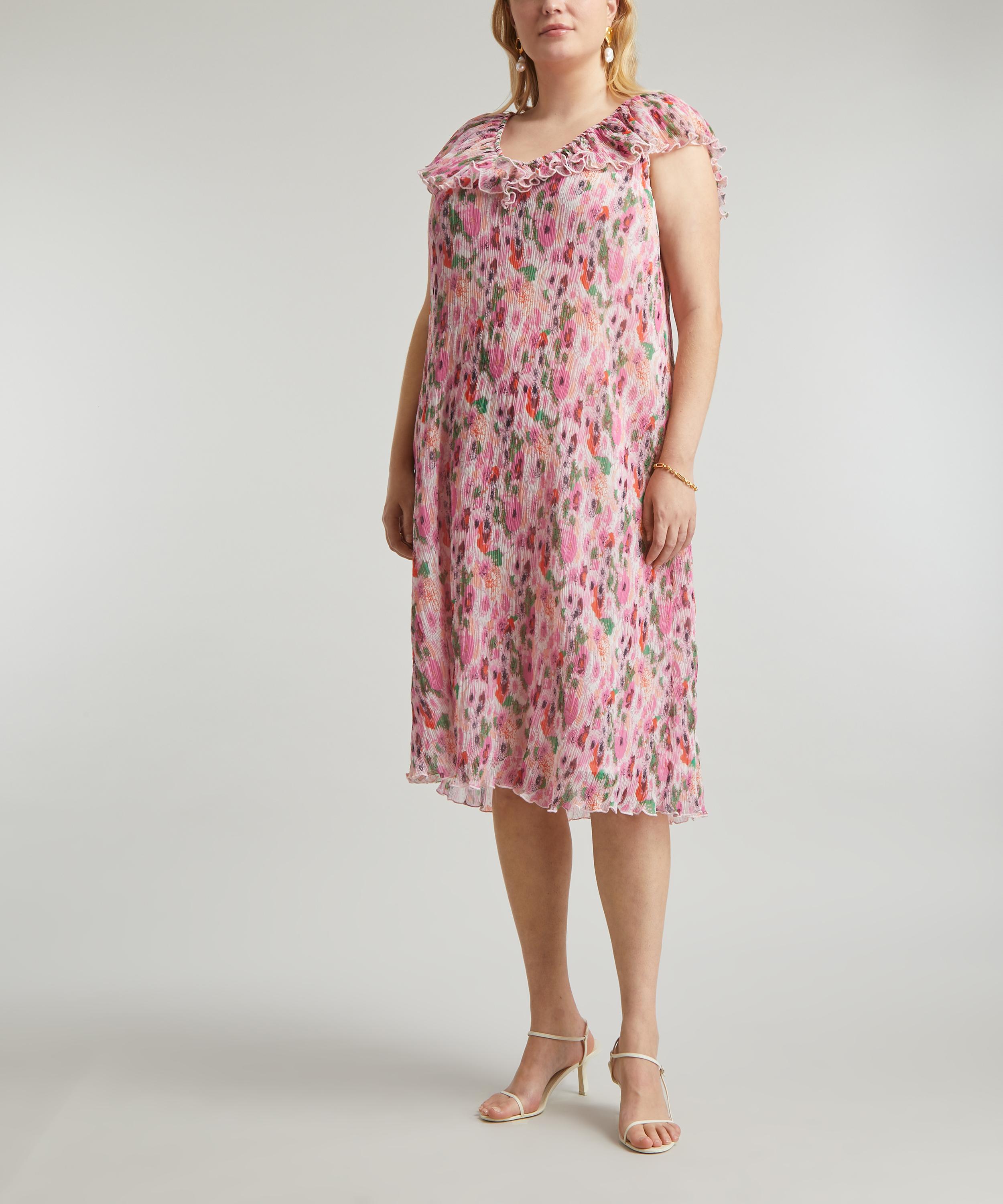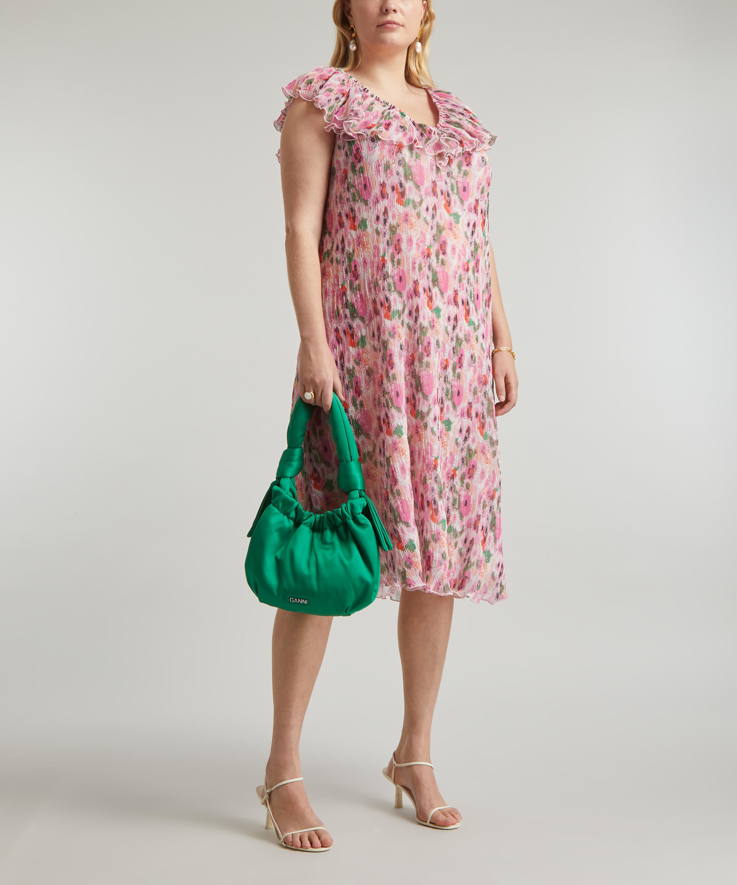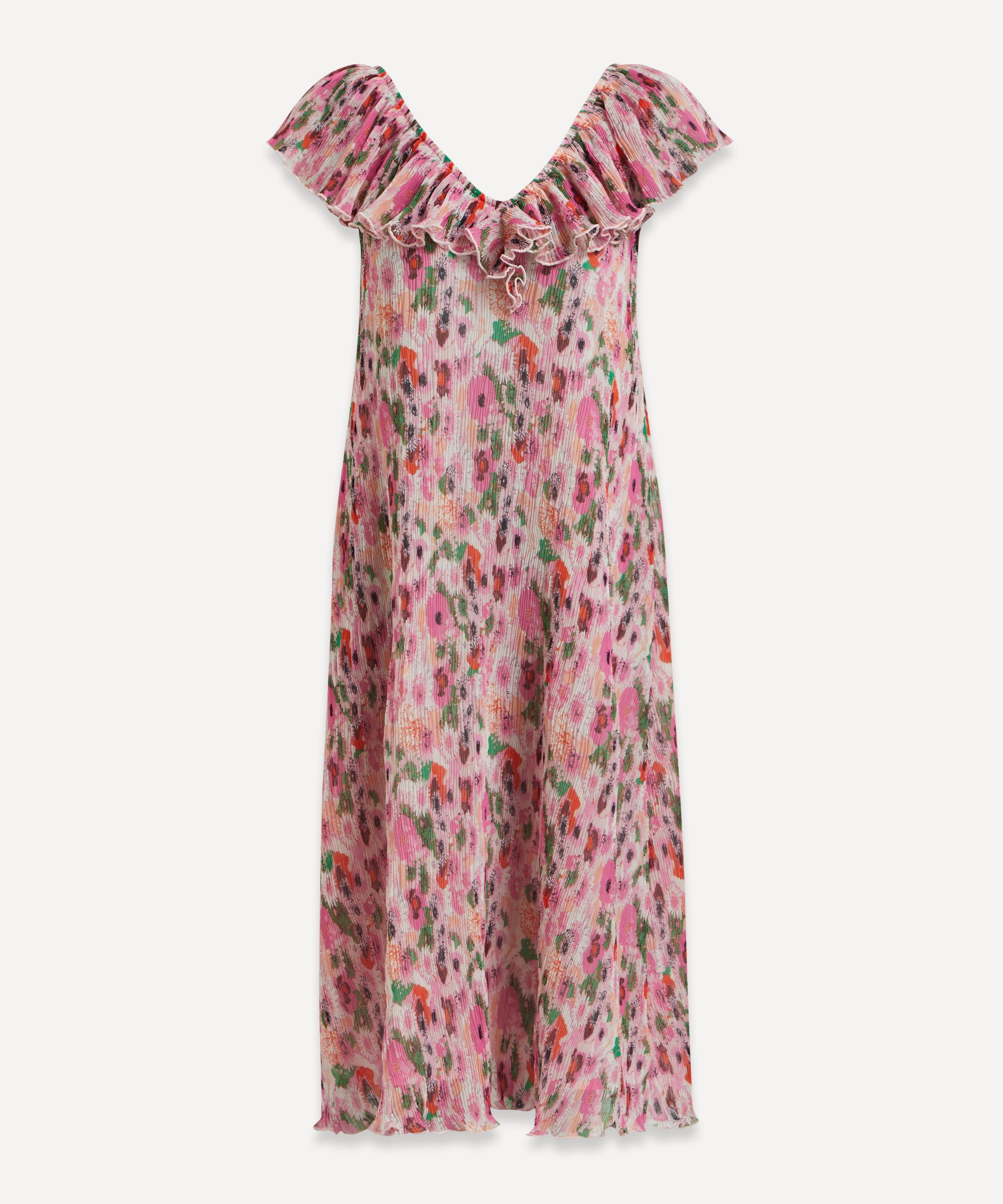 Effortlessly twee with its pink floral pattern, this pleated mini-dress from GANNI exudes elegance. Loose and lightweight in crinkle-pleated georgette crafted from 100% certified recycled polyester, its V-neckline is embellished with a ruffled edge at the front and back.