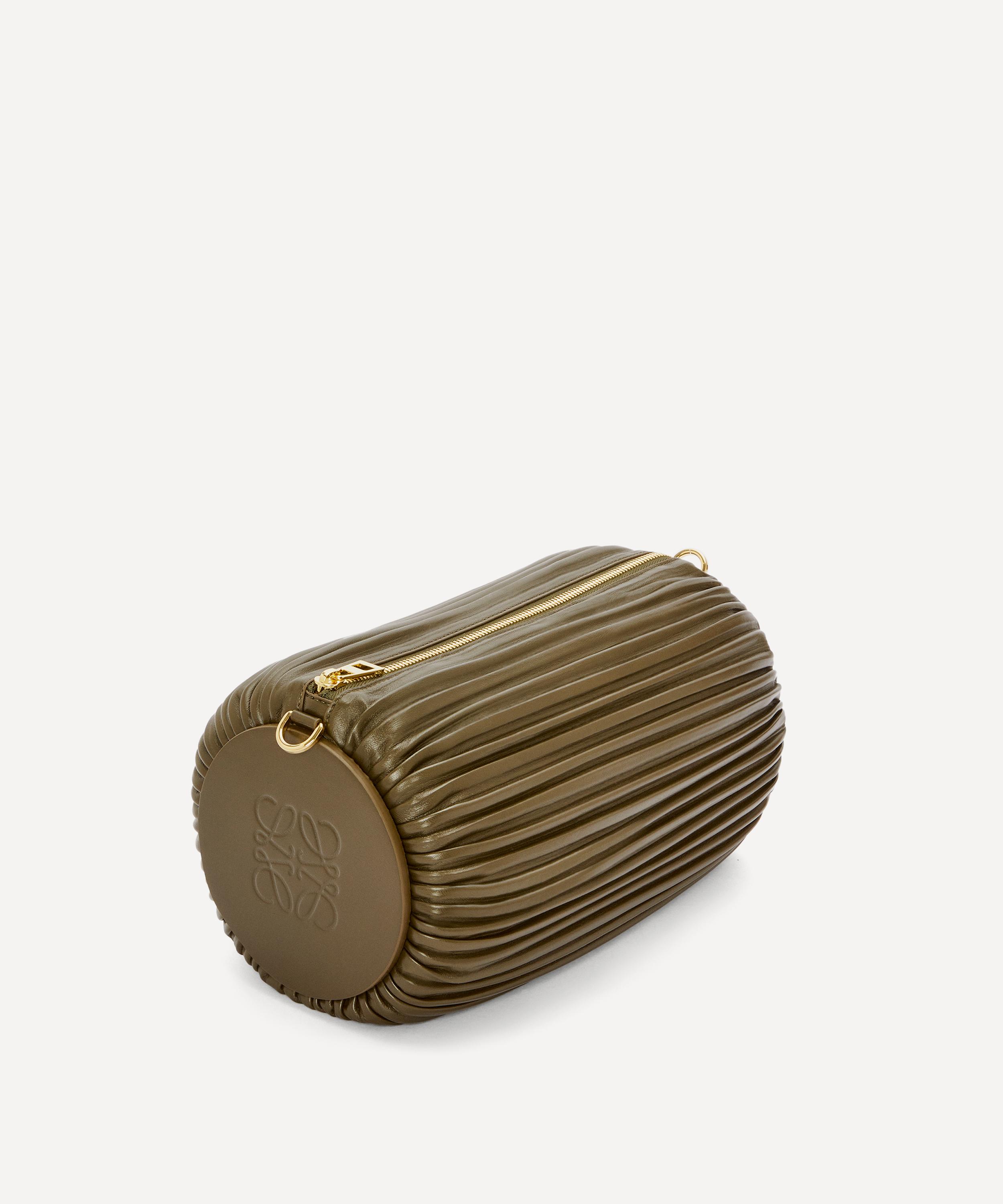 The Pleated Leather Bracelet pouch bag from Spanish fashion house Loewe is named after its distinctive tubular shape that converts into a bracelet.