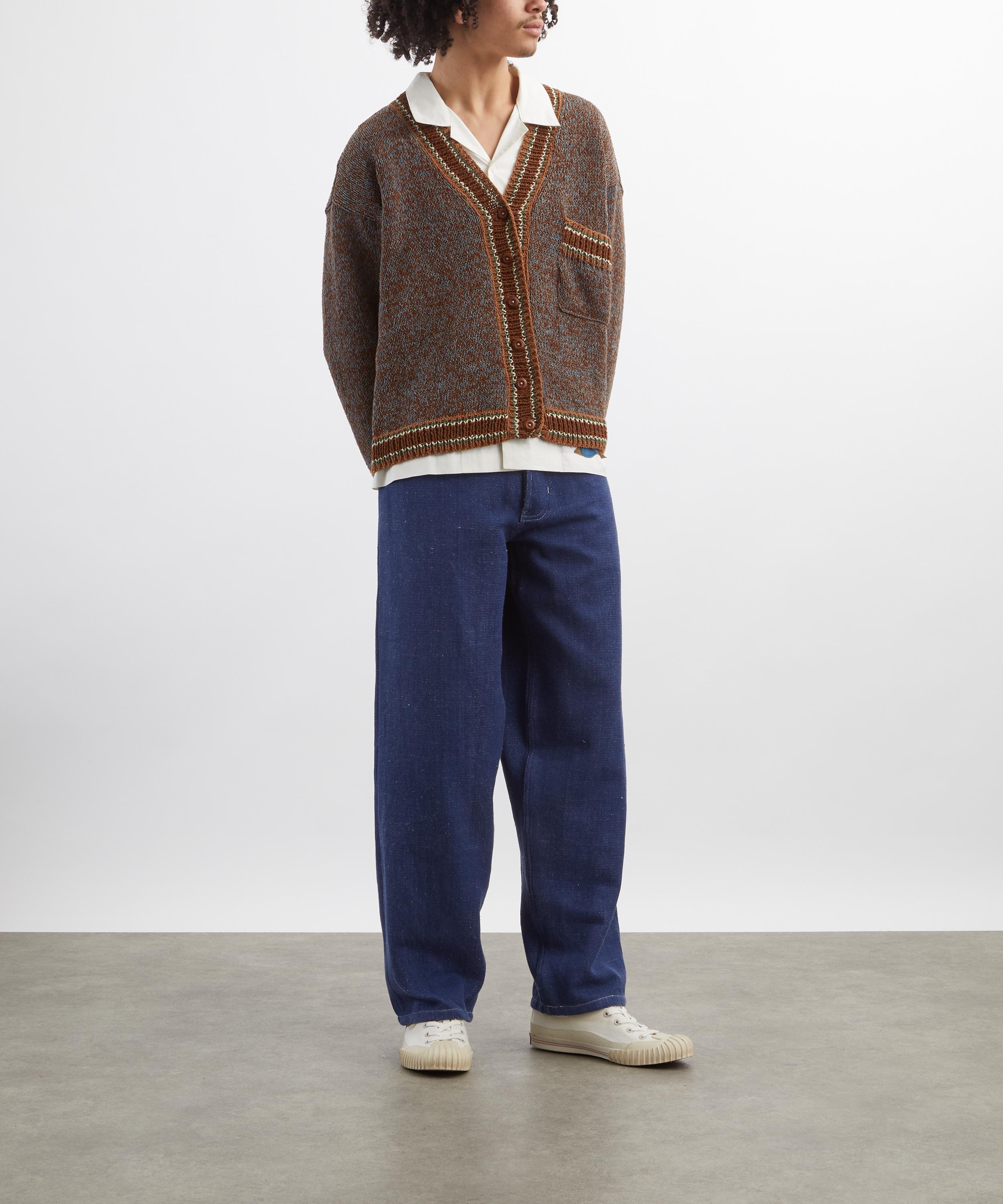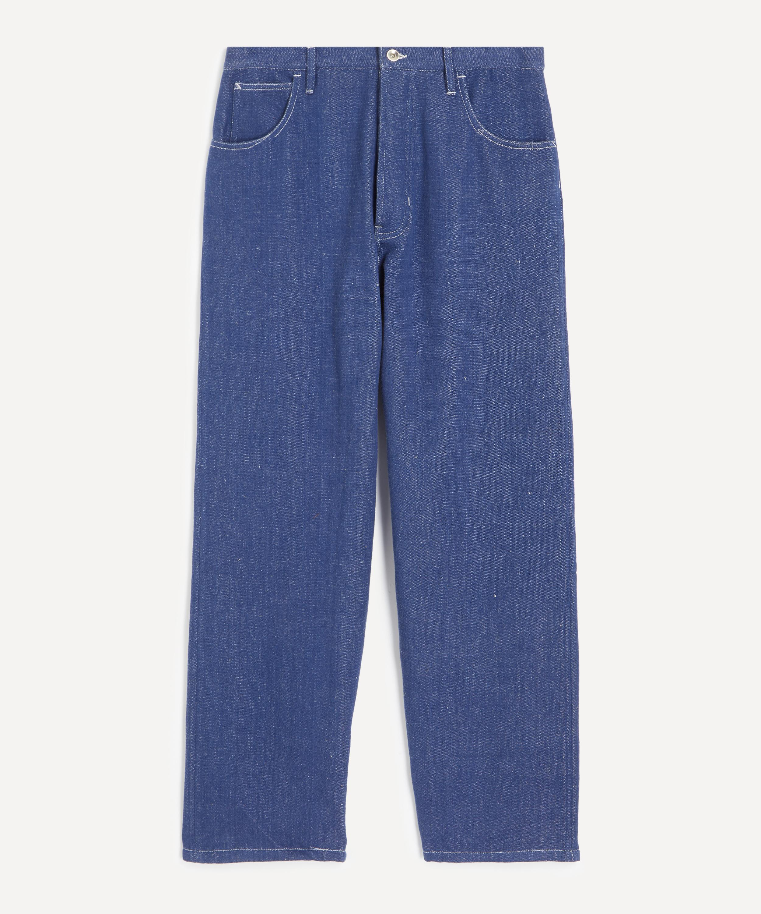 Crafted from organic, hand-dyed denim, they feature contrast stitching, classic five-pocket styling, and a relaxed, wide-leg fit.