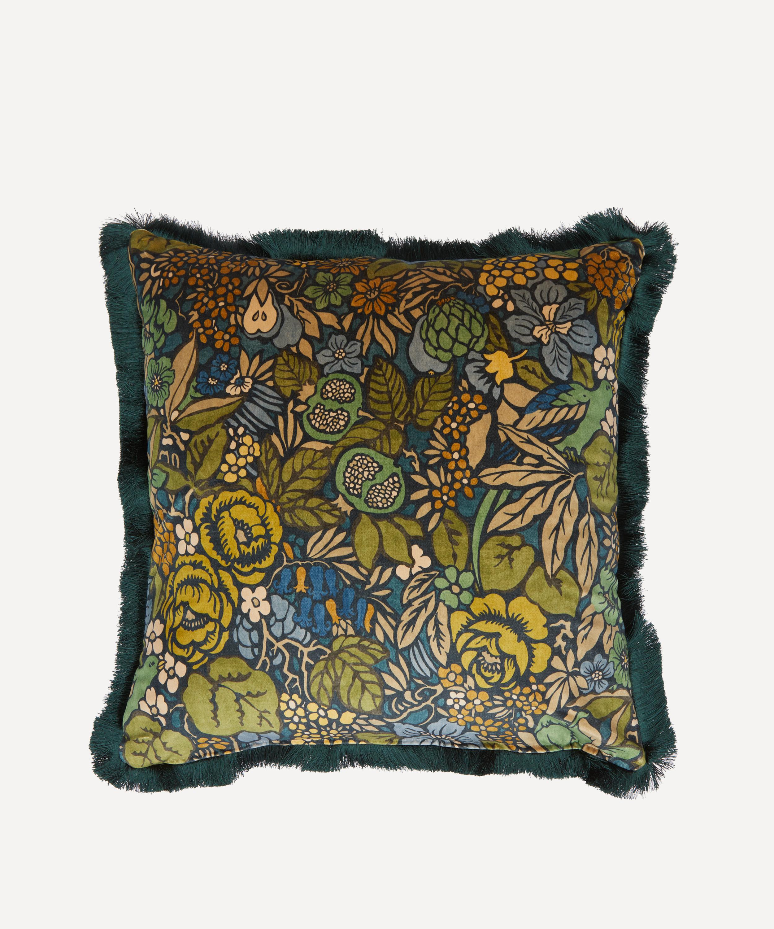 This Liberty square cushion features our Pomegranate Garden print and is decadently soft with a plump recycled duck feather filling. Created in the Liberty design studio, Pomegranate Garden – originally created in 1965 under the creative direction of former Design Director, Bernard Nevill, as part of the trendsetting ‘Lotus’ collections of the 1960s – appears here in a beautifully engineered iteration, complete with a fringed edge for an immaculate finish. The cushion’s classic silhouette and richly hued palette add an elegant twist to modern interiors.
