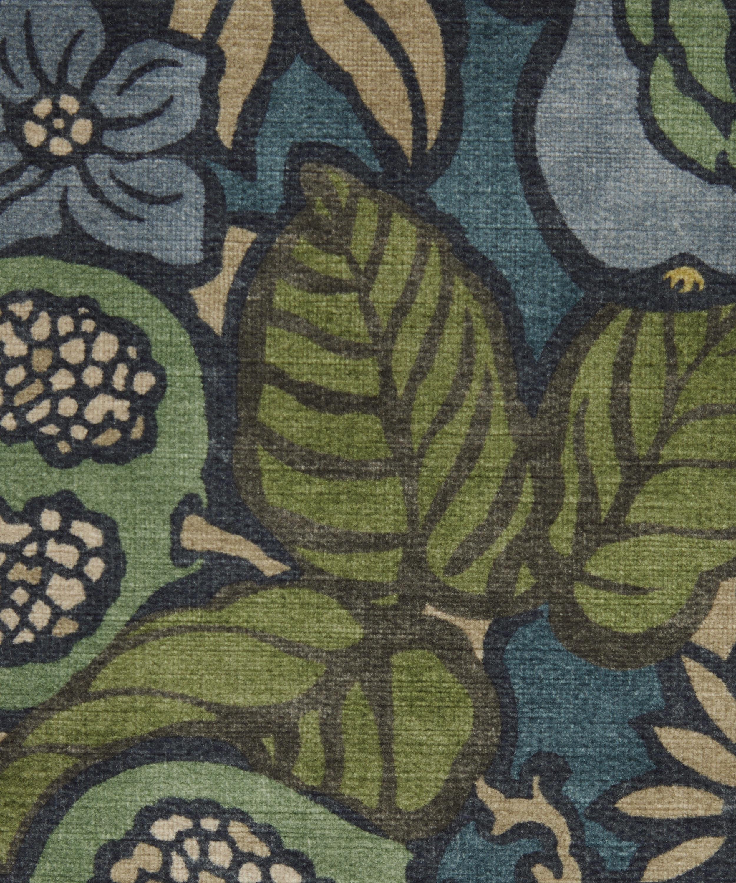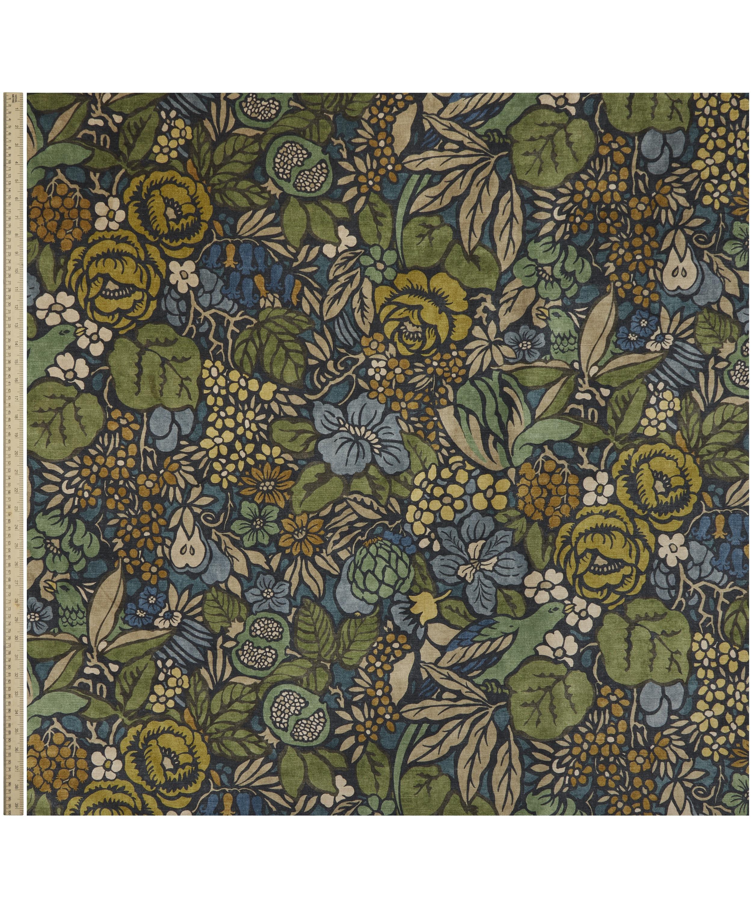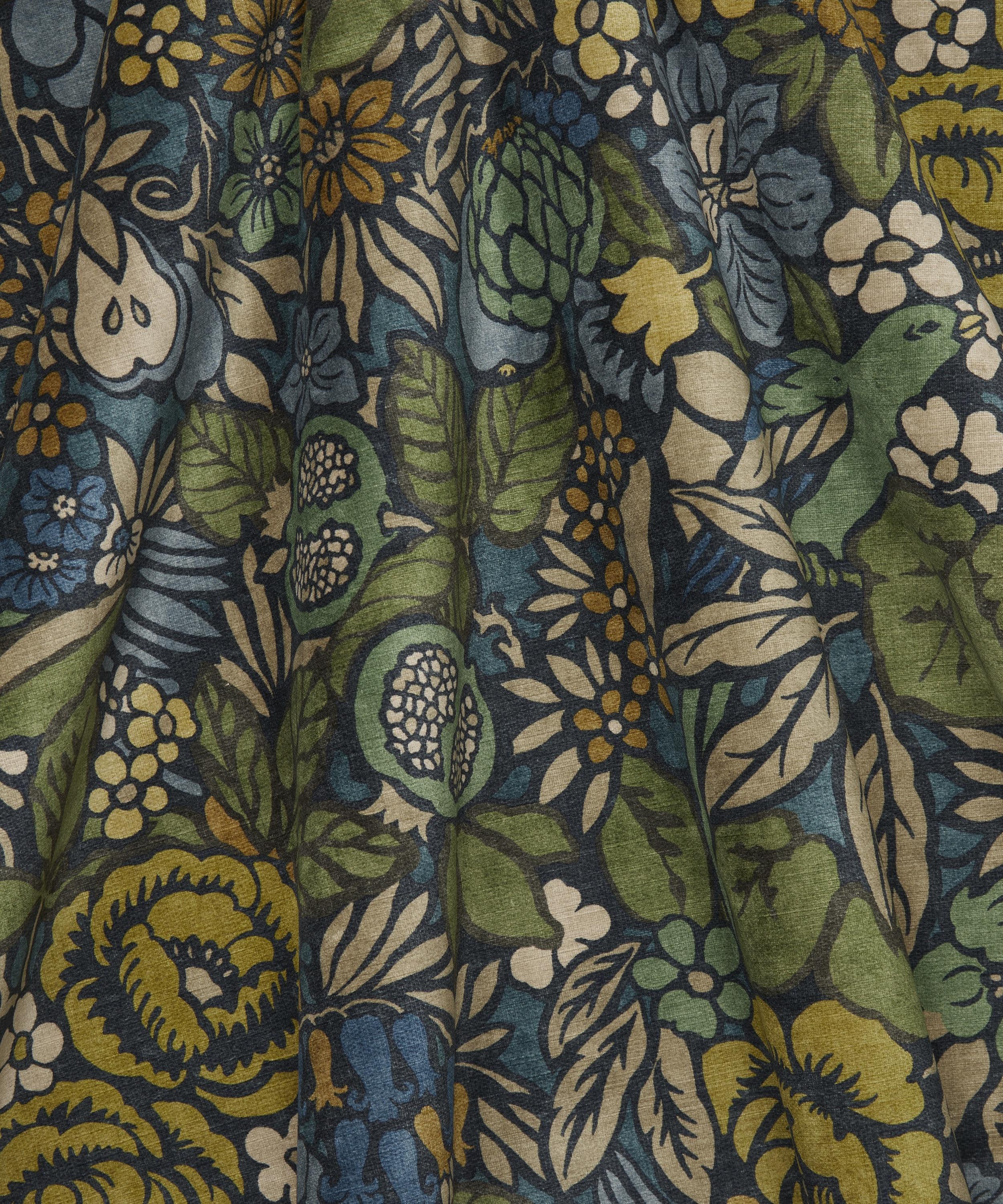 Pomegranate Garden was originally created in 1965 under the creative direction of former Design Director, Bernard Nevill, as part of the trendsetting ‘Lotus’ collections of the 1960s. Meticulously redrawn and reimagined into a stylised representation of a blossoming orchard, this eclectic pattern softens bold outlines with delicate textures. Camouflaged birds nestle amidst lush foliage, while roses, tulips, irises, and bluebells intertwine with vibrant accents of delectable fruits. Printed on Liberty’s signature velvet, this fabric is suitable for upholstery, drapery, cushions, and accessories.