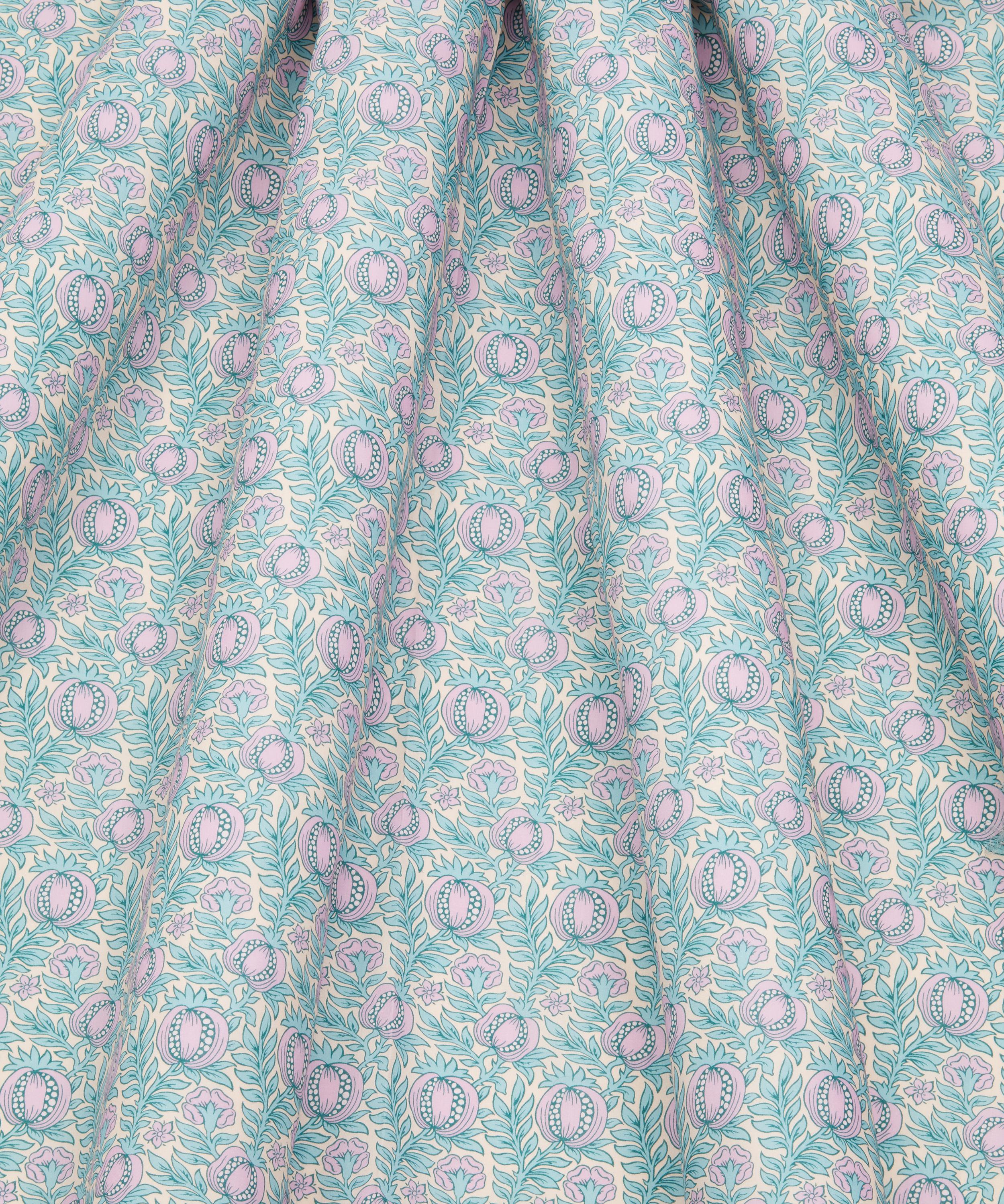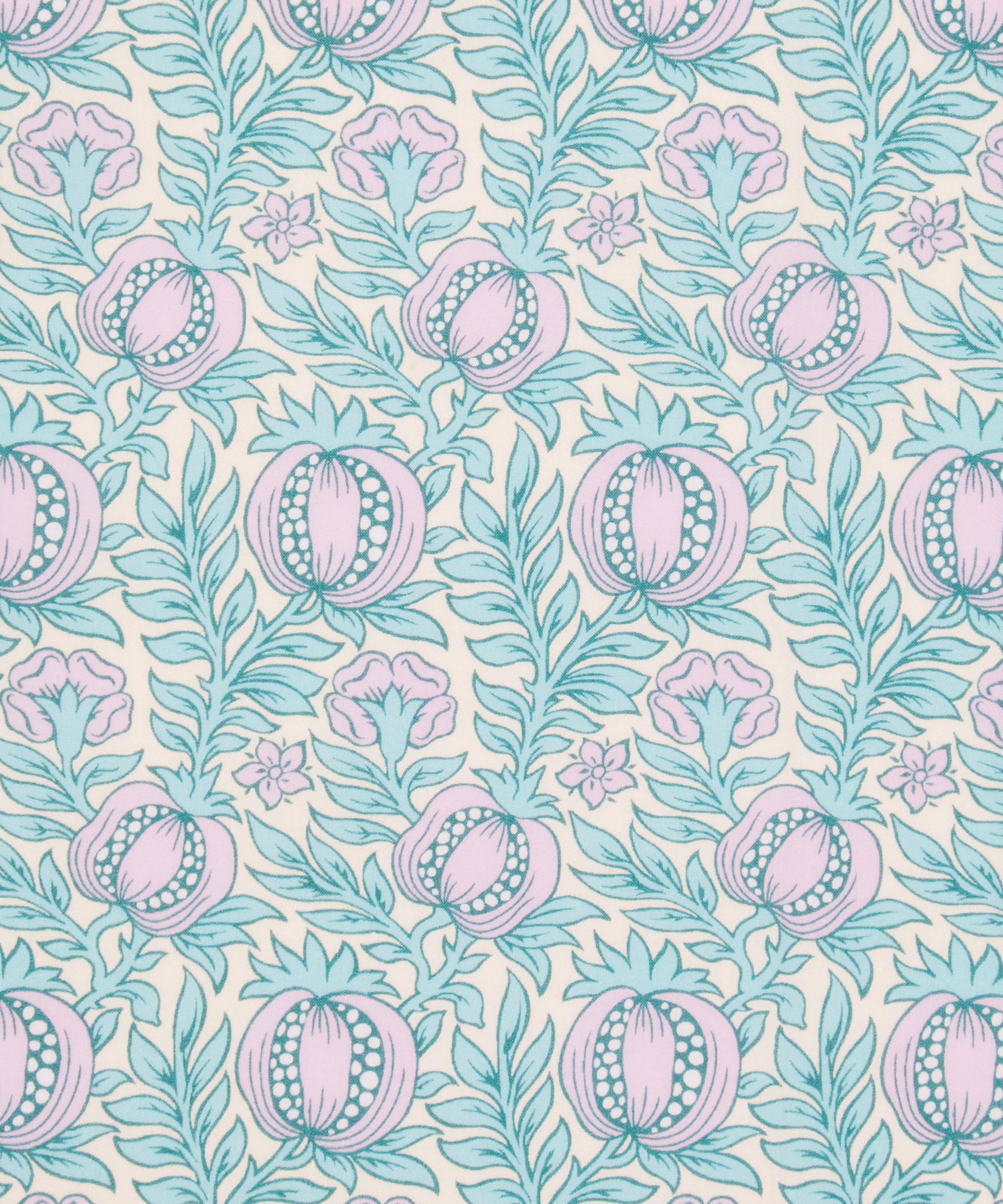 Unearthed in a Liberty archival book from the mid-1880s, Pomegranate Leaf stands as one of the earliest fruit designs ever block-printed by the company. Originally offered on lustrous silk, this dense botanical features verdant leafy stems and stylised pomegranates, interspersed among Tudor roses and simplified daisies. With its bold outlines and flat, hand-blocked colours, the design captures the essence of Liberty’s early craftsmanship, making it a true heritage classic.