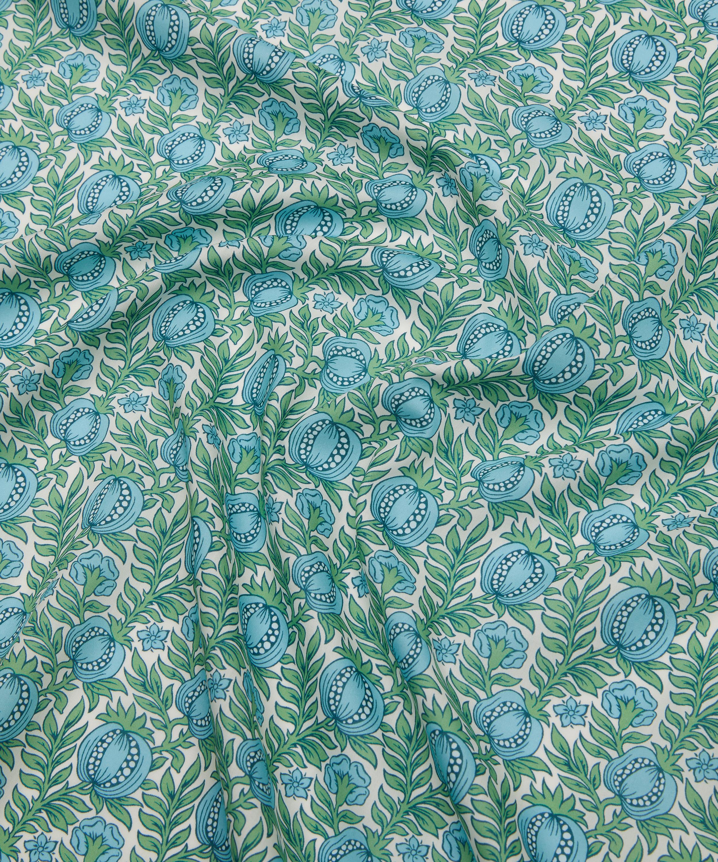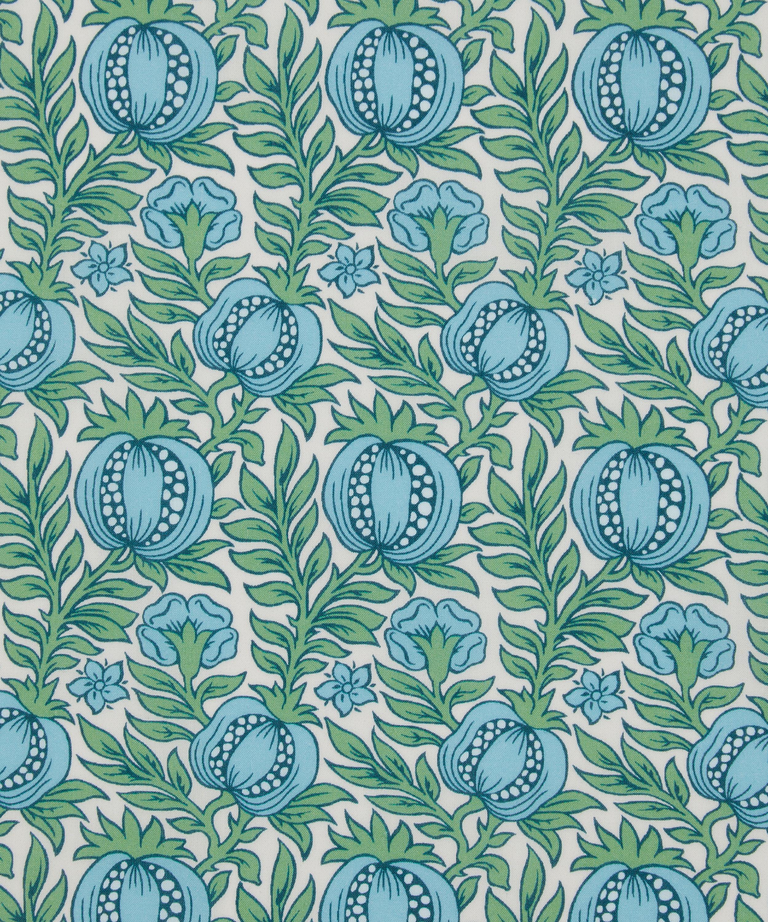 Unearthed in a Liberty archival book from the mid-1880s, Pomegranate Leaf stands as one of the earliest fruit designs ever block-printed by the company. Originally offered on lustrous silk, this dense botanical features verdant leafy stems and stylised pomegranates, interspersed among Tudor roses and simplified daisies. With its bold outlines and flat, hand-blocked colours, the design captures the essence of Liberty’s early craftsmanship, making it a true heritage classic.