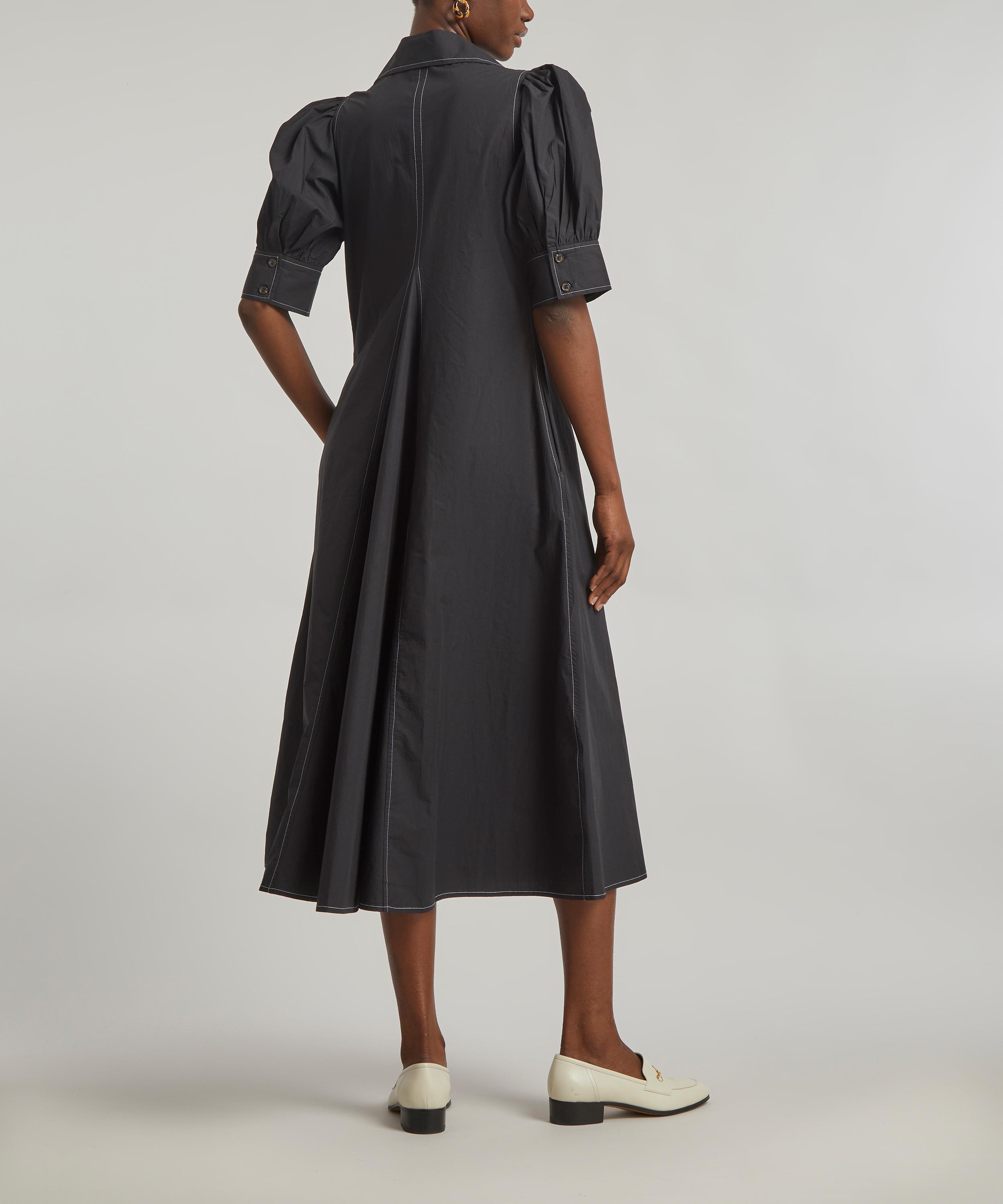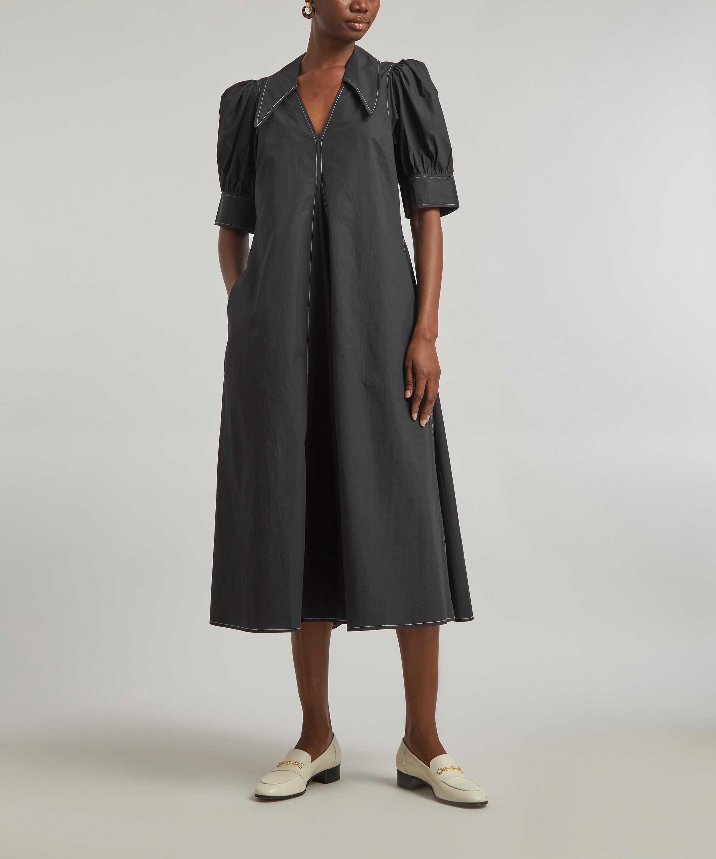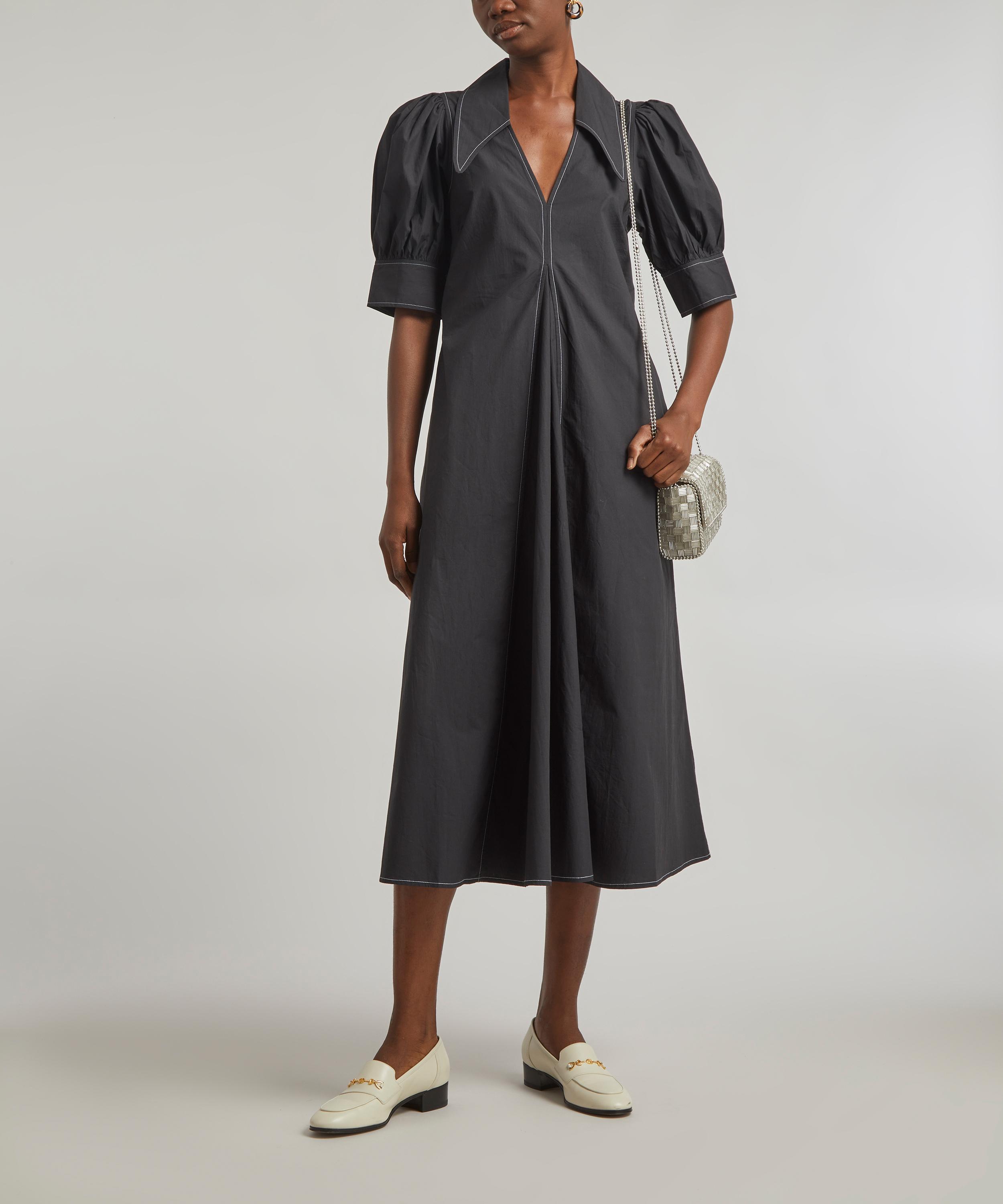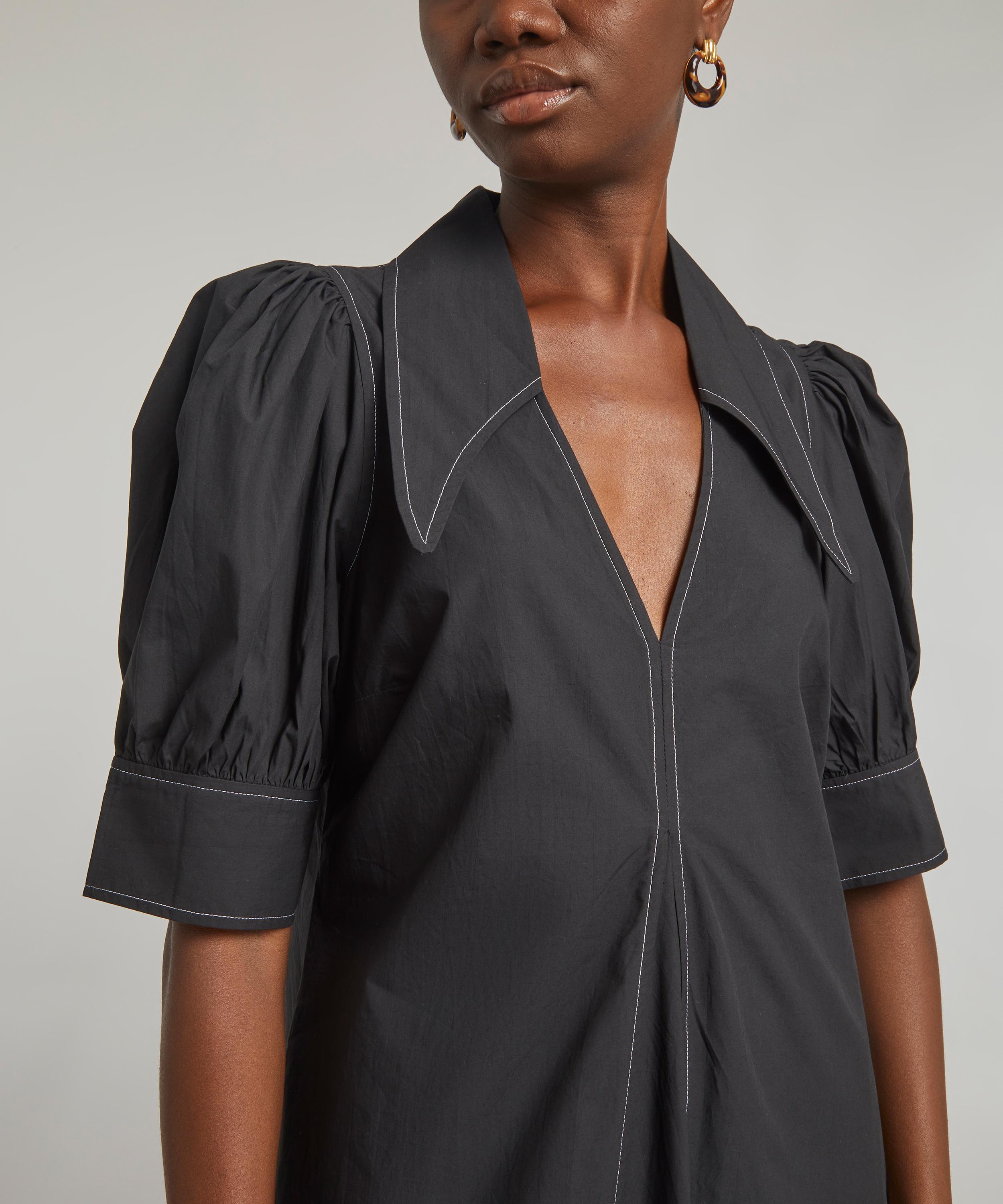 Make a statement with minimal effort with this organic cotton poplin midi-dress from cool-girl Scandinavian label Ganni. Wearable for work and weekends, this relaxed-fitting dress flares at the front and features elbow-length cuffed puff sleeves and an elegant V-neckline, complete with an oversized pointed collar.