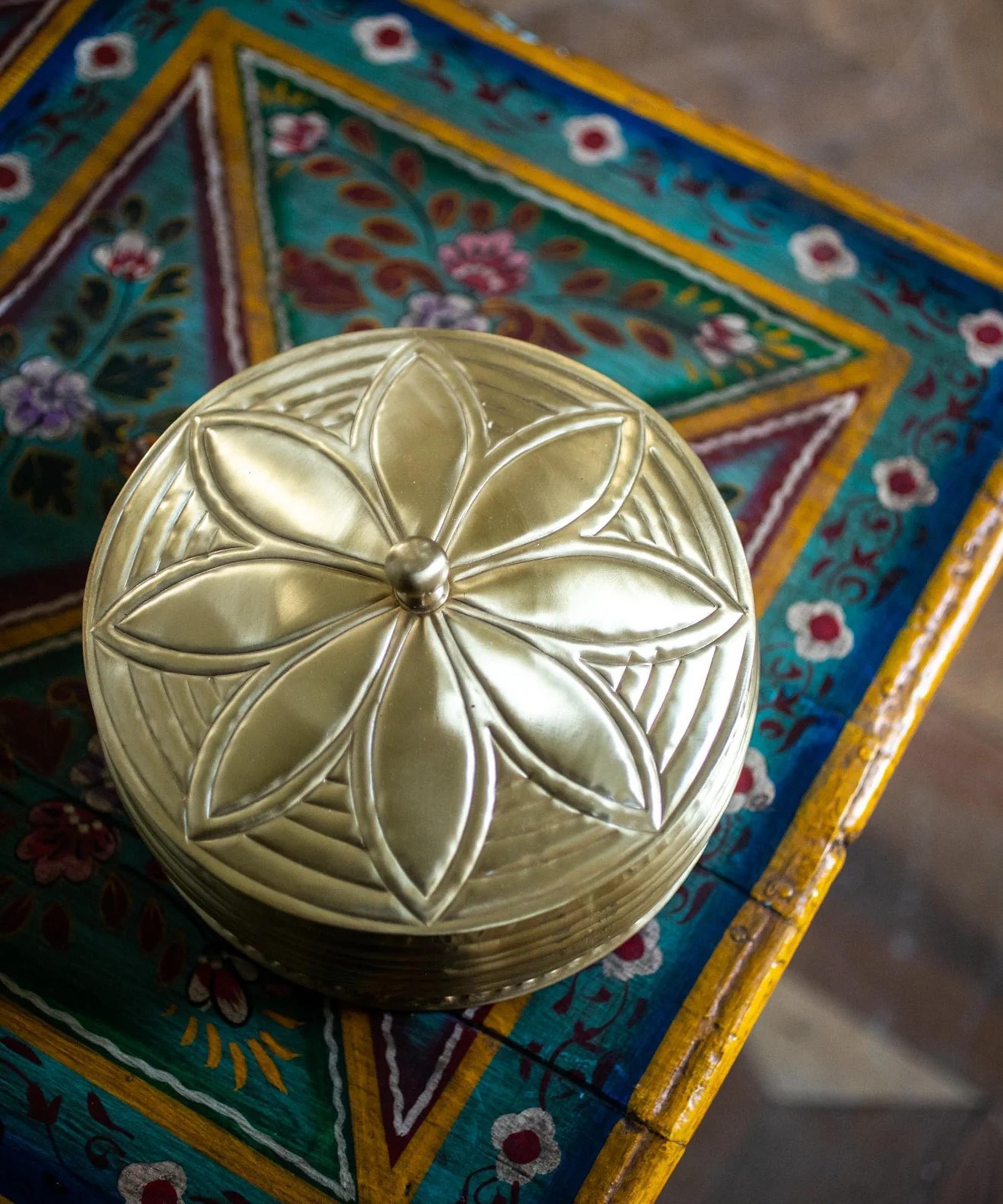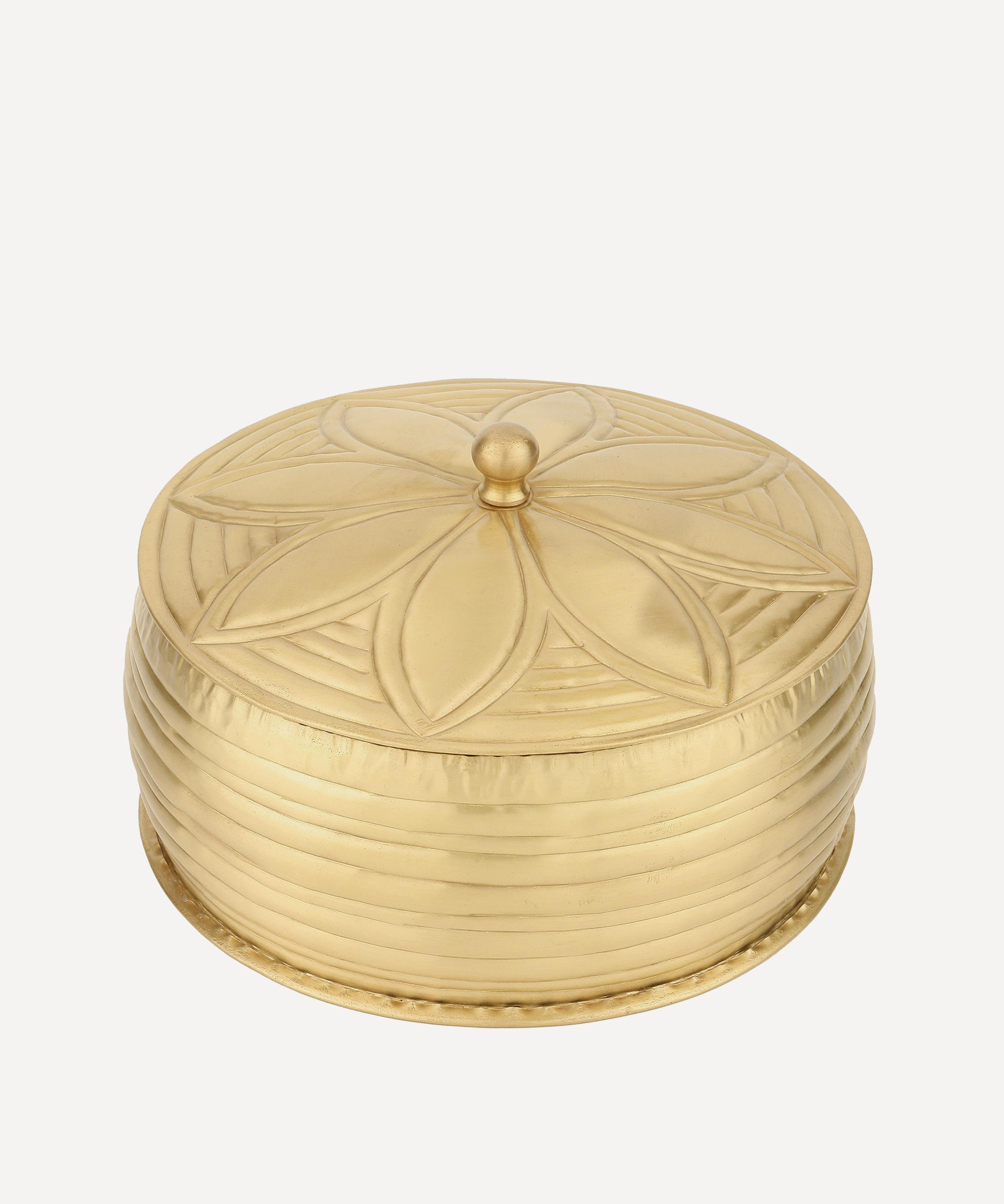 A homeware brand that celebrates the eclectic landscape of a lived-in home, this box features a geometric floral motif to the top, constructed entirely from brass for a luxe finish - perfect as a pocket-emptier in your interior spaces.About Caravane