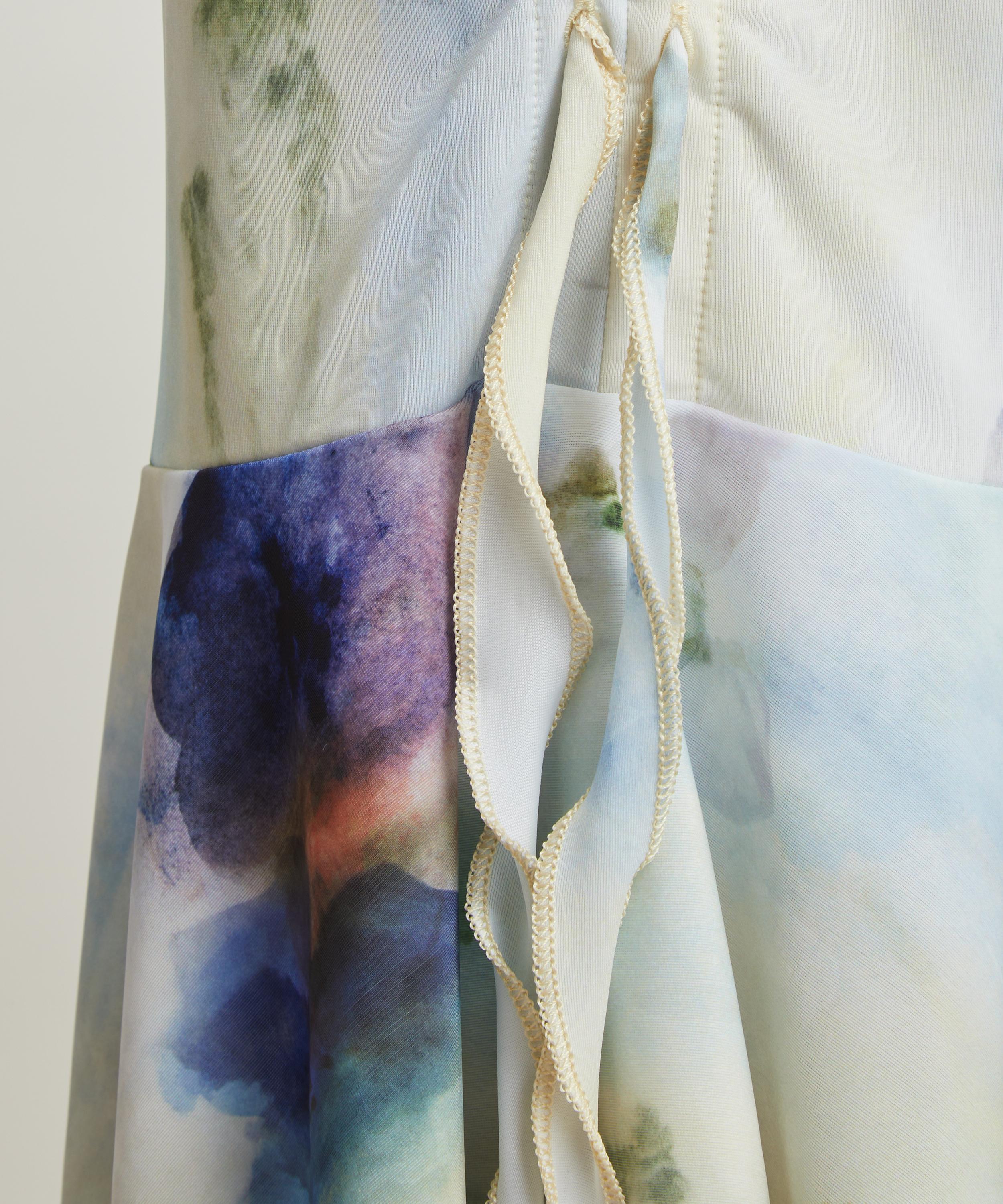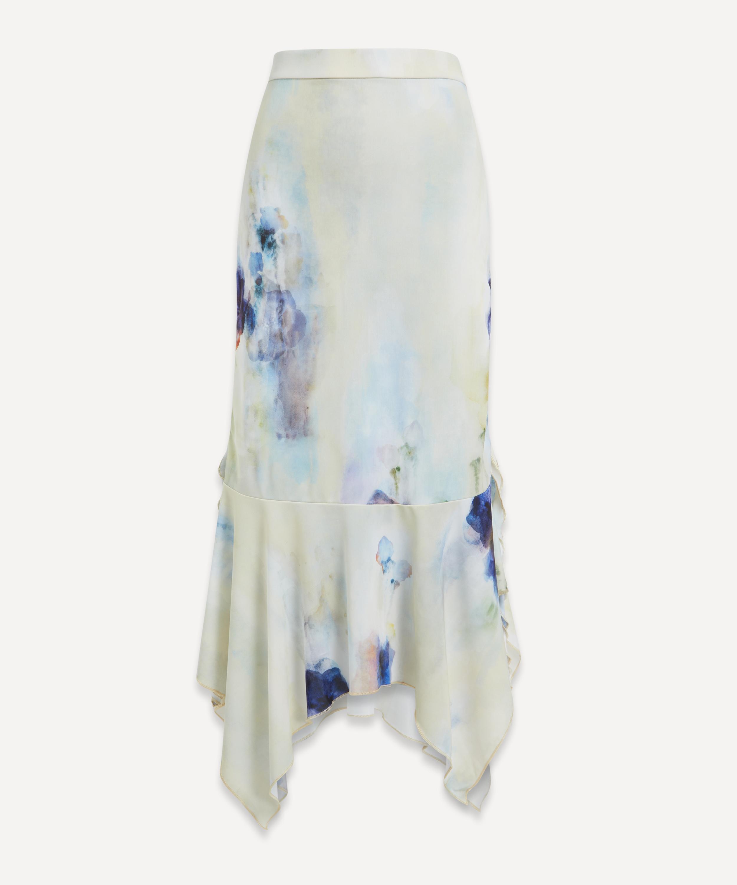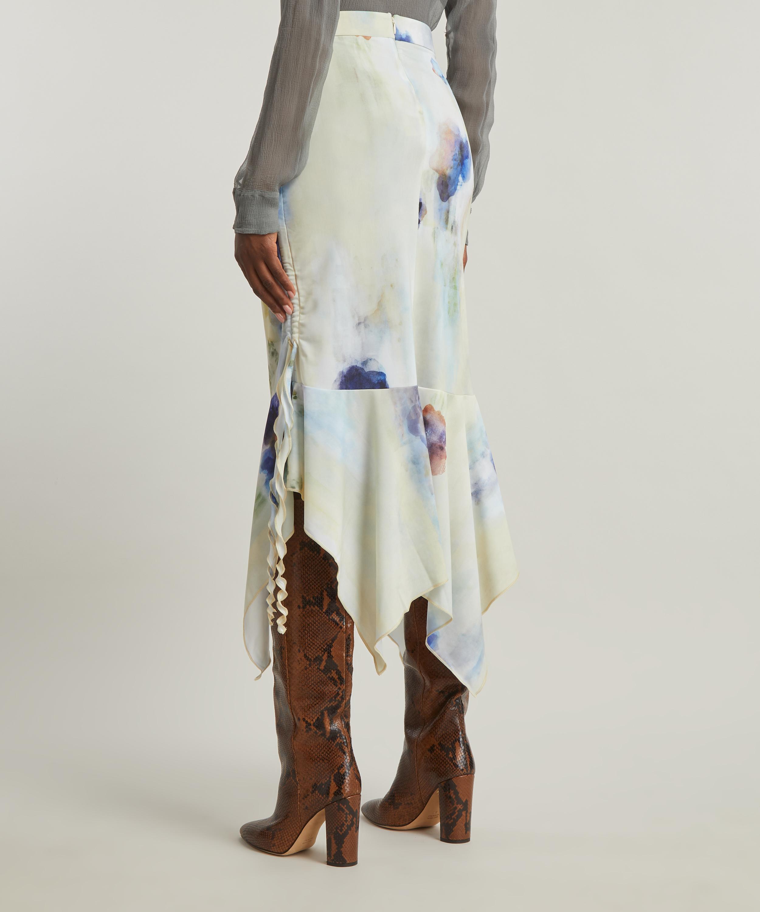 Adorned all-over with an abstract, blotted blue print, this fluttery mid-length skirt features an asymmetric hem and is detailed with adjustable tie-up details on each side.