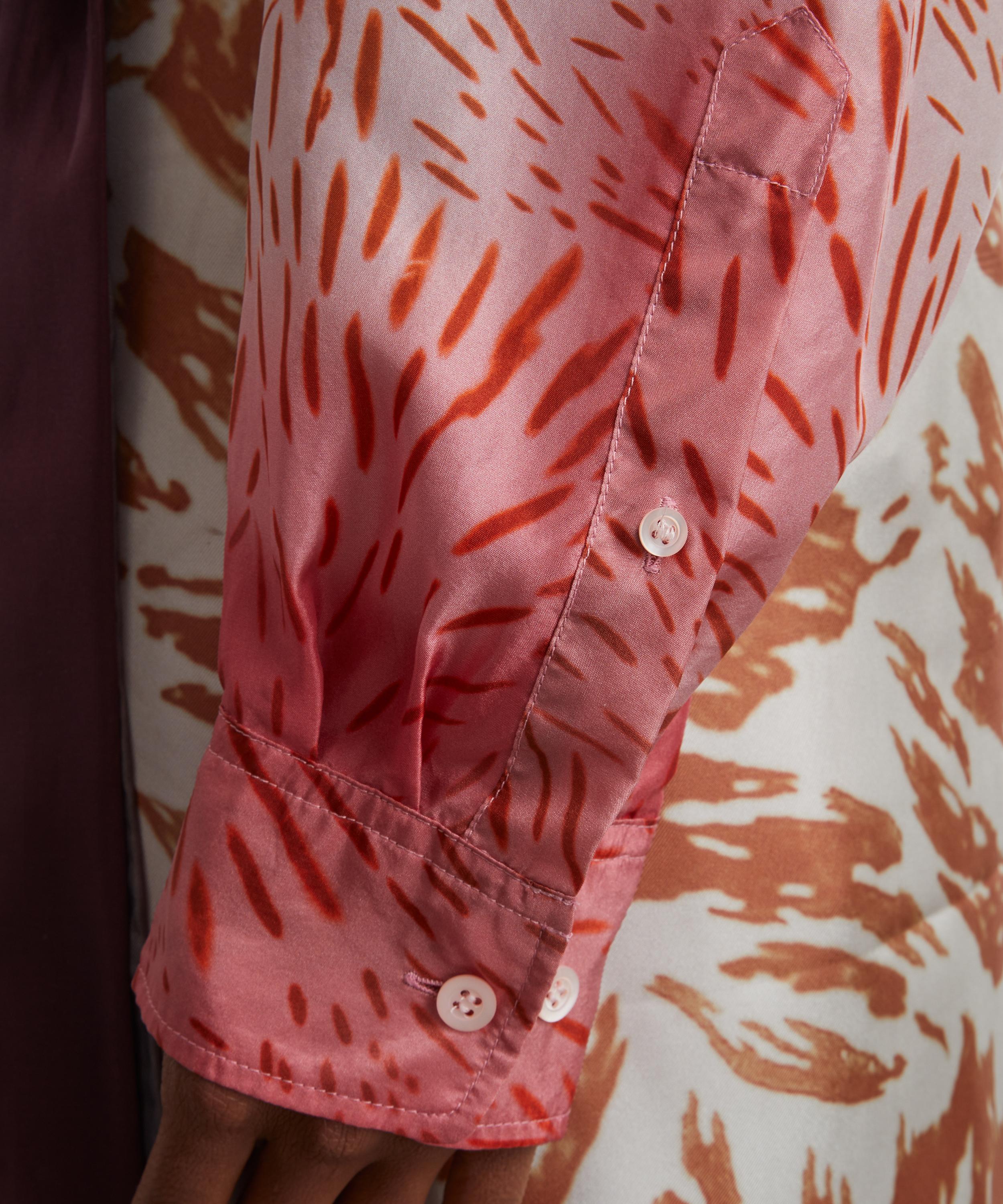 Crafted from pure silk adorned with an abstract pink pattern, this oversized shirt features dropped shoulders, long balloon sleeves, and a front button fastening.