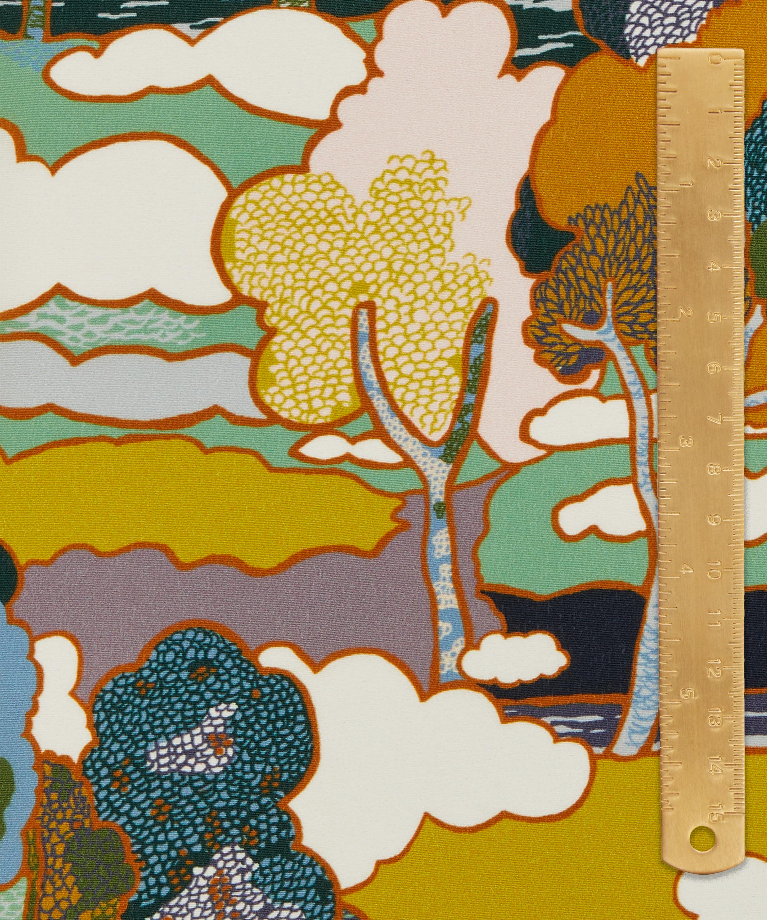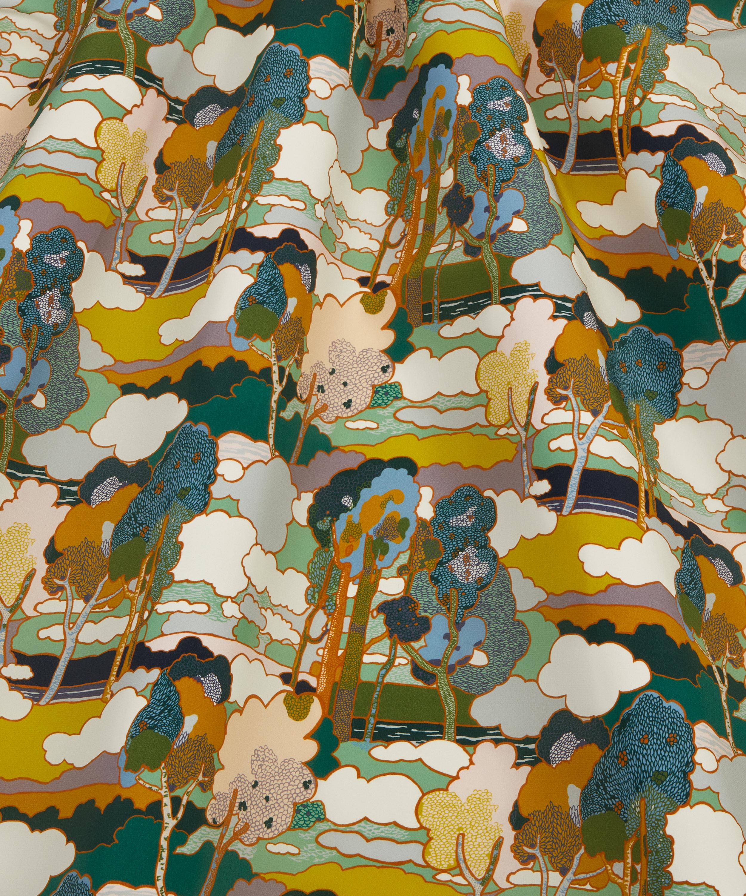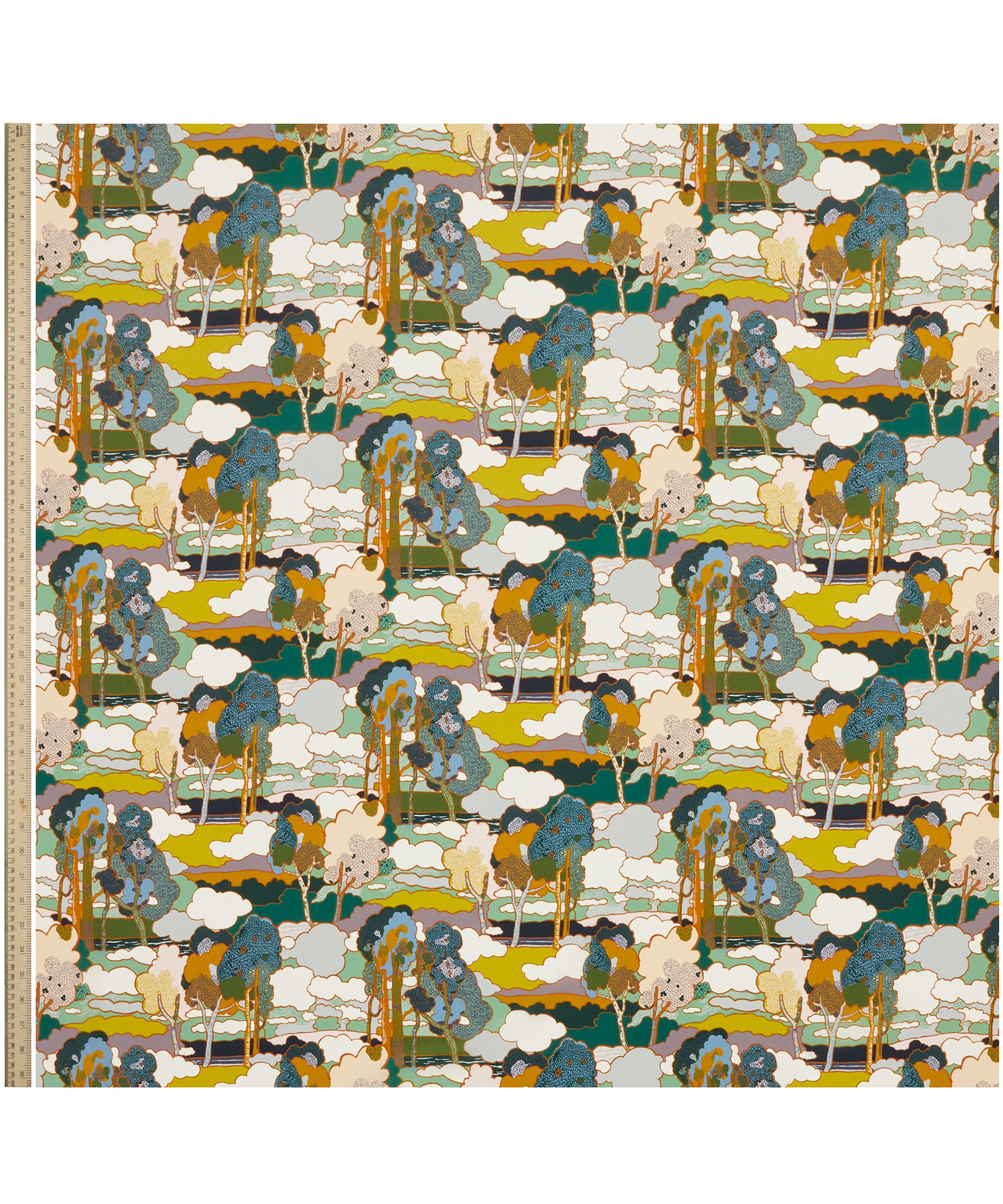 Prospect Road is an archival classic, based on a Liberty design from 1968. A revival of traditional Art Nouveau landscape prints, it features subtly arranged clusters of trees in a dreamy, jewel-toned setting.