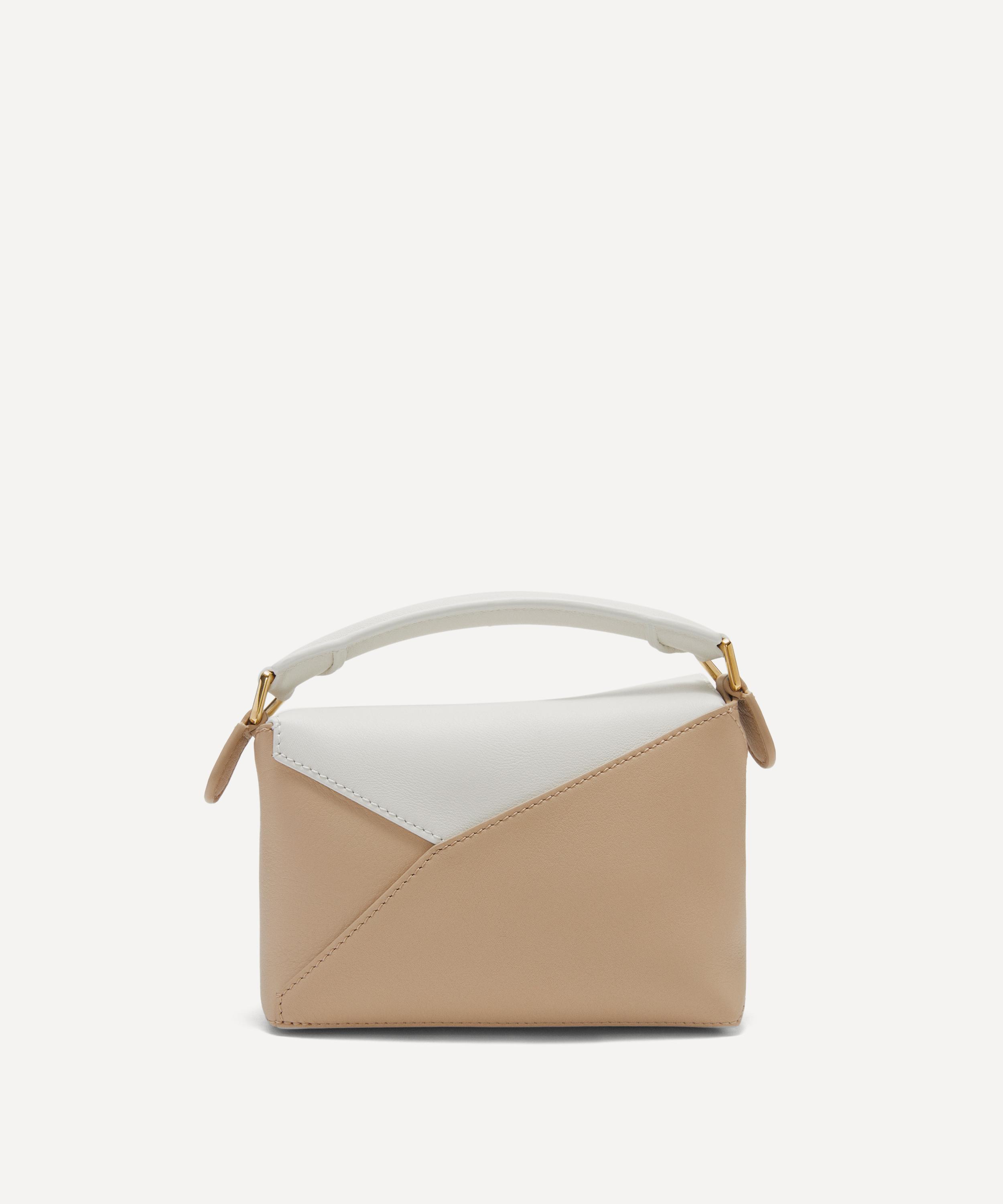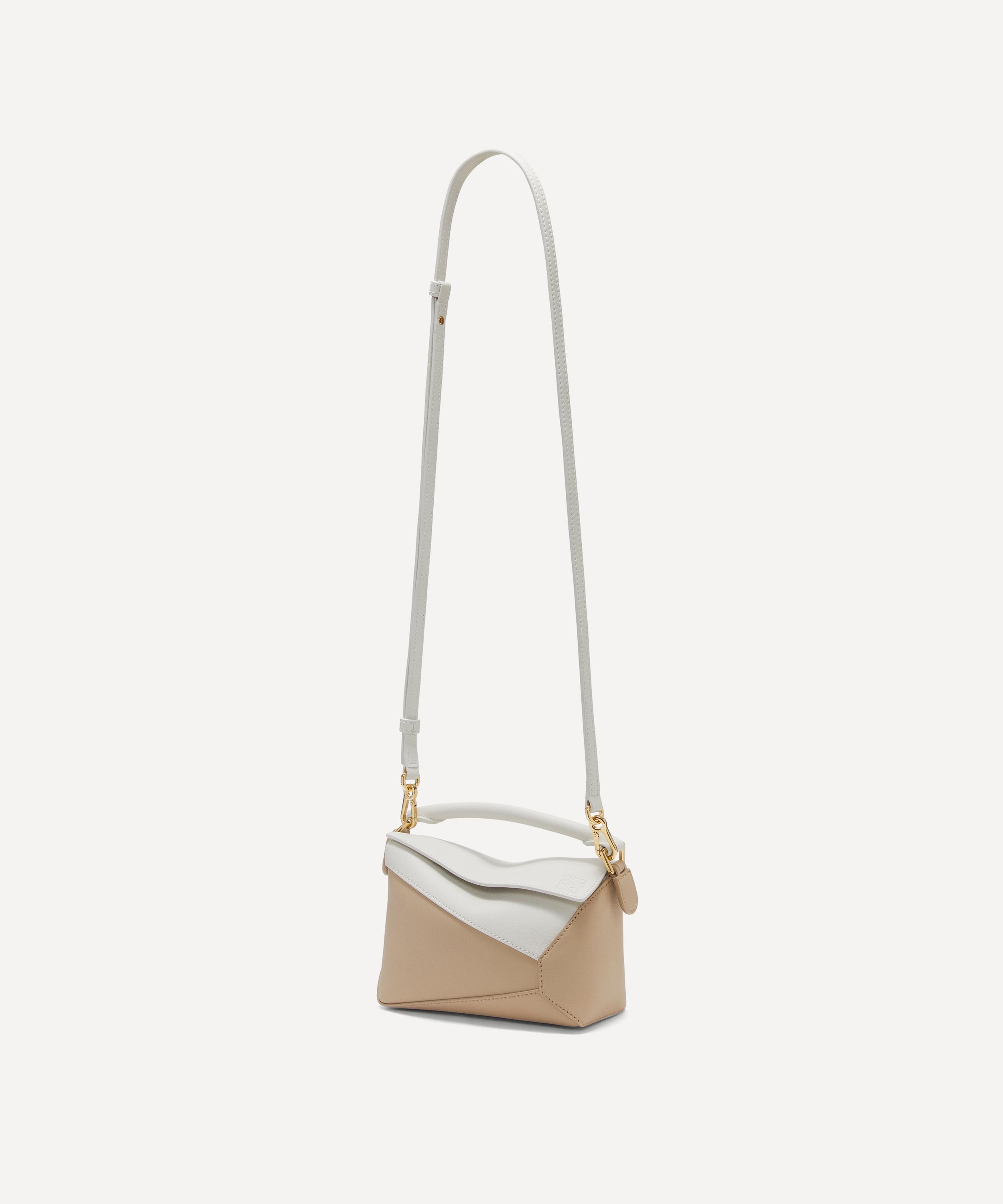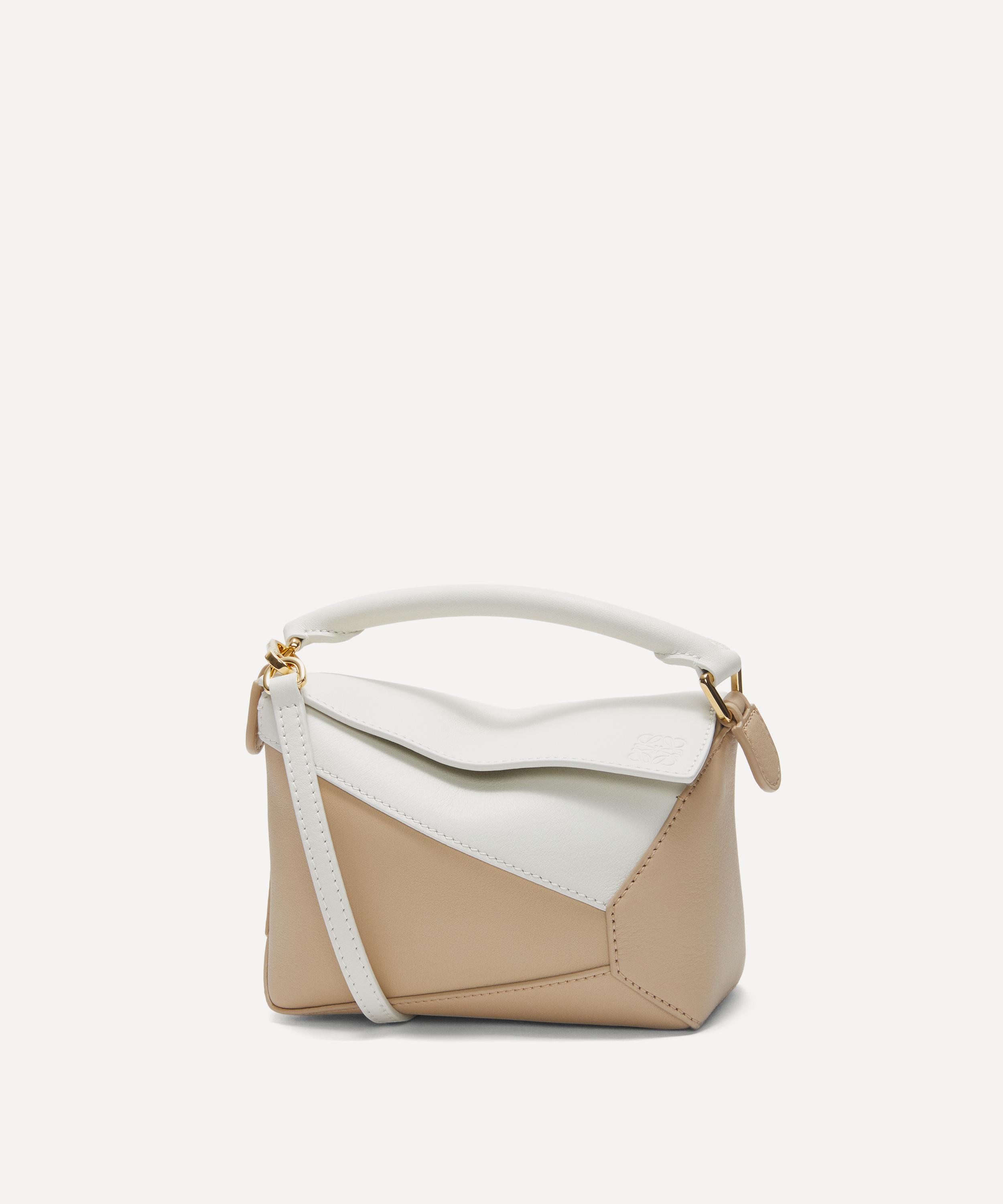 Cut from soft calfskin leather, this mini bicolour rendition of Loewe's Puzzle bag is characterised by the same boxy cuboid silhouette that can be folded in several different ways thanks to the precisely cut geometric panels across the exterior. The design is fitted with a spacious main compartment that can hold a small vertical wallet, most mobile phones, and sunglasses case, while the brand's distinctive Anagram logo is debossed at the front. Complete with a top handle and a detachable shoulder strap, it can be worn across the body, over the shoulder or even folded down flat for an artful alternative to your usual clutch bag.