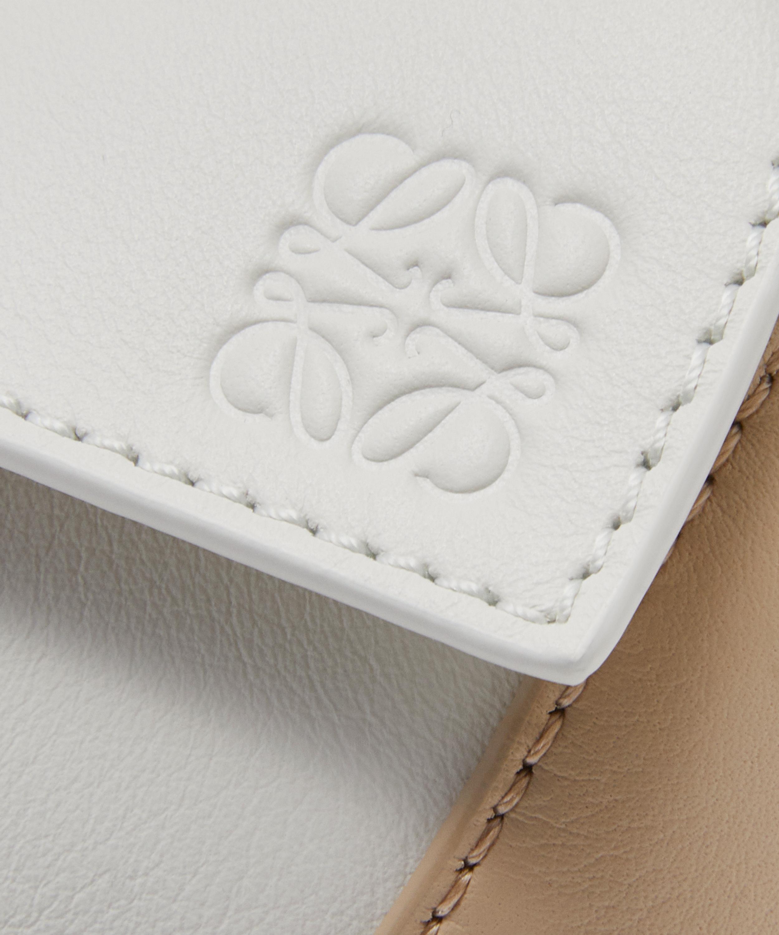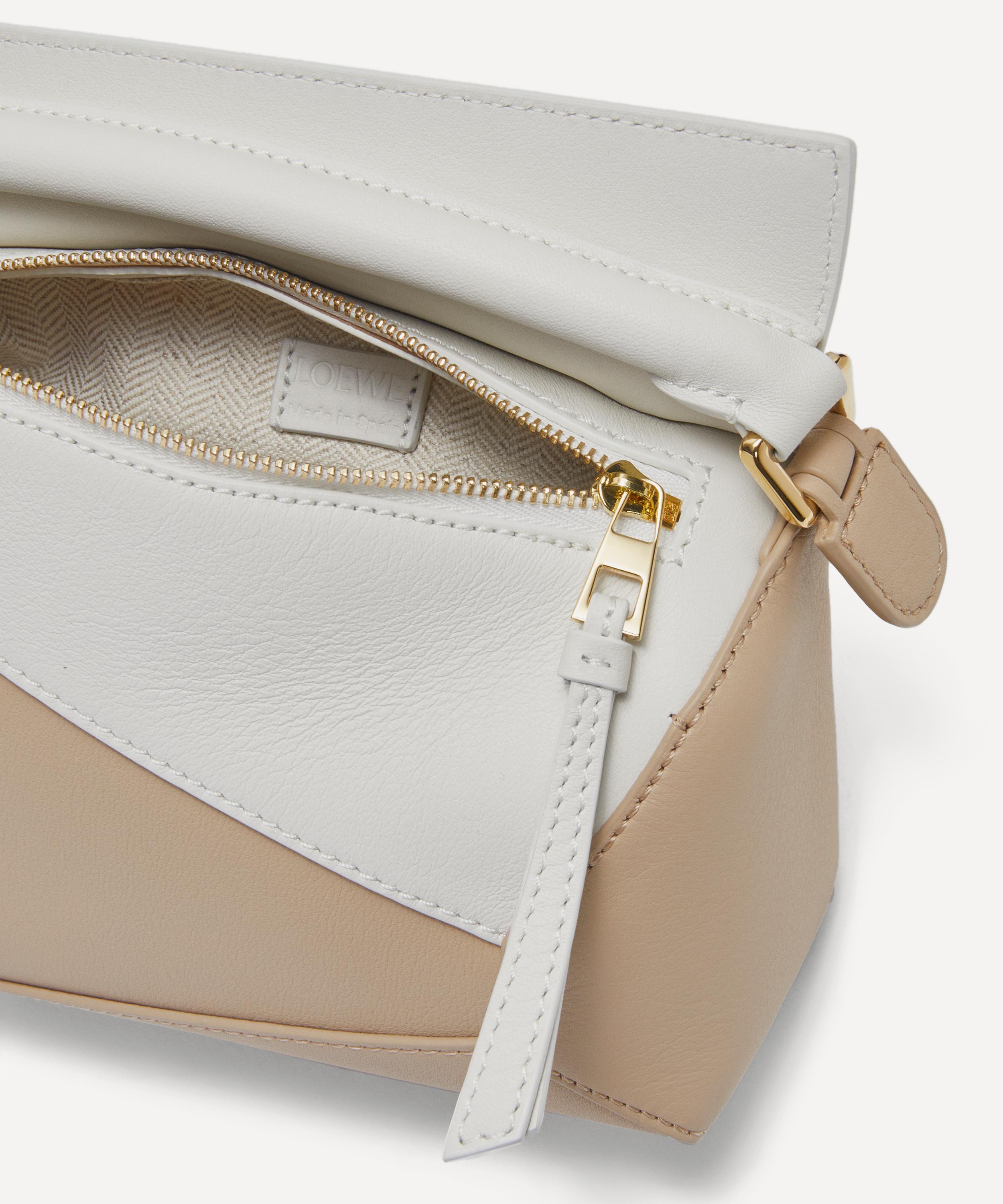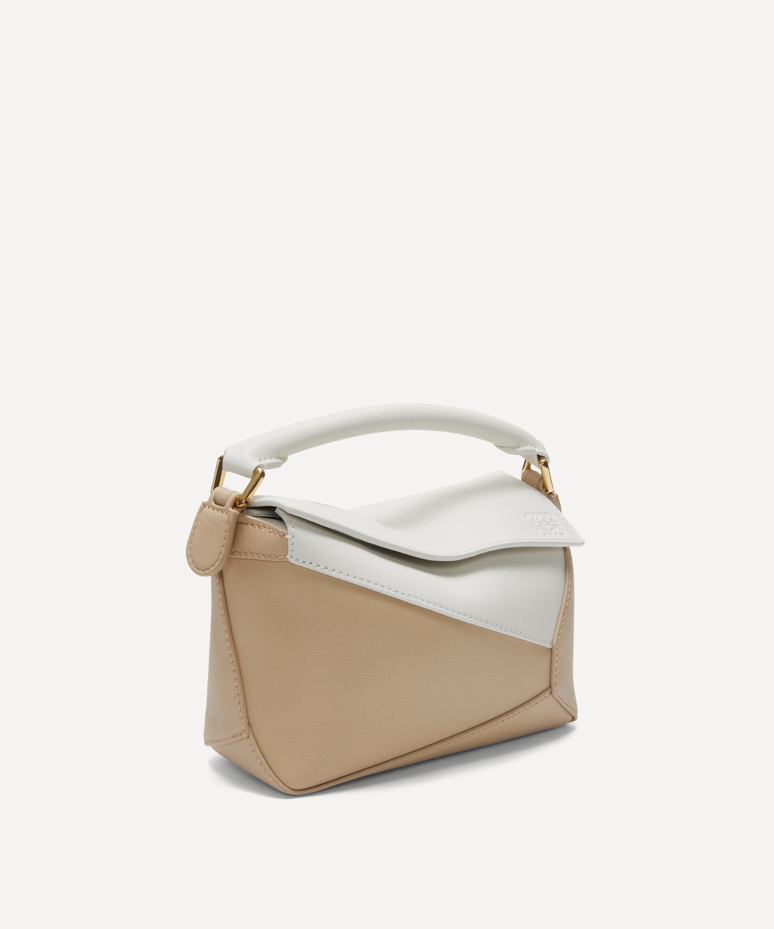 Cut from soft calfskin leather, this mini bicolour rendition of Loewe's Puzzle bag is characterised by the same boxy cuboid silhouette that can be folded in several different ways thanks to the precisely cut geometric panels across the exterior. The design is fitted with a spacious main compartment that can hold a small vertical wallet, most mobile phones, and sunglasses case, while the brand's distinctive Anagram logo is debossed at the front. Complete with a top handle and a detachable shoulder strap, it can be worn across the body, over the shoulder or even folded down flat for an artful alternative to your usual clutch bag.