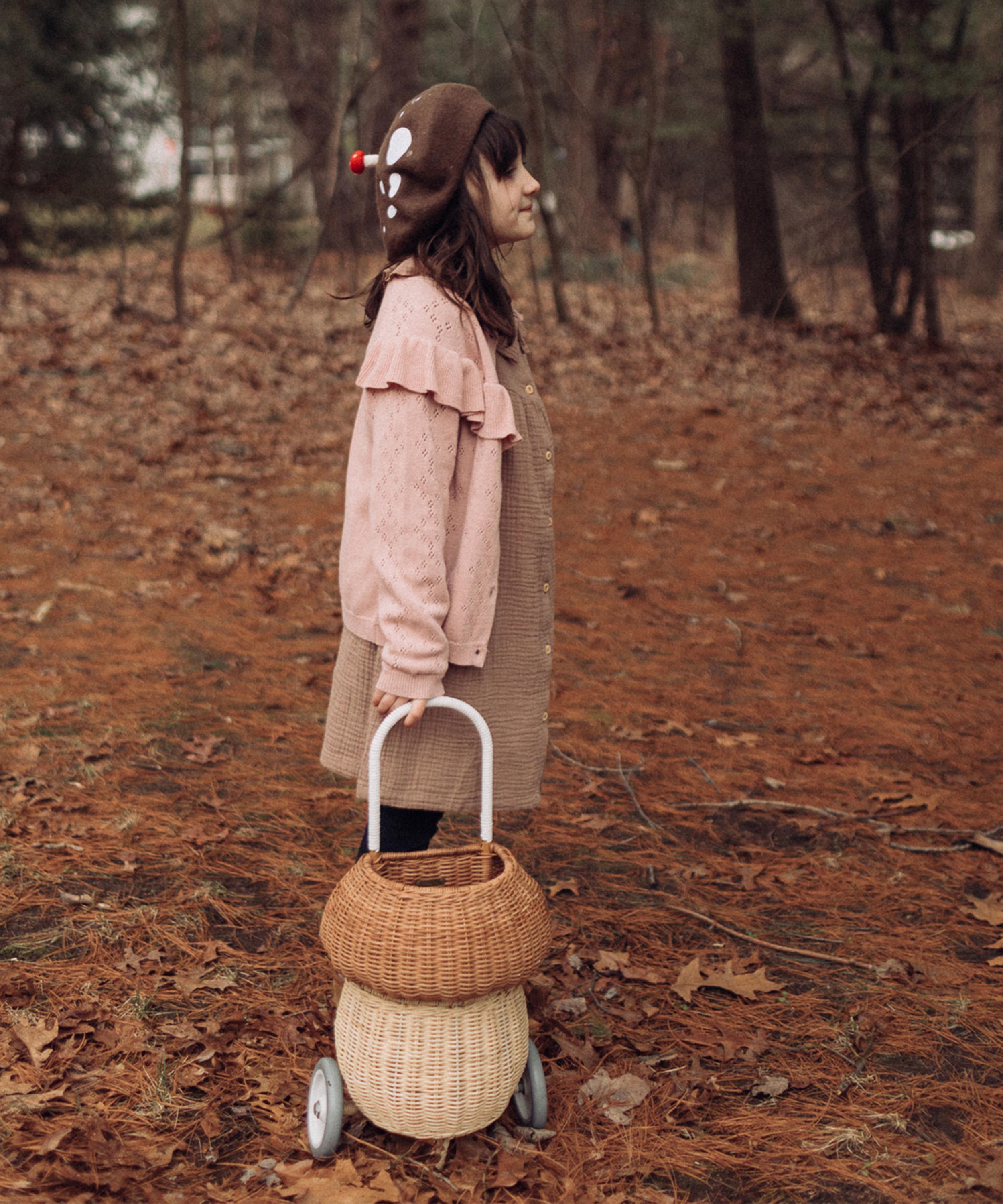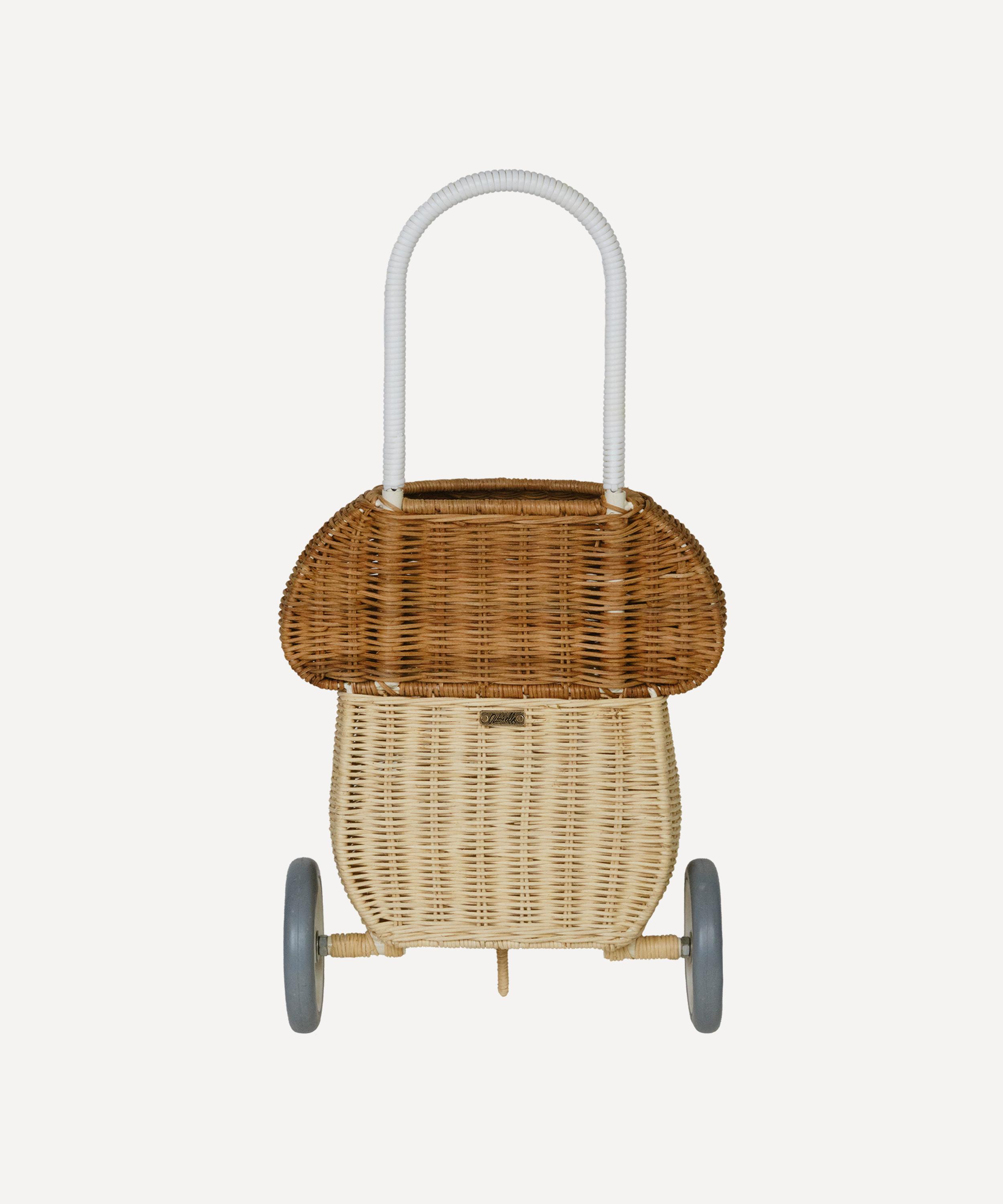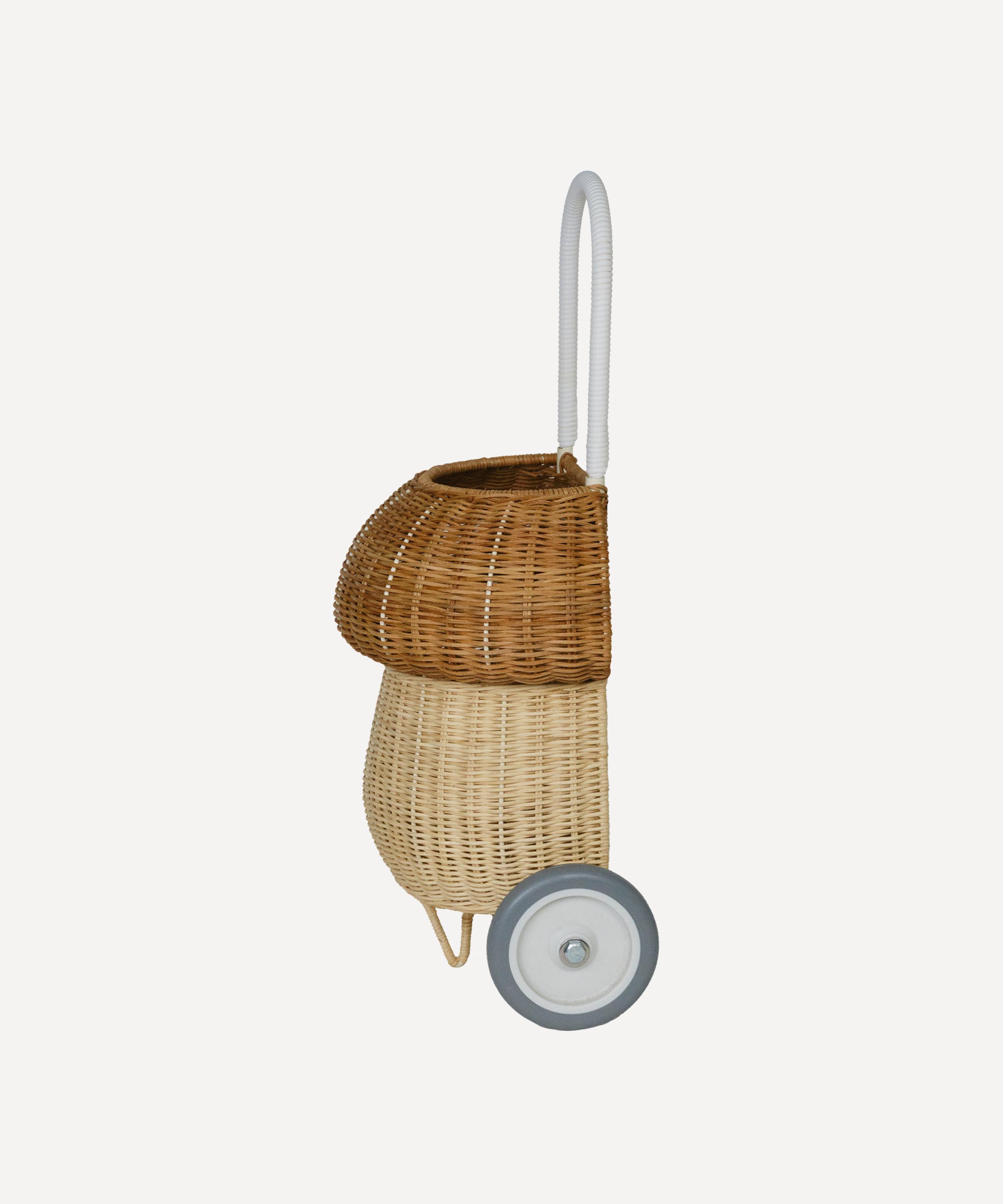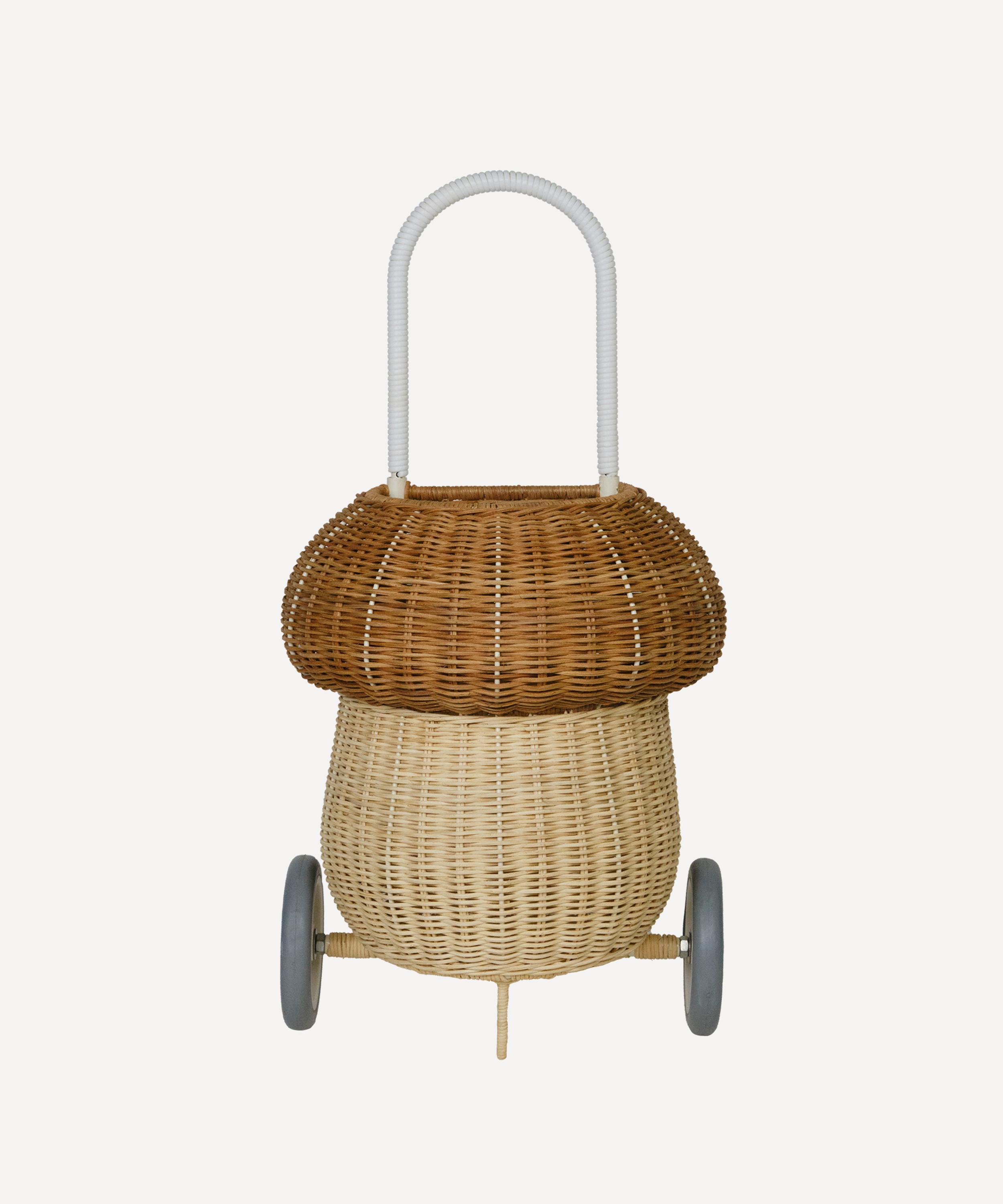 Corral your little one’s toys and treasures with the rattan Mushroom House Luggy Basket Trolly from Olli Ella.