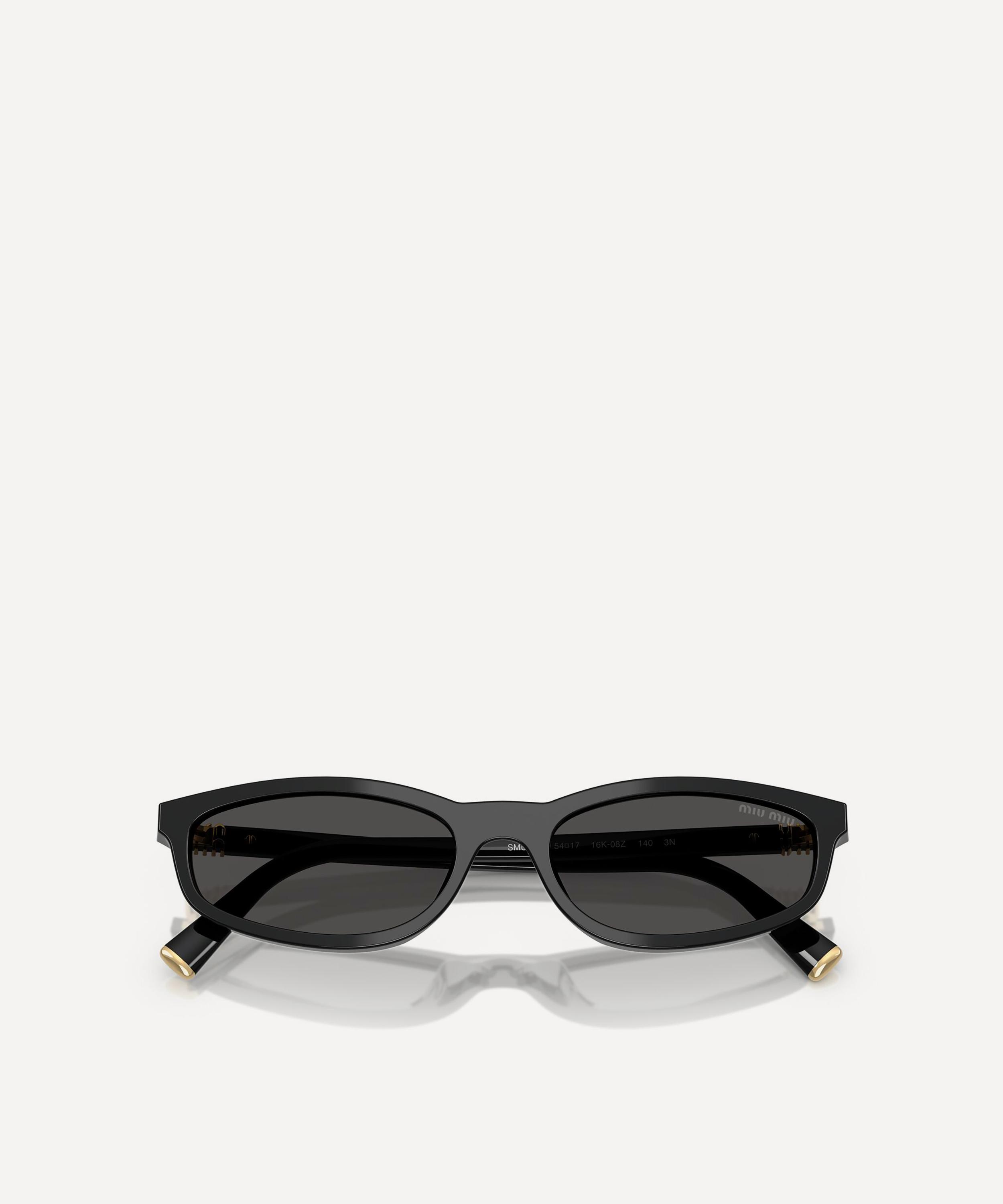 Heighten the impact of any attire with these rectangle sunglasses from Miu Miu. Expertly crafted from black acetate, to create a statement pair that instantly draws the eye, these narrow sunnies are fitted with a comfortable saddle nose bridge and grey-tinted lenses to shade and protect your eyes from UV light. Complete with the signature branding at the temples, they make for an ultra-chic finish to your curated looks.