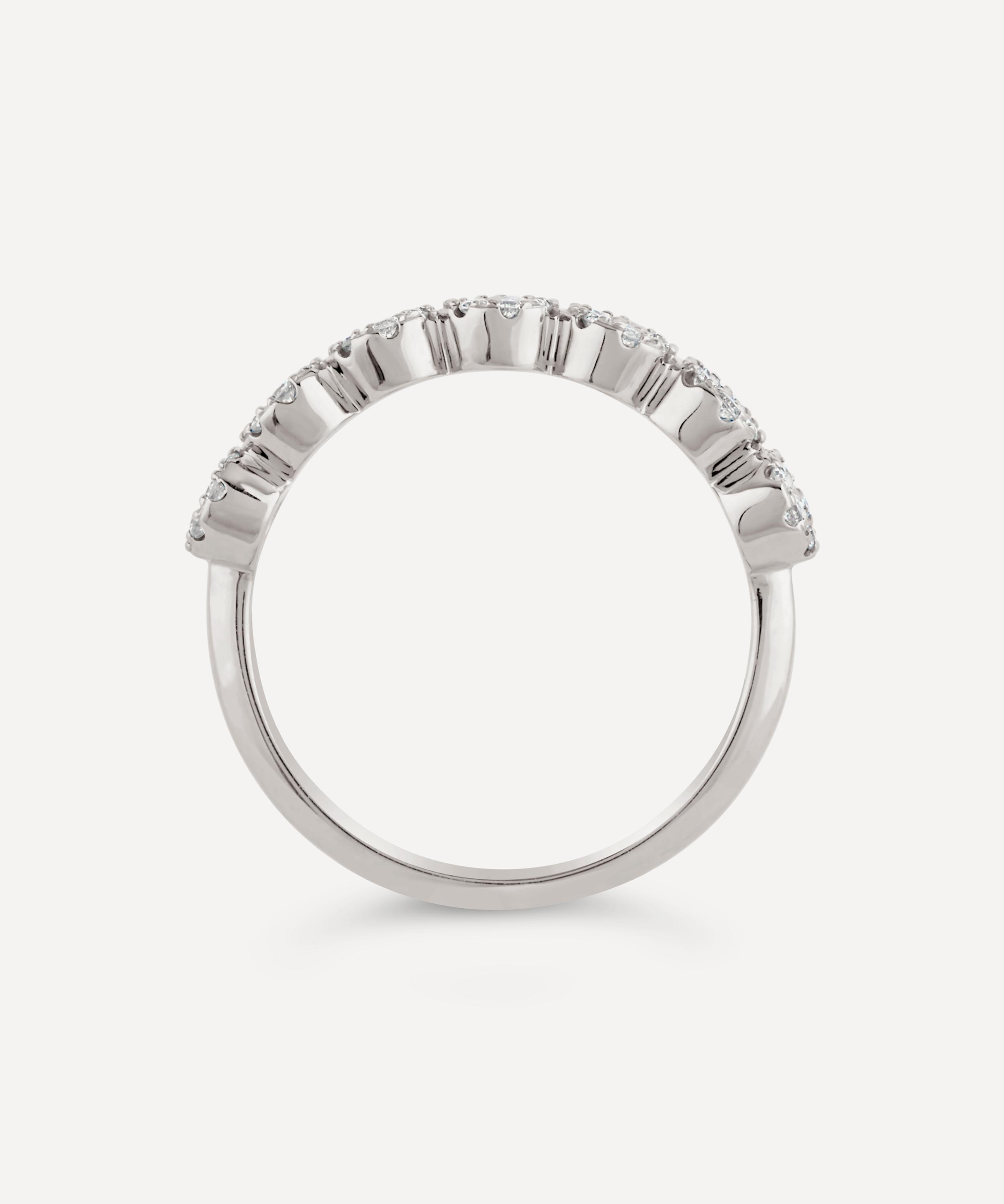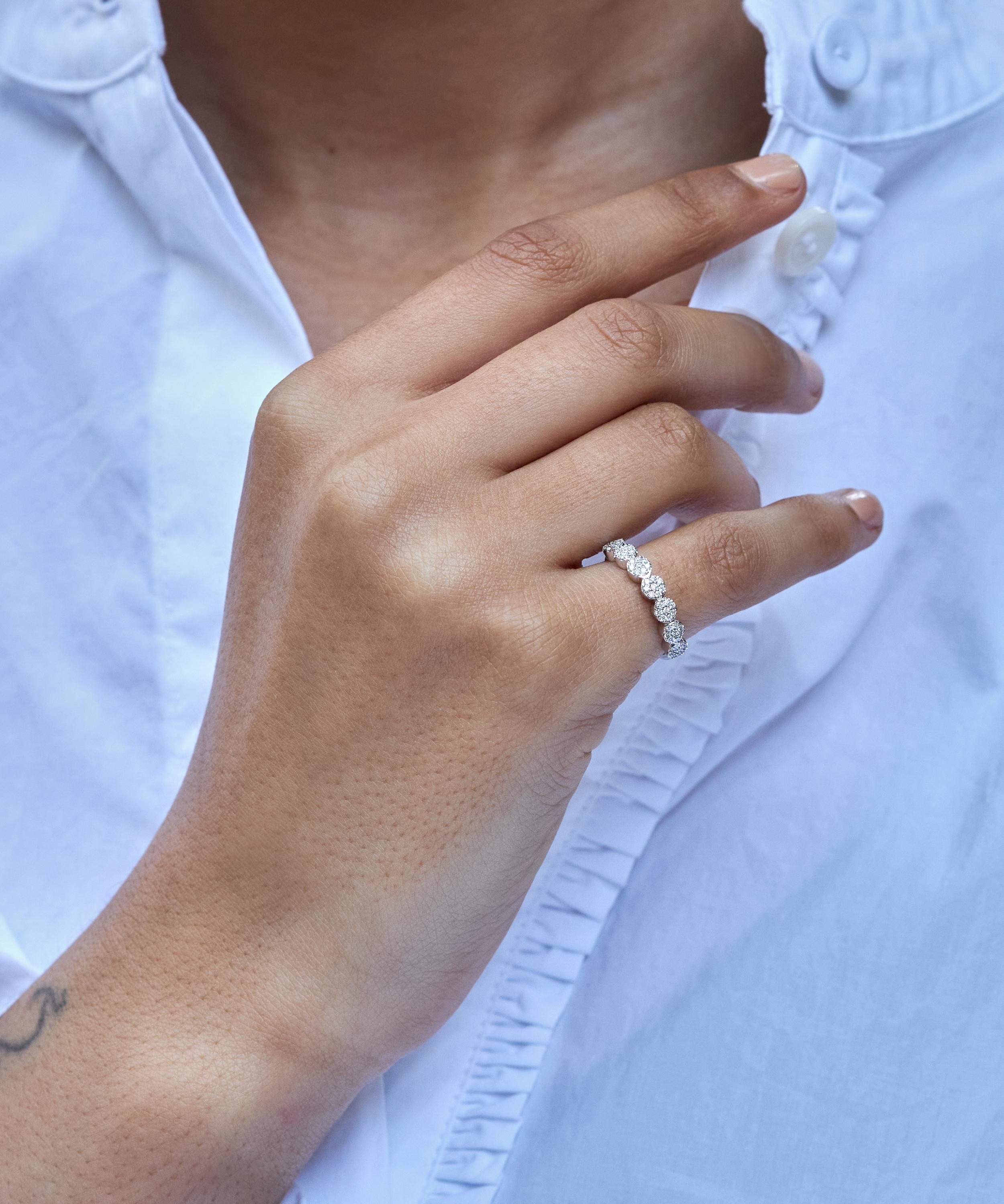 Exemplifying the brand’s expert use of recycled metals, this diamond pinky ring from Dinny Hall sparkles with minimalistic elegance. Crafted in 9ct recycled white gold, this ring features a slim, high-polished band adorned with flower-like mount settings, covering half of the band, fitted with fifty-six created diamonds. It styles beautifully on the pinky alone, or stacked with any other rings as part of a brightly-coloured curation.