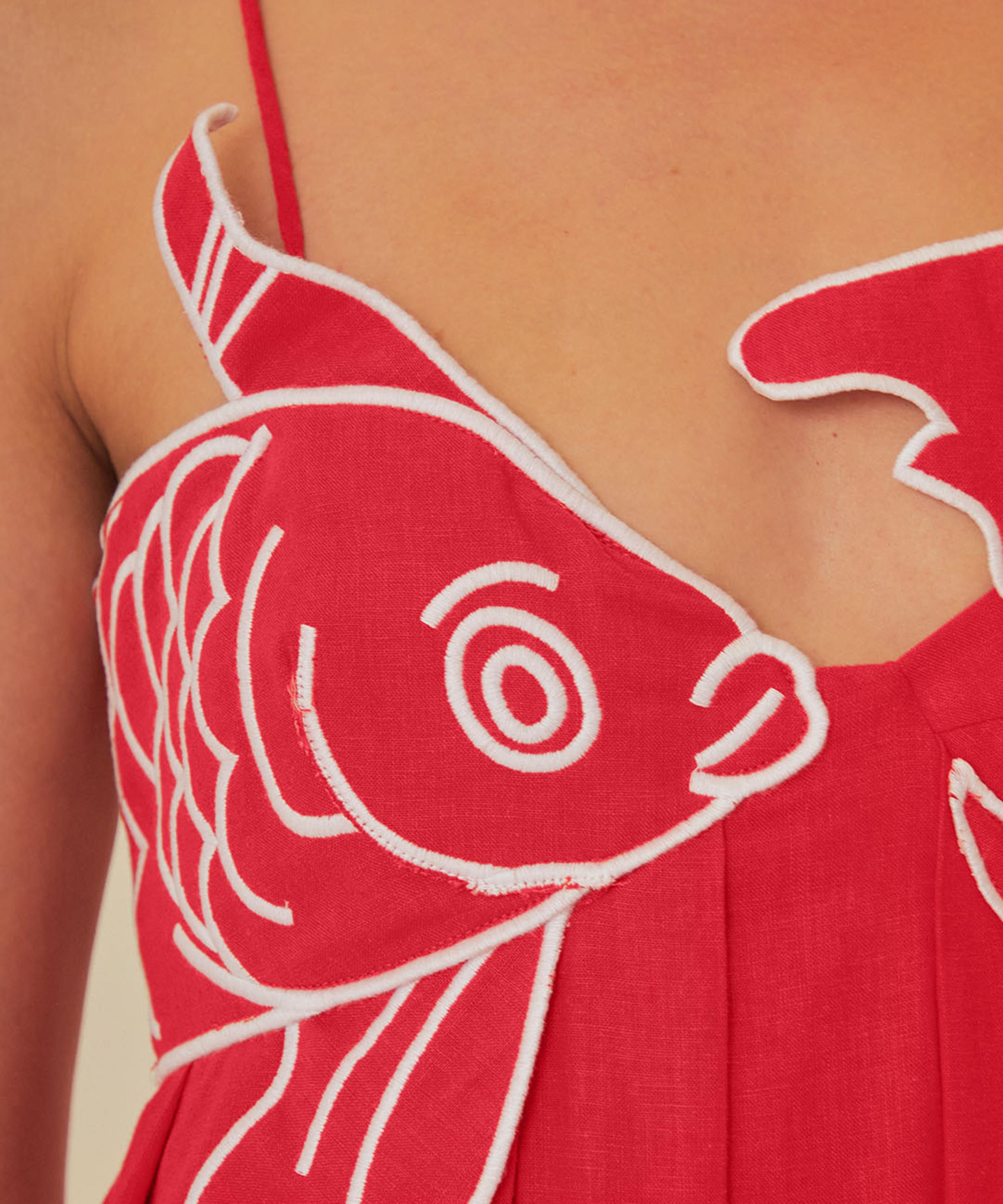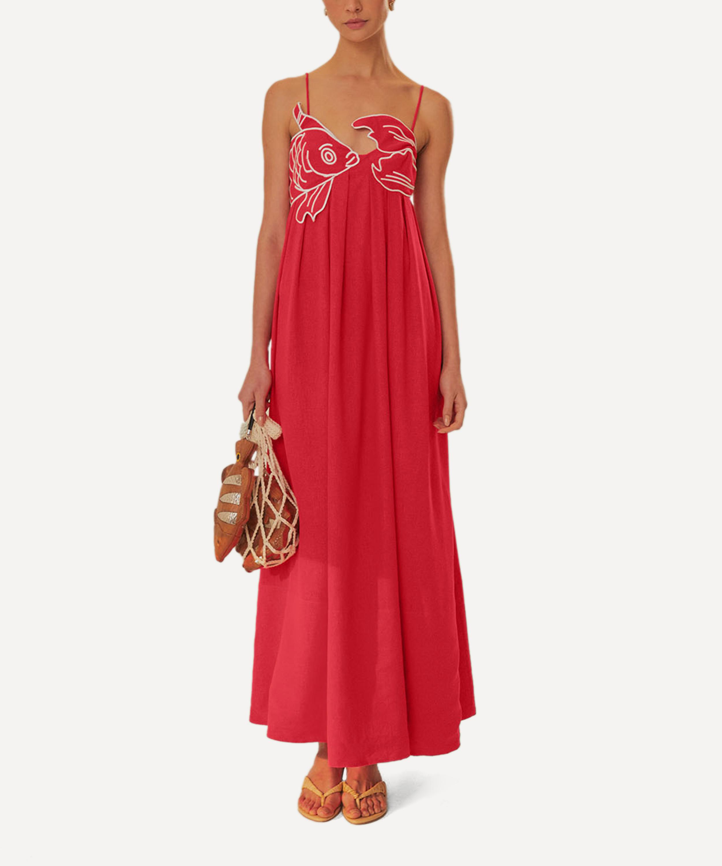 Discover the playful elegance of the Red Fish Top Maxi Dress, where vibrant red hues meet asymmetric charm. This FARM Rio creation features whimsical fish embroidery, capturing the spirit of the tropics. With its flowing silhouette and unique neckline, the linen blend dress offers a breezy yet refined look for effortless style.