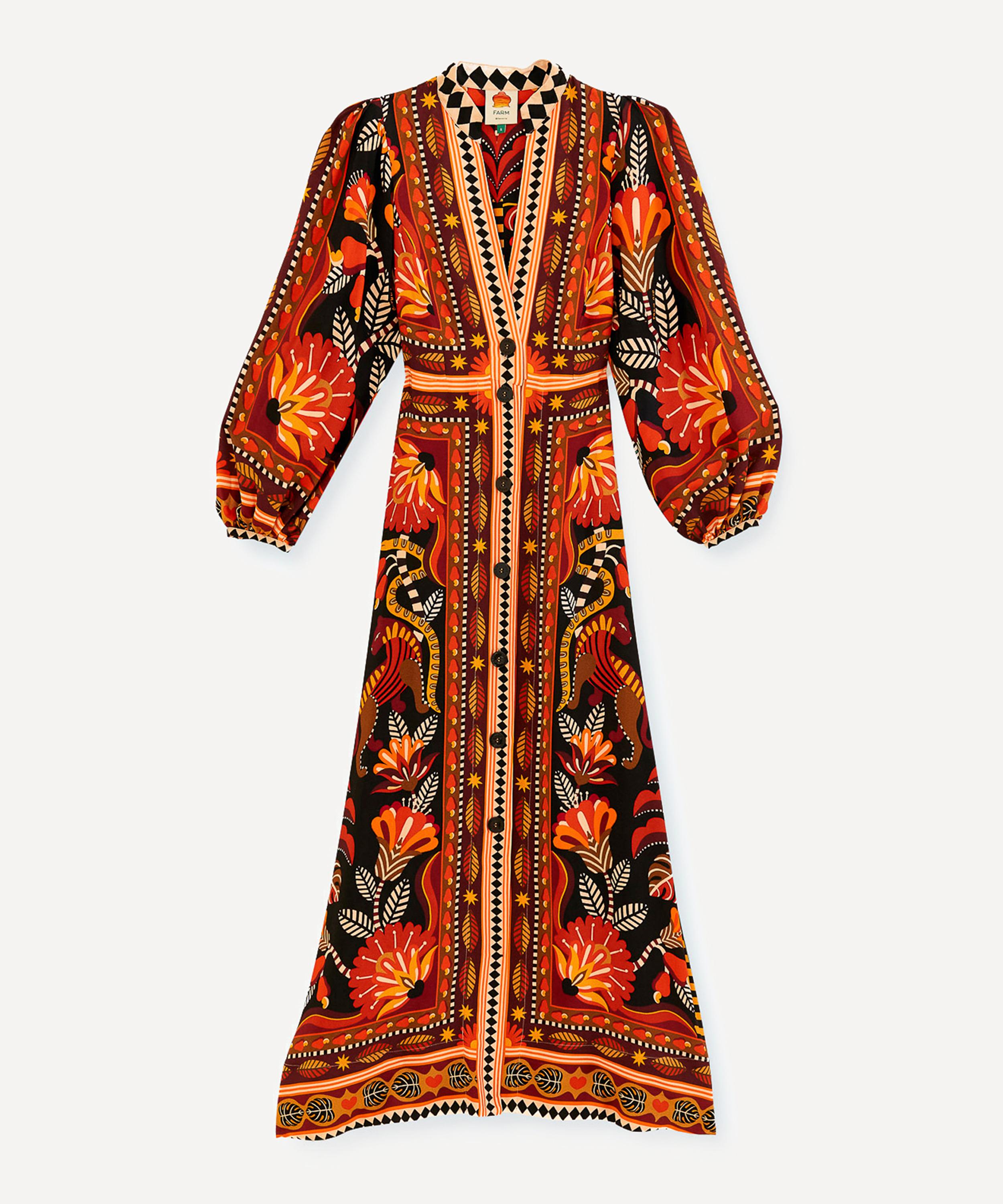 Adorned all-over in the bold and blooming Red Nature Beauty Scarf print, this statement maxi-dress is defined by its plunging V-neckline. Ideal for winter with its long blouson sleeves, its centre front button closure falls to a flowy, ankle-grazing hem.