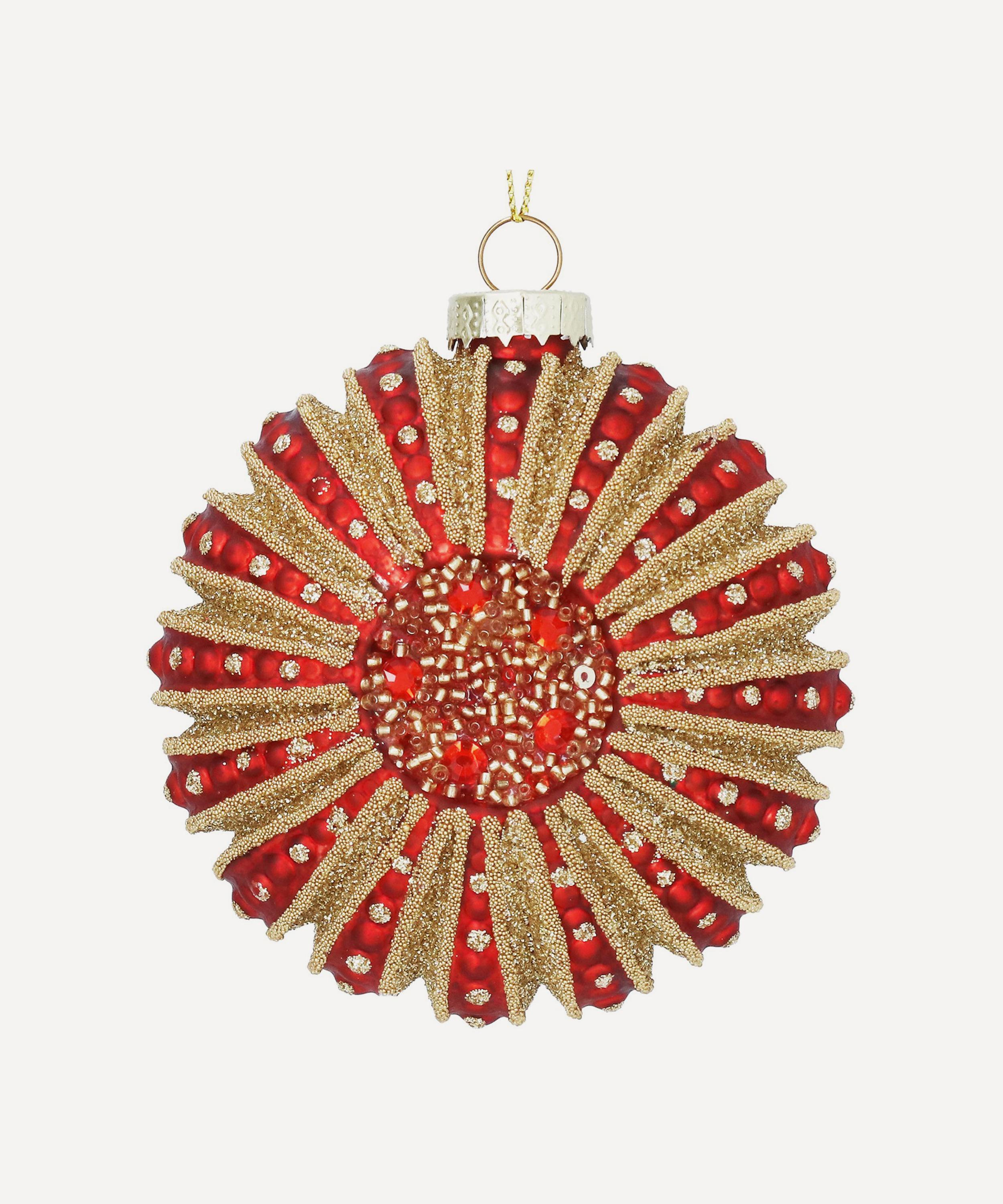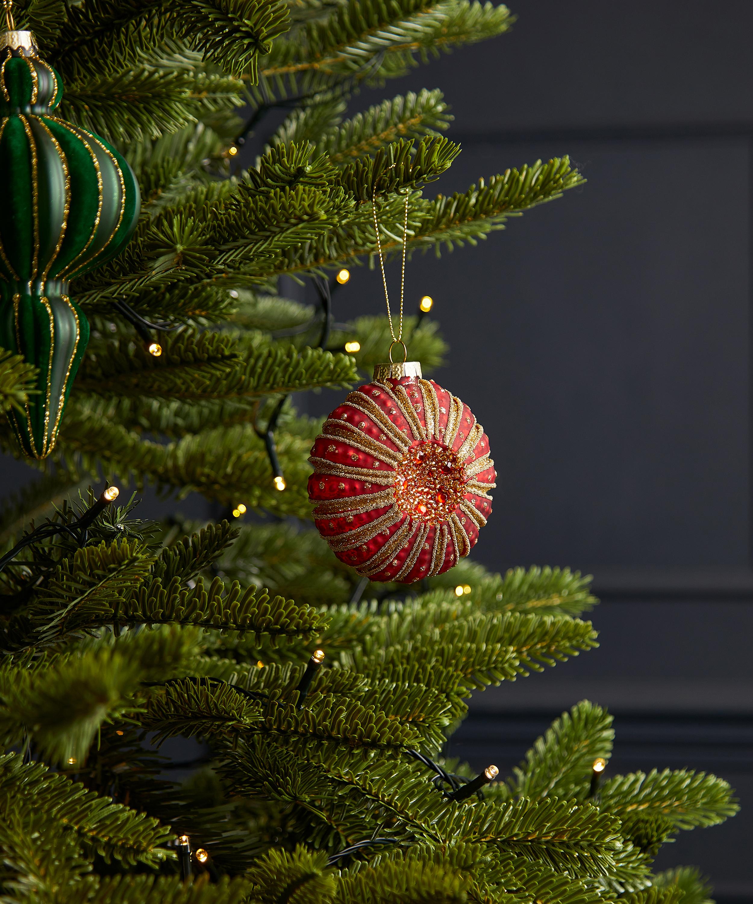 It’s crafted from glass and showcases a disc comprised of alluring red and gold stripes with a glittered finish that harmonises with your fairy lights, lending a contemporary feel to traditional designs and motifs. Work them into your assortment of baubles and adornments to add further sparkle to your seasonal décor.