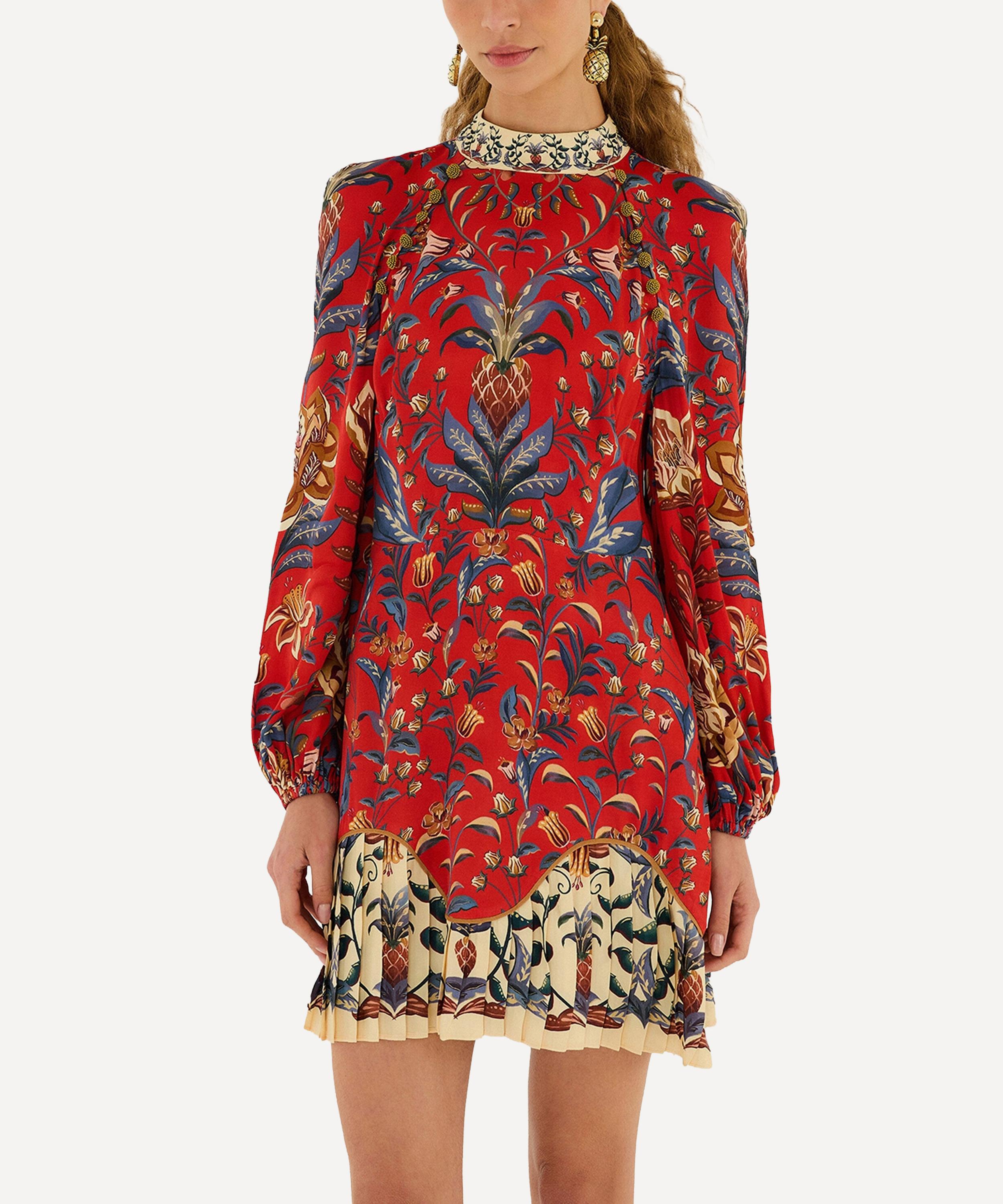 Embrace bold elegance in the Red Winter Breeze mini dress, featuring rich red and earth tones, blooming botanical motifs. A high neckline and voluminous balloon sleeves meet a contrast pleated hem that sways with every step – luxury with a gentle, playful touch.