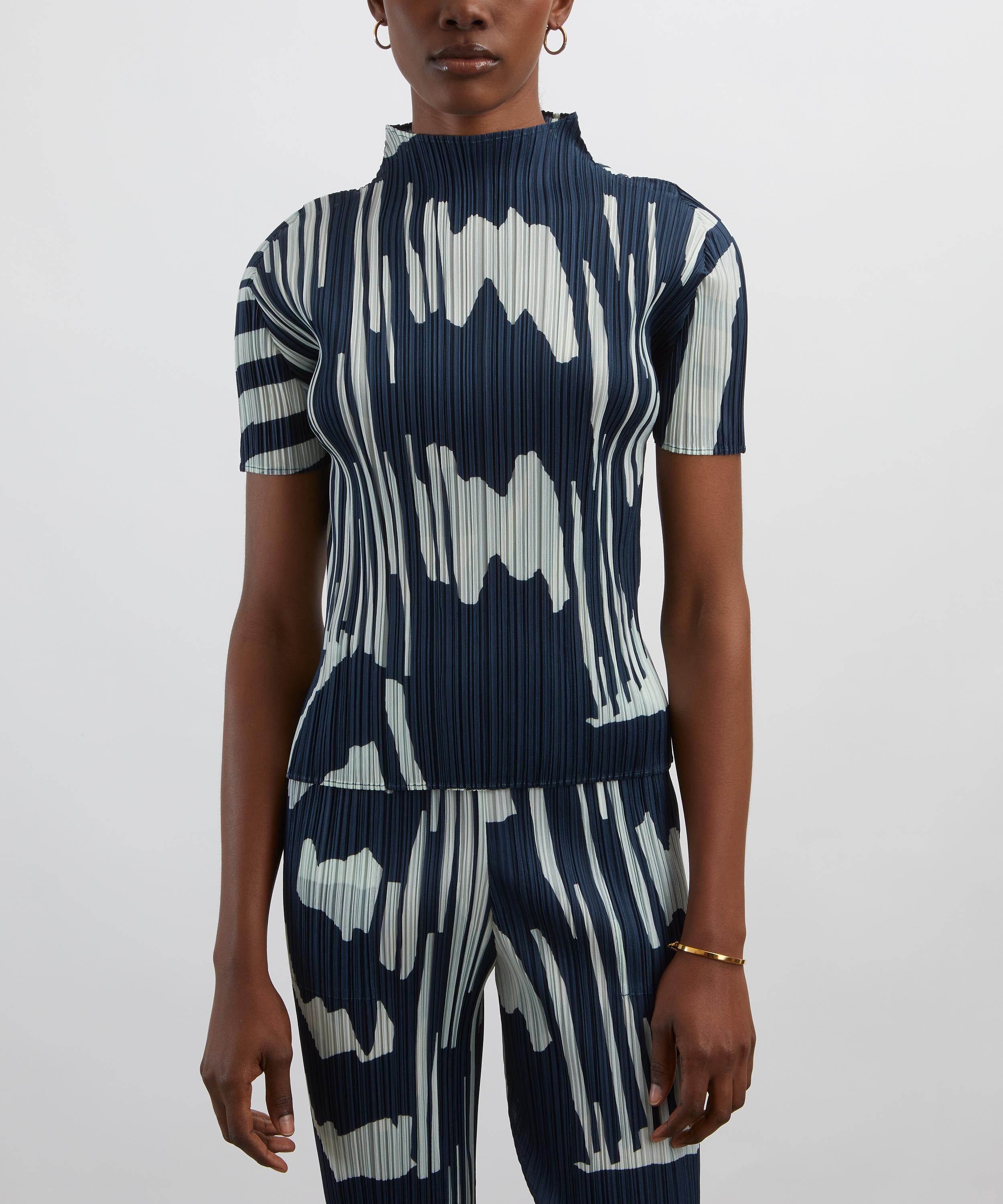 Part of the REFRACTION collection, which features dynamic prints inspired by light reflected on the surface of water, this pleated top has short sleeves and a mock neckline, creating a bold and contemporary silhouette.