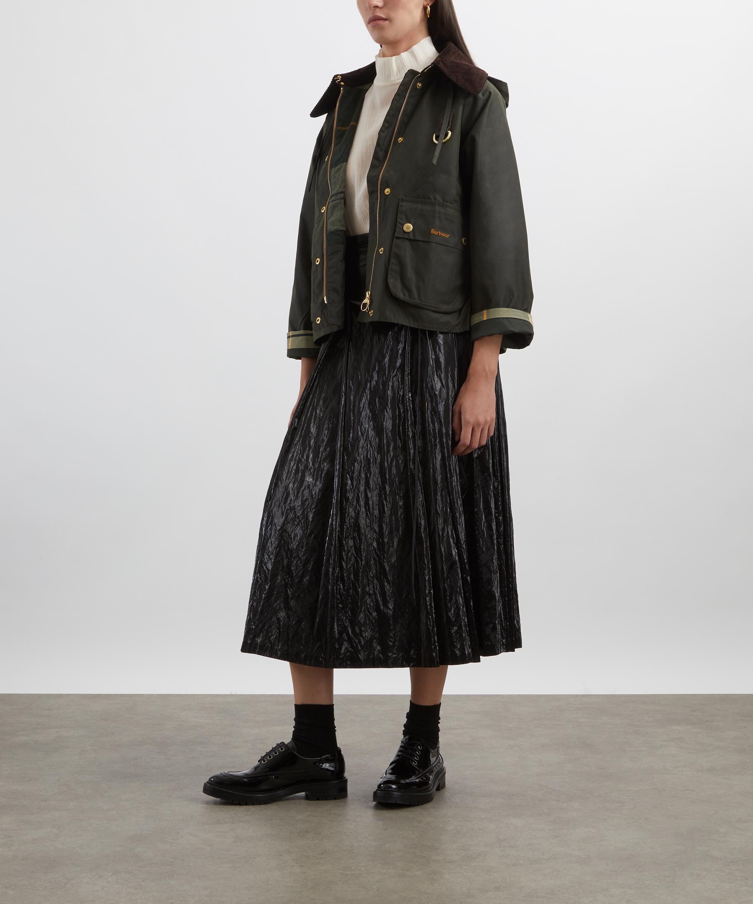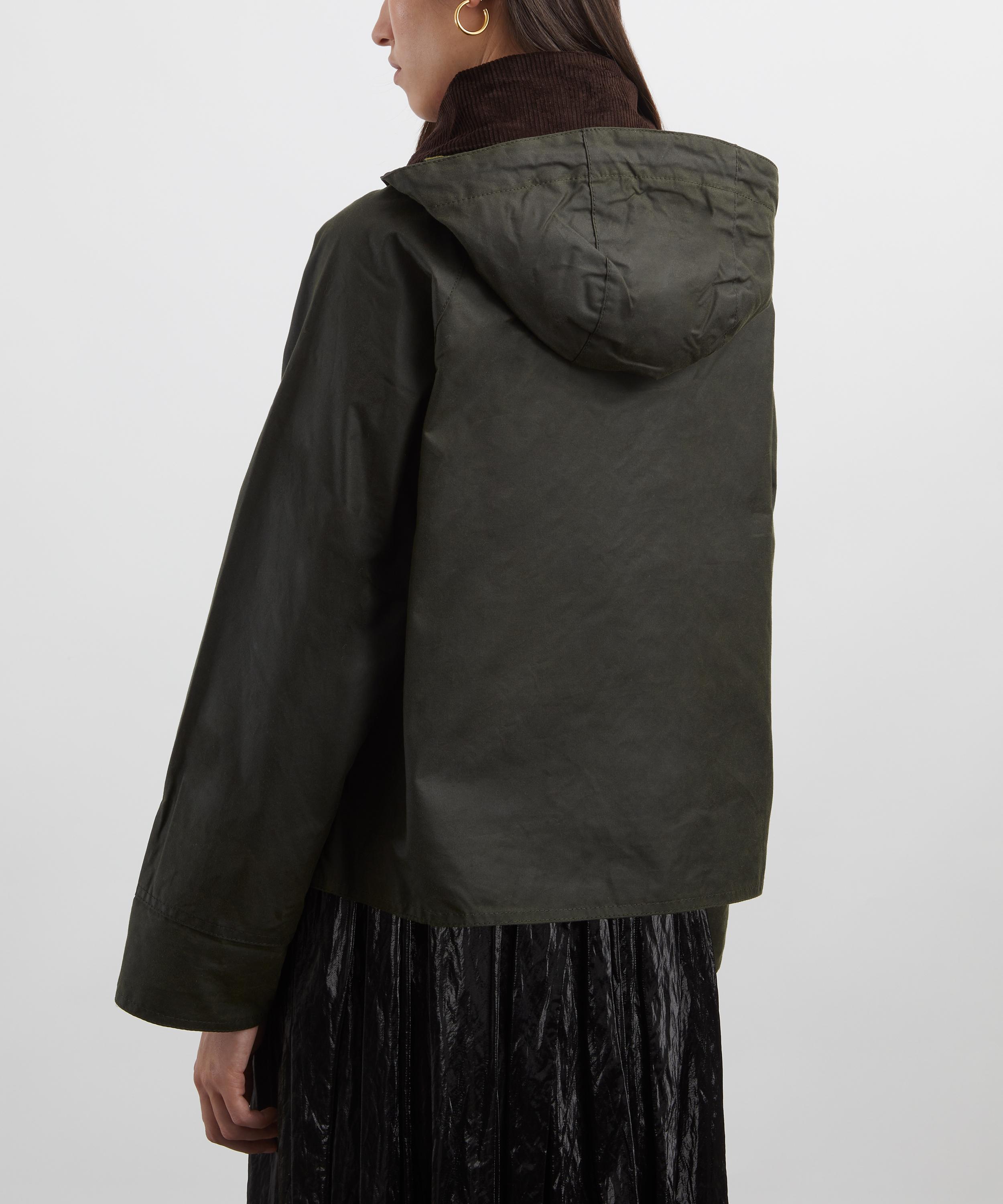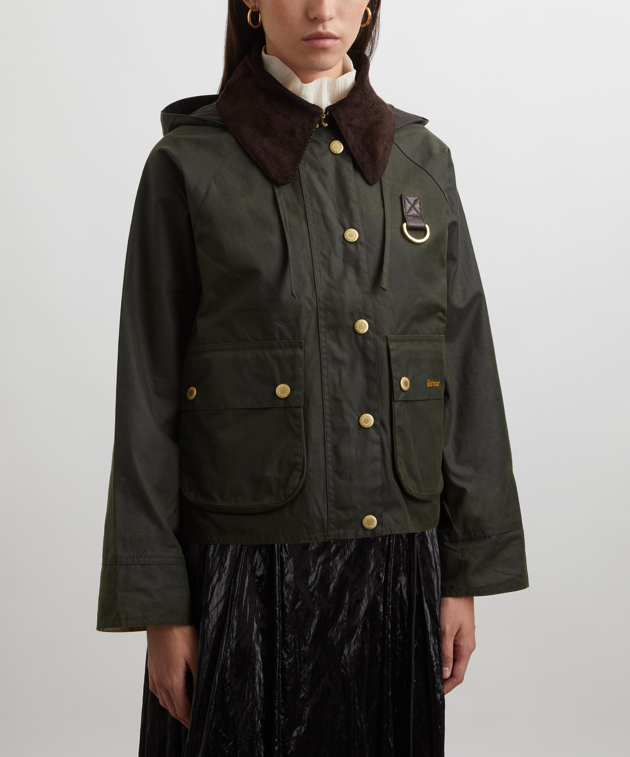 Inspired by the iconic archive Spey Waxed Jacket, the Barbour Reighton Spey Waxed Jacket features classic details like a chest D-ring tab and fixed hood, updated with an oversized cord collar and playful tartan-trimmed cuffs for a modern twist.