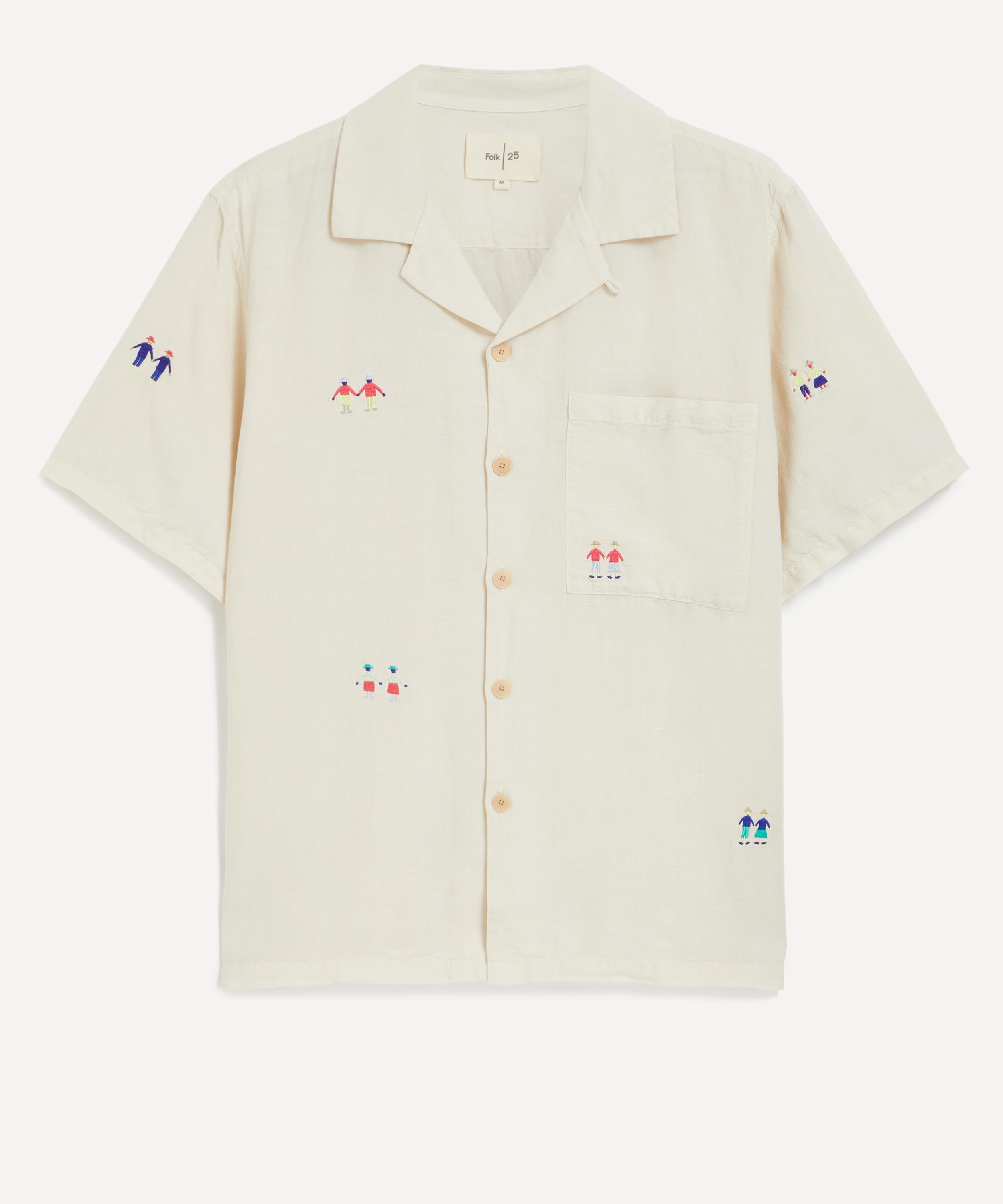 Relaxed and softly tailored, this casual shirt is made from a lightweight linen and cotton blend, fastened with corozo nut buttons. Designed with a spread collar, short sleeves, and a single chest patch pocket, this piece is elevated by intricate Folk ‘people’ embroidery scattered across the surface, adding a unique, artistic touch.
