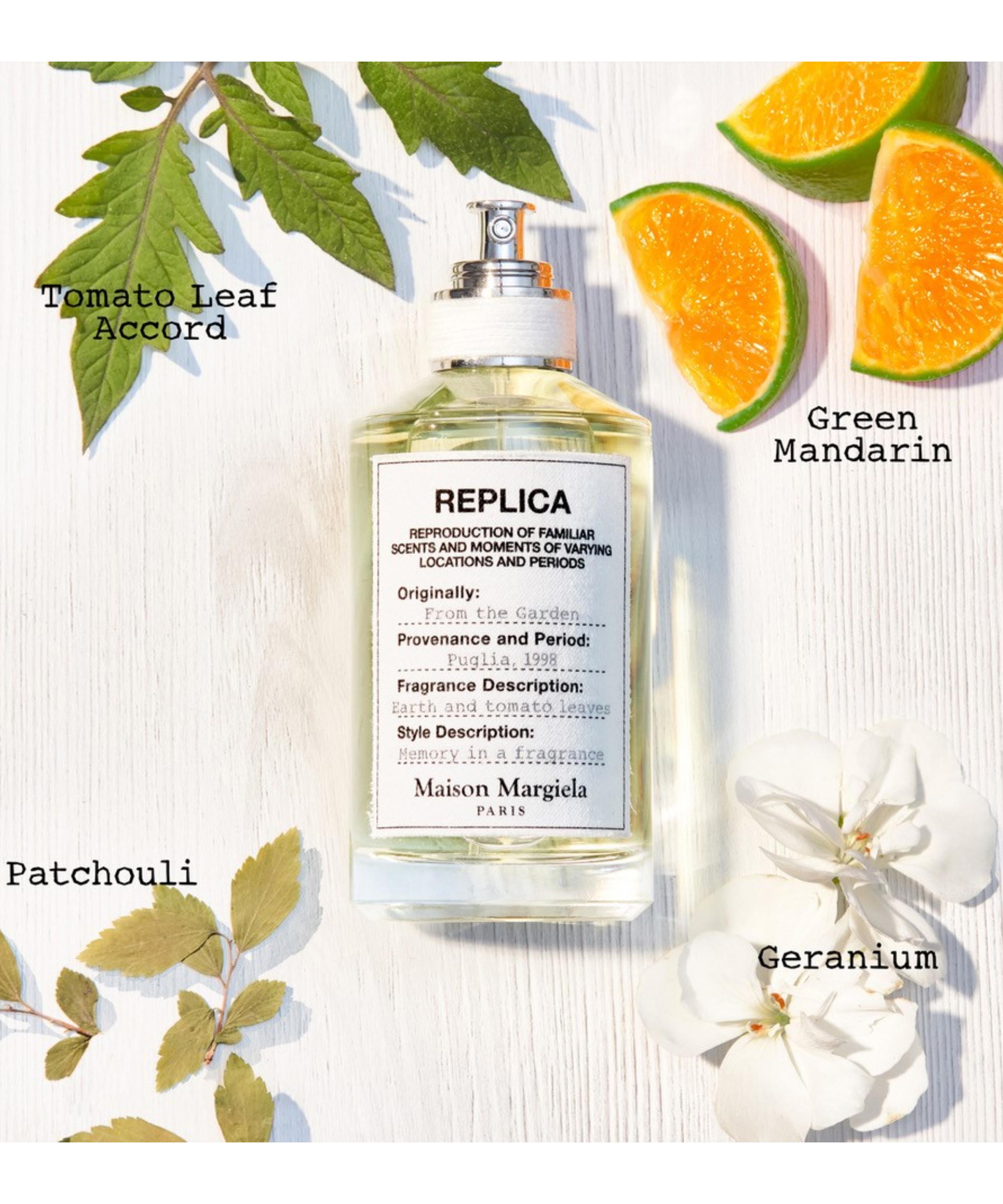 Immerse in the tranquillity of a sun-drenched garden with Maison Margiela's Replica From the Garden eau de toilette, capturing a memory from Puglia, 1998, through fragrance.