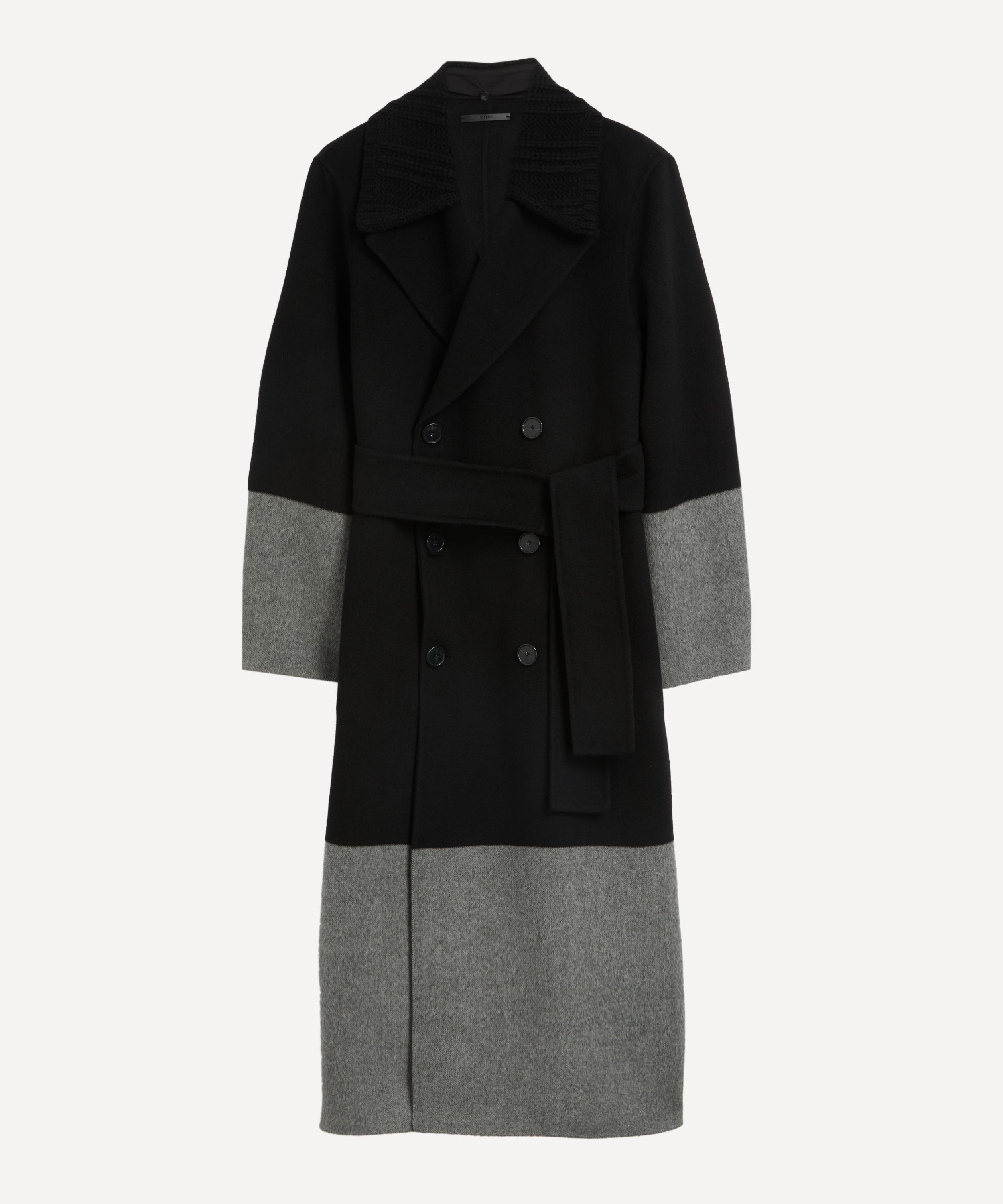 Crafted from sumptuous wool, this relaxed, trench-style coat is reversible, featuring colour block grey panels on one side, and plain black on the reverse. Fitted with a detachable knitted collar and a double-breasted front closure, it’s cinched at the waist with a removable belt.