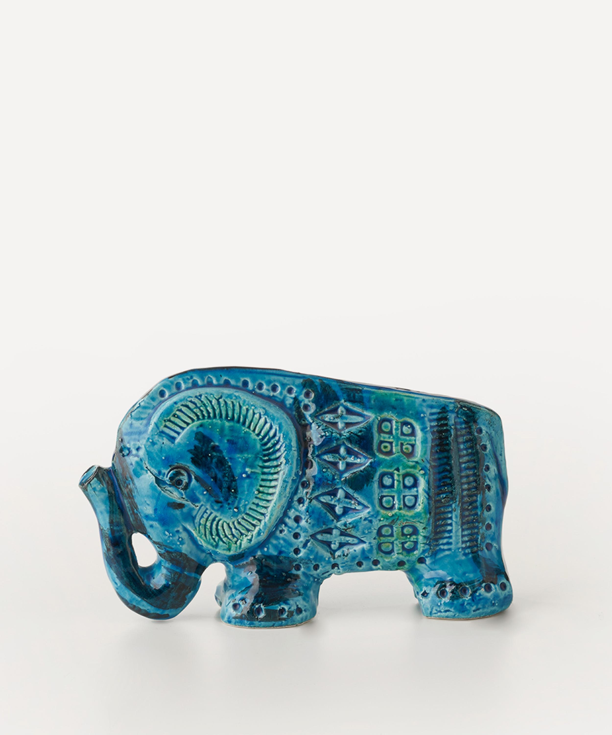Bitossi’s elephant figure is a member of the Italian brand’s iconic Rimini Blu ceramic series – each glazed a distinctive blue, and decorated with a frieze of abstract geometric imprints.