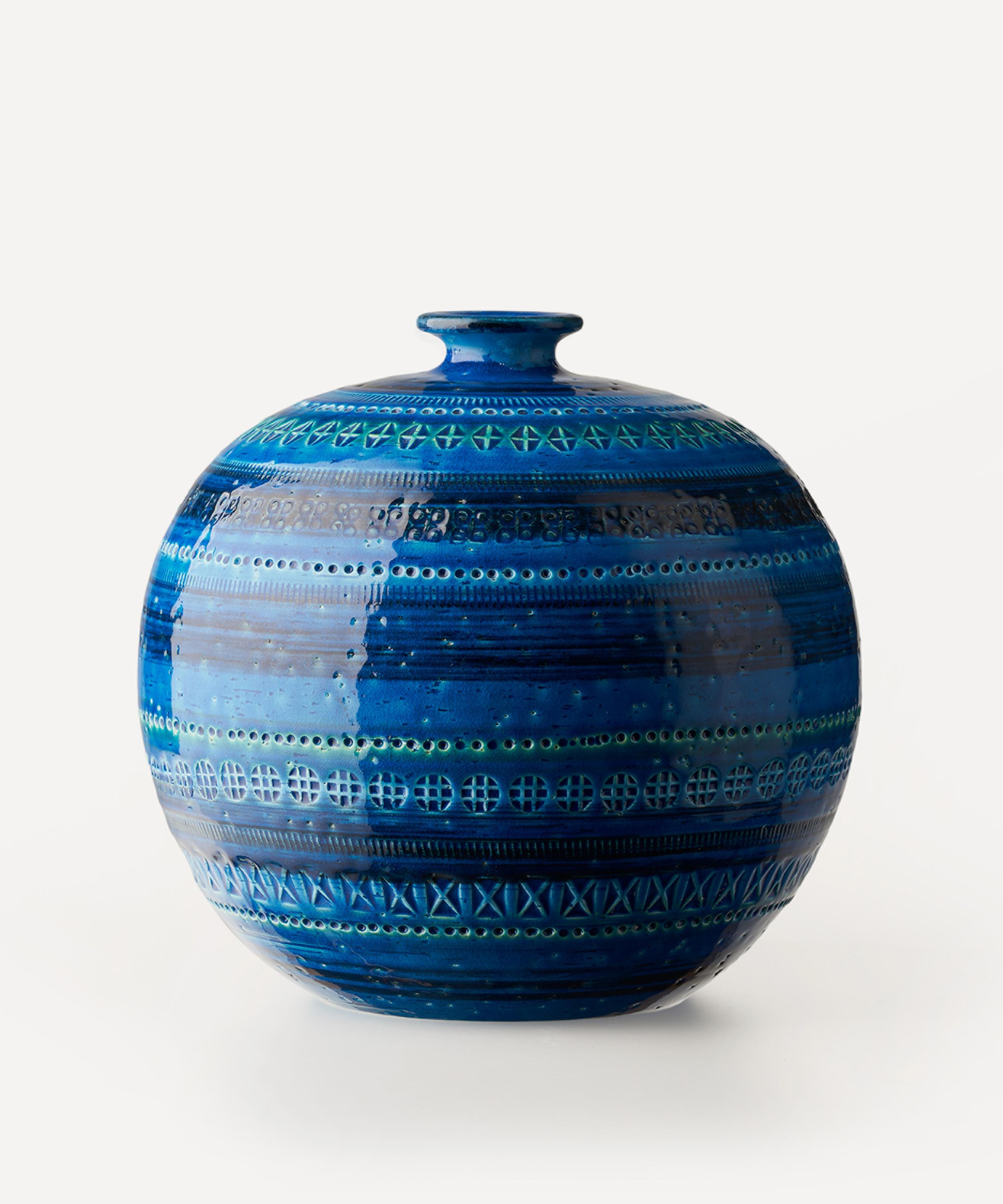 Bitossi’s rounded vase is a member of the Italian brand’s iconic Rimini Blu ceramic series – each glazed a distinctive blue, and decorated with a frieze of abstract geometric imprints.