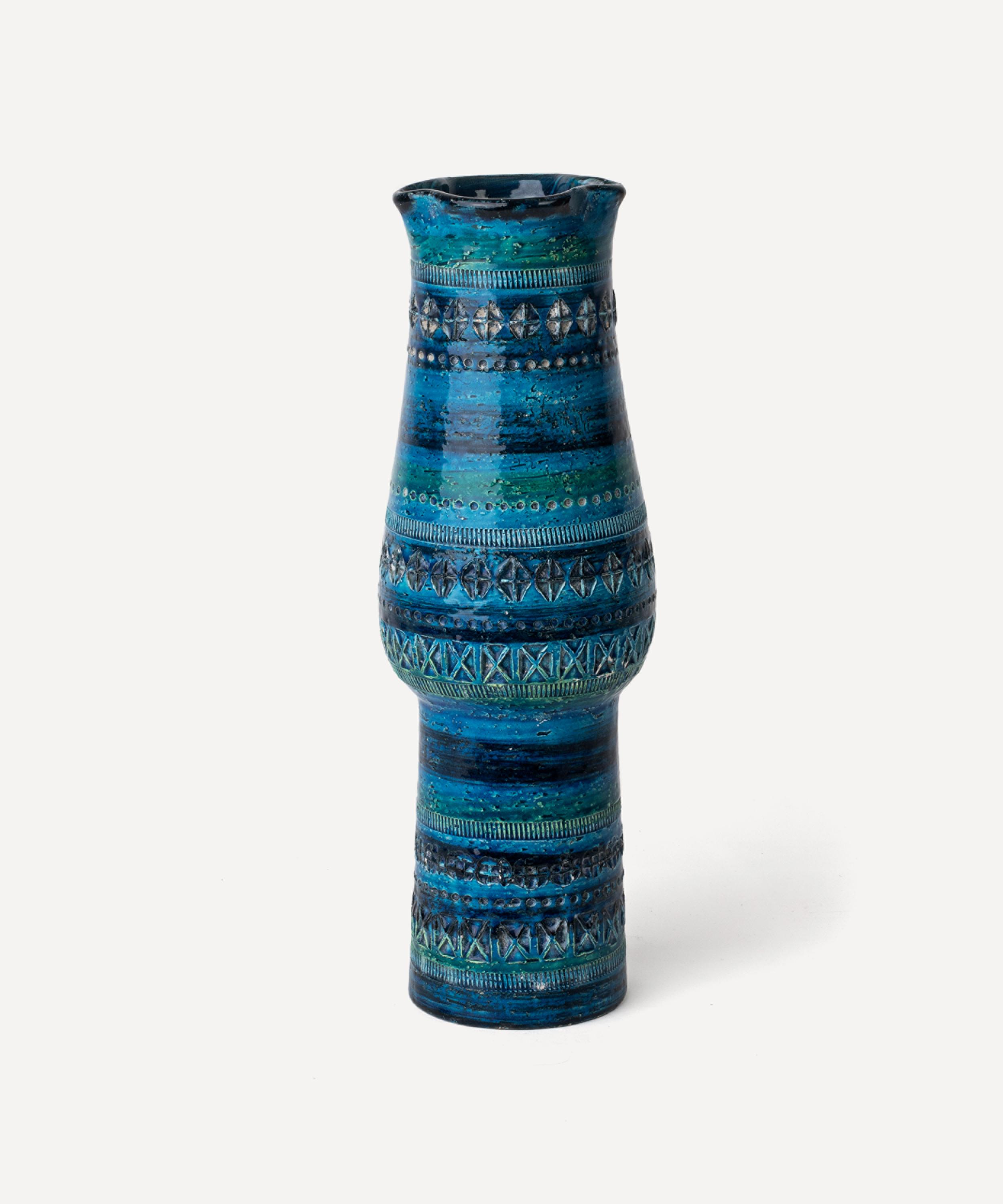 Bitossi’s tall vase is a member of the Italian brand’s iconic Rimini Blu ceramic series – each glazed a distinctive blue, and decorated with a frieze of abstract geometric imprints.