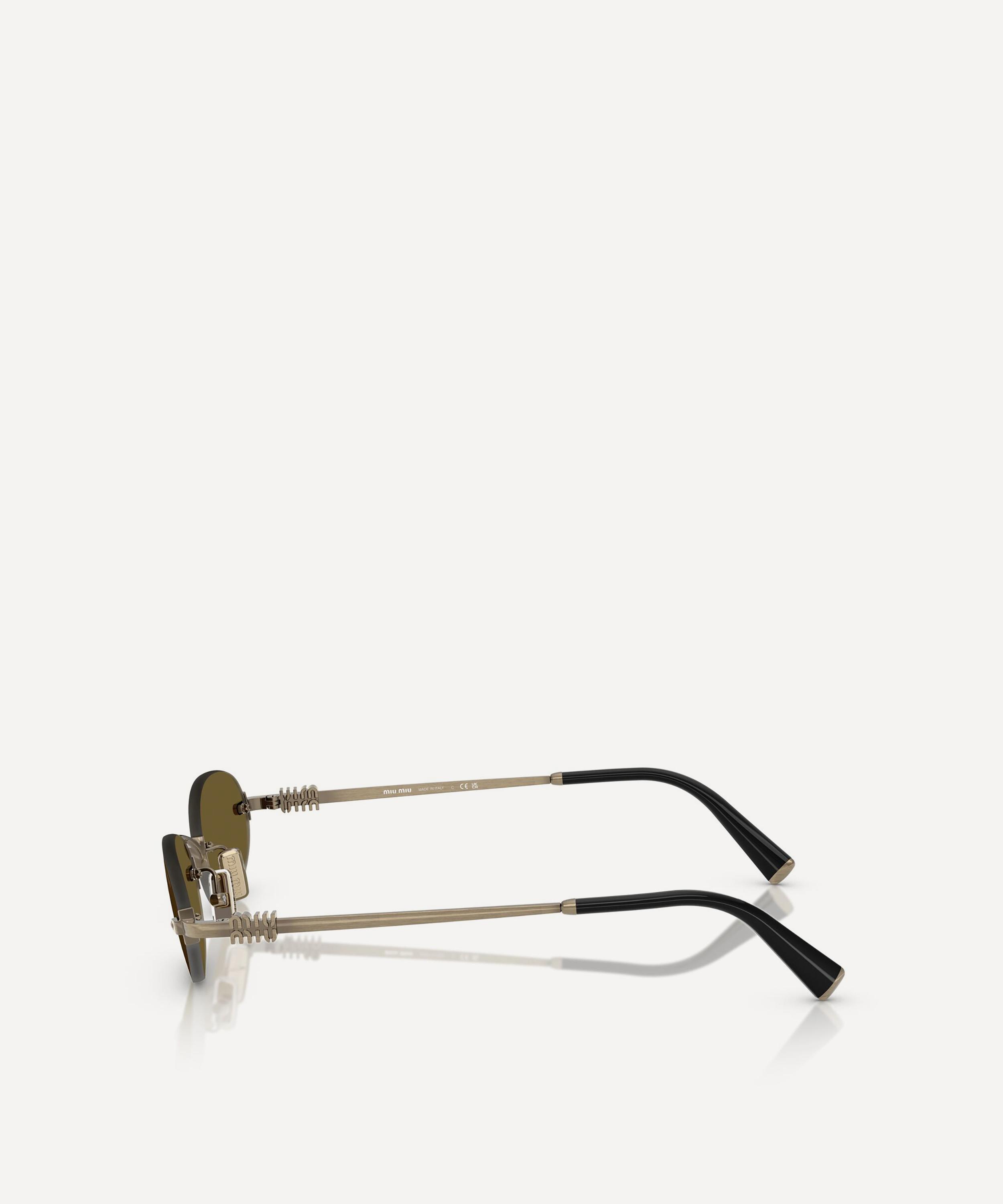 Heighten the impact of any attire with these oval sunglasses from Miu Miu. Expertly crafted from old-gold metal, to create a statement pair that instantly draws the eye, these rimless sunnies are fitted with adjustable nose pads and dark-brown lenses to shade and protect your eyes from UV light. Complete with acetate temple tips and the signature branding at the temples, they make for an ultra-chic finish to your curated looks.
