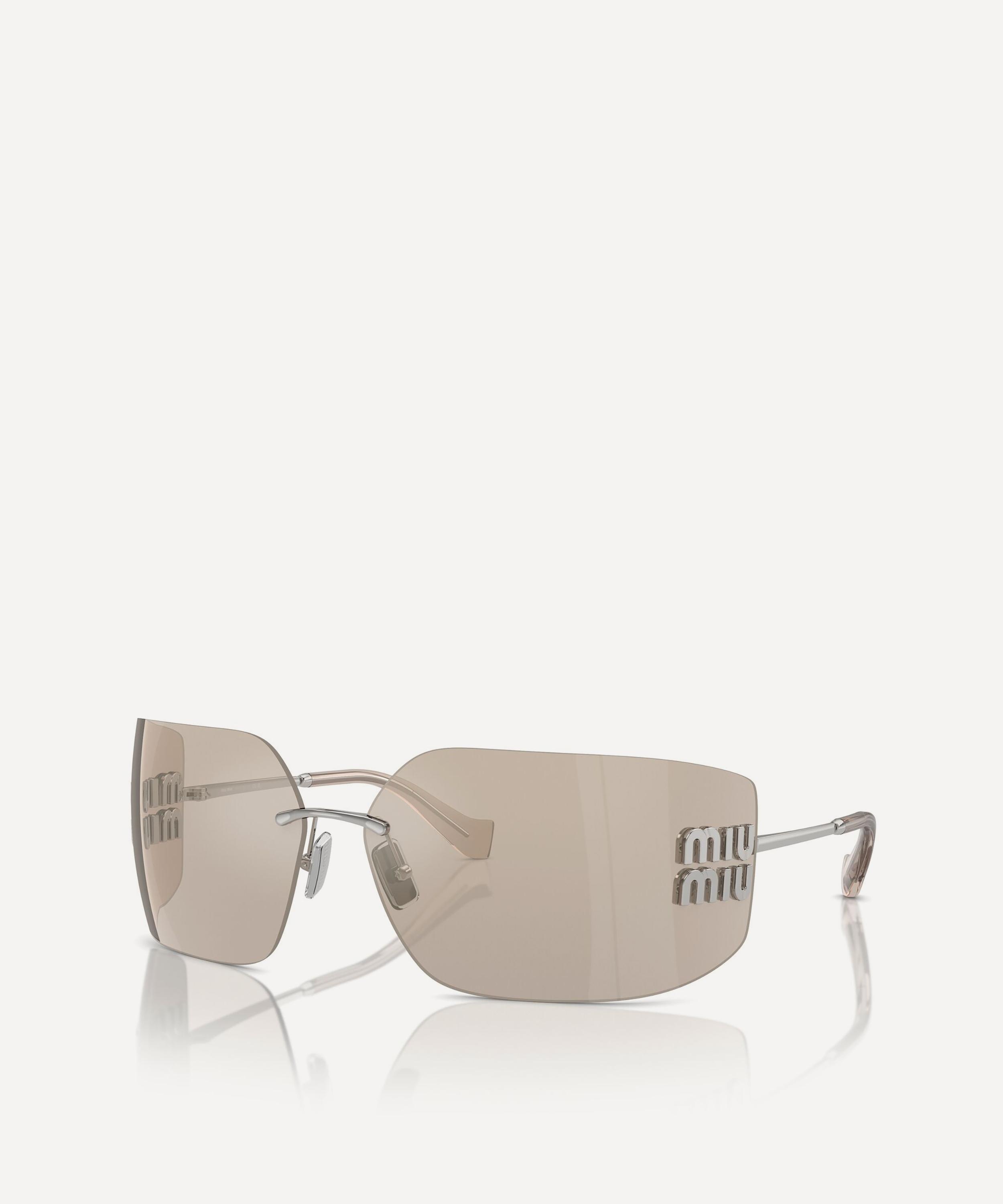 Heighten the impact of any attire with these rectangle sunglasses from Miu Miu. Expertly crafted from silver-tone metal to create a statement pair that instantly draws the eye, these rimless sunnies are fitted with adjustable nose pads and large, light brown lenses to shade and protect your eyes from UV light. Complete with acetate temple tips and the signature branding at the temples, they make for an ultra-chic finish to your curated looks.