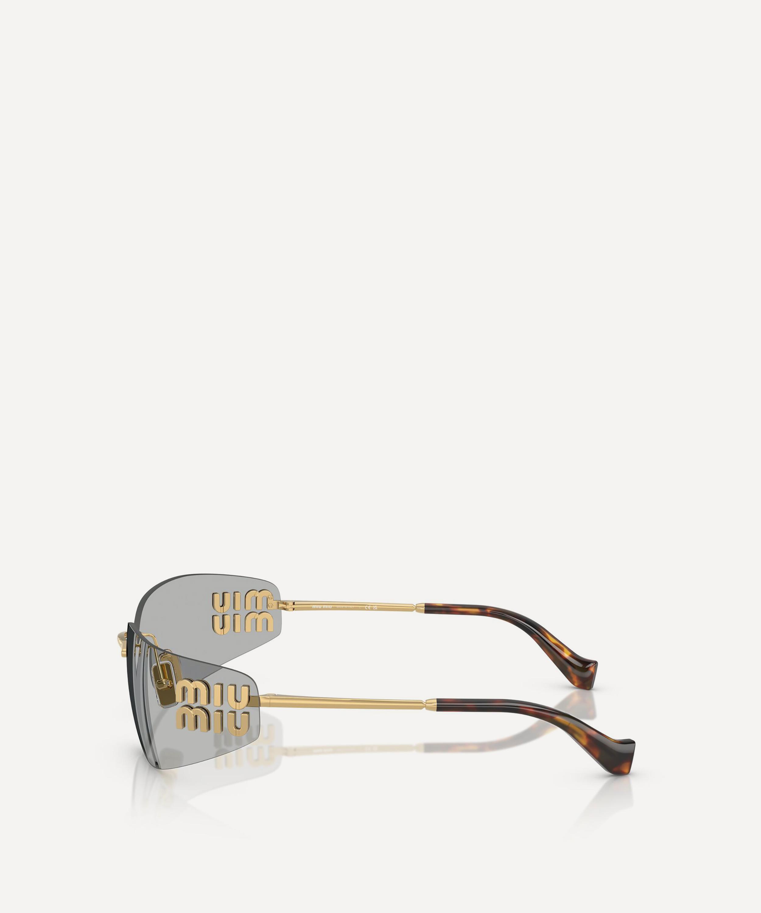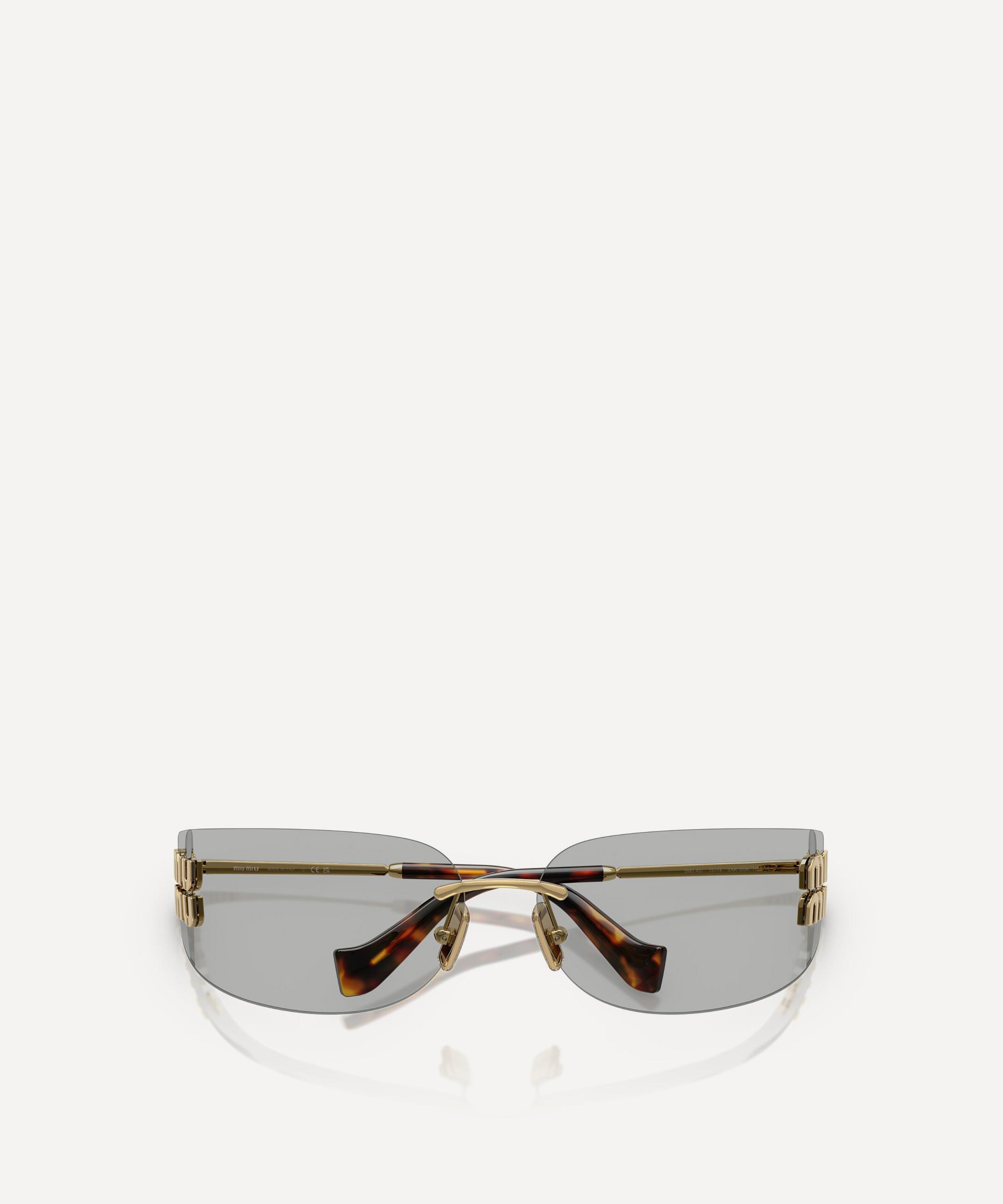 Heighten the impact of any attire with these rectangle sunglasses from Miu Miu. Expertly crafted from gold-tone metal, to create a statement pair that instantly draws the eye, these rimless sunnies are fitted with adjustable nose pads and large, light-grey lenses to shade and protect your eyes from UV light. Complete with acetate temple tips and the signature branding at the temples, they make for an ultra-chic finish to your curated looks.