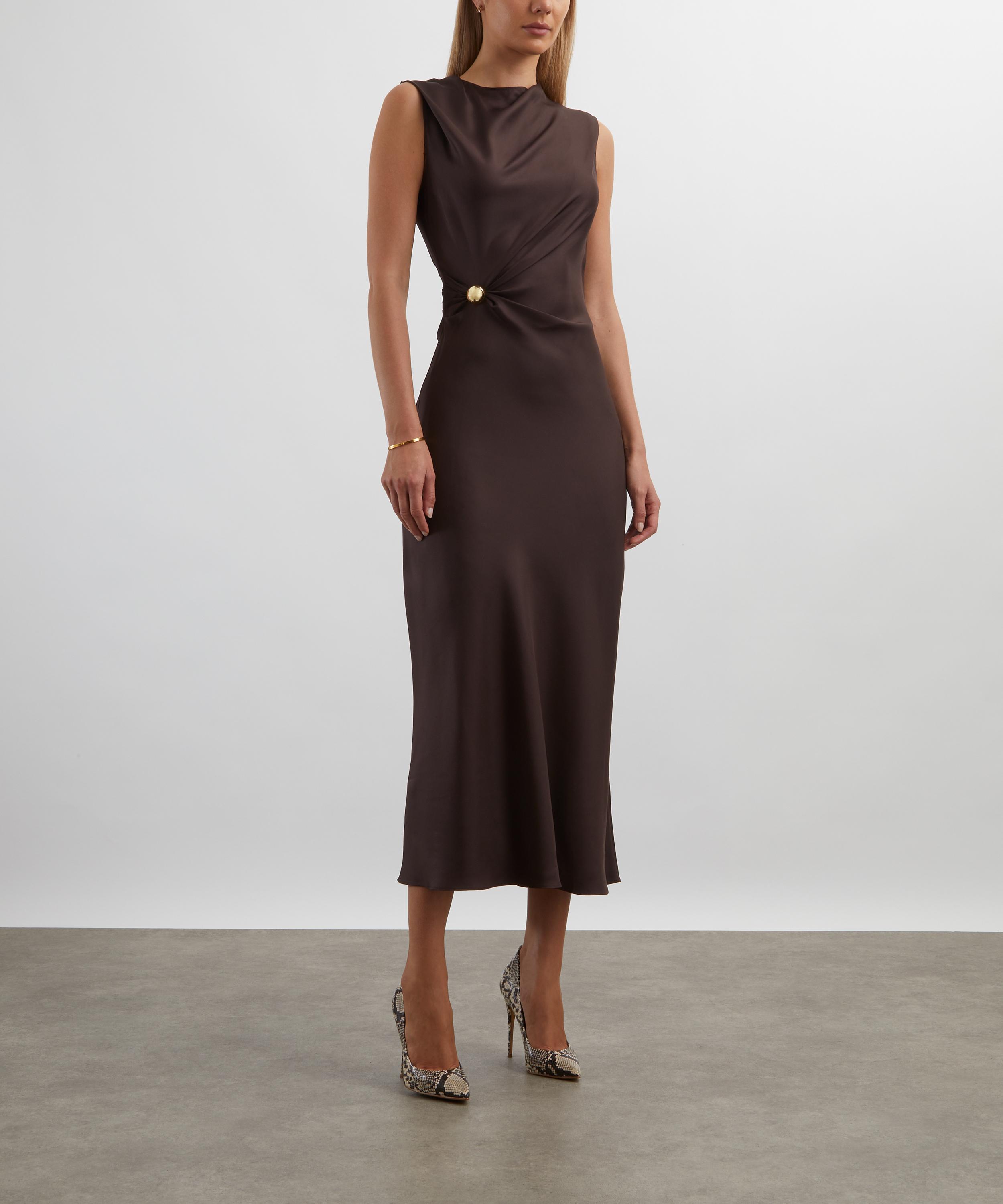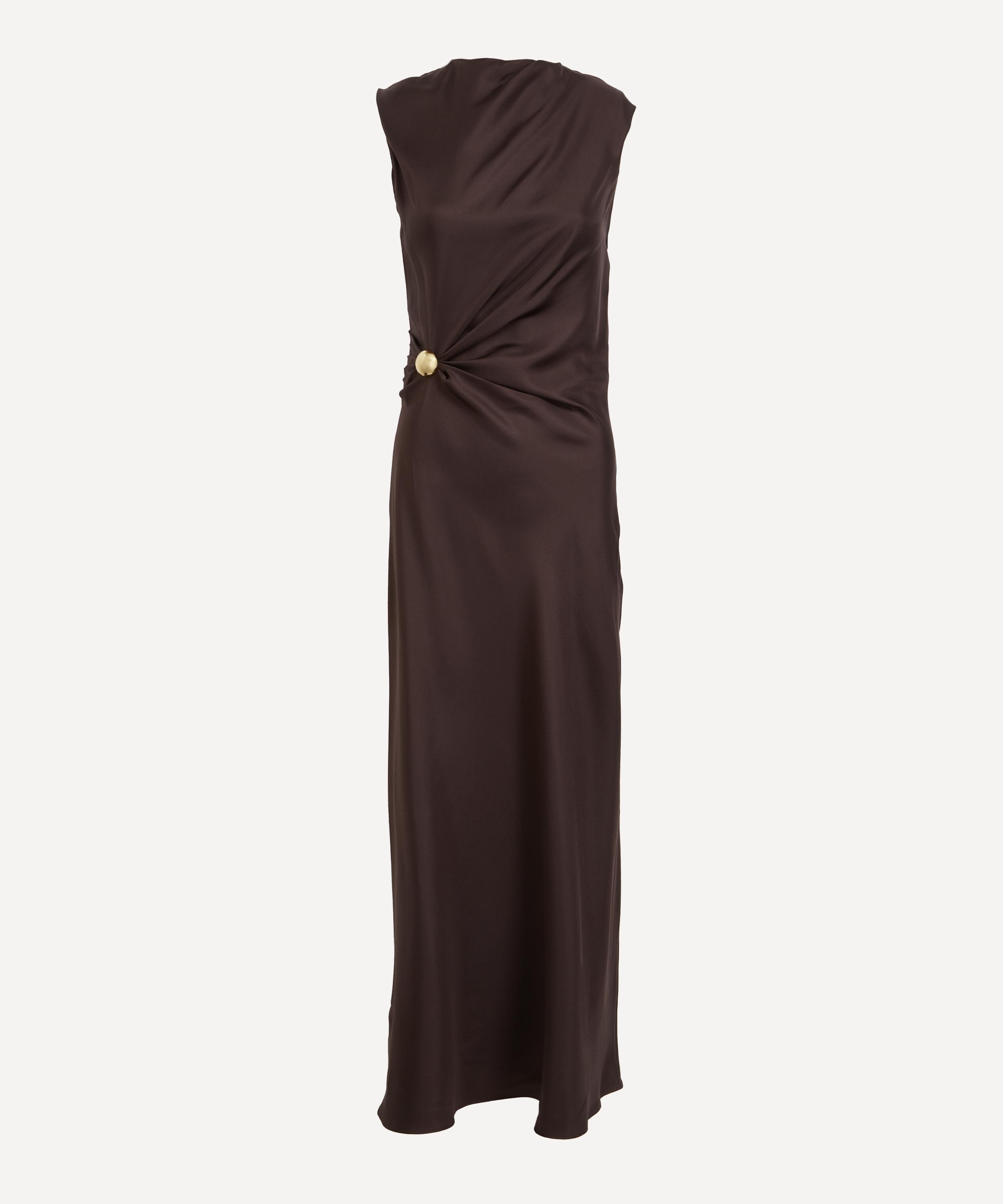 Crafted from lustrous silk-twill that drapes beautifully, the Roan Dress exudes effortless sophistication. Minimal in design with a high neckline and sleeveless cut, it’s finished with a single gold-tone embellishment at the waist for a softly gathered effect.