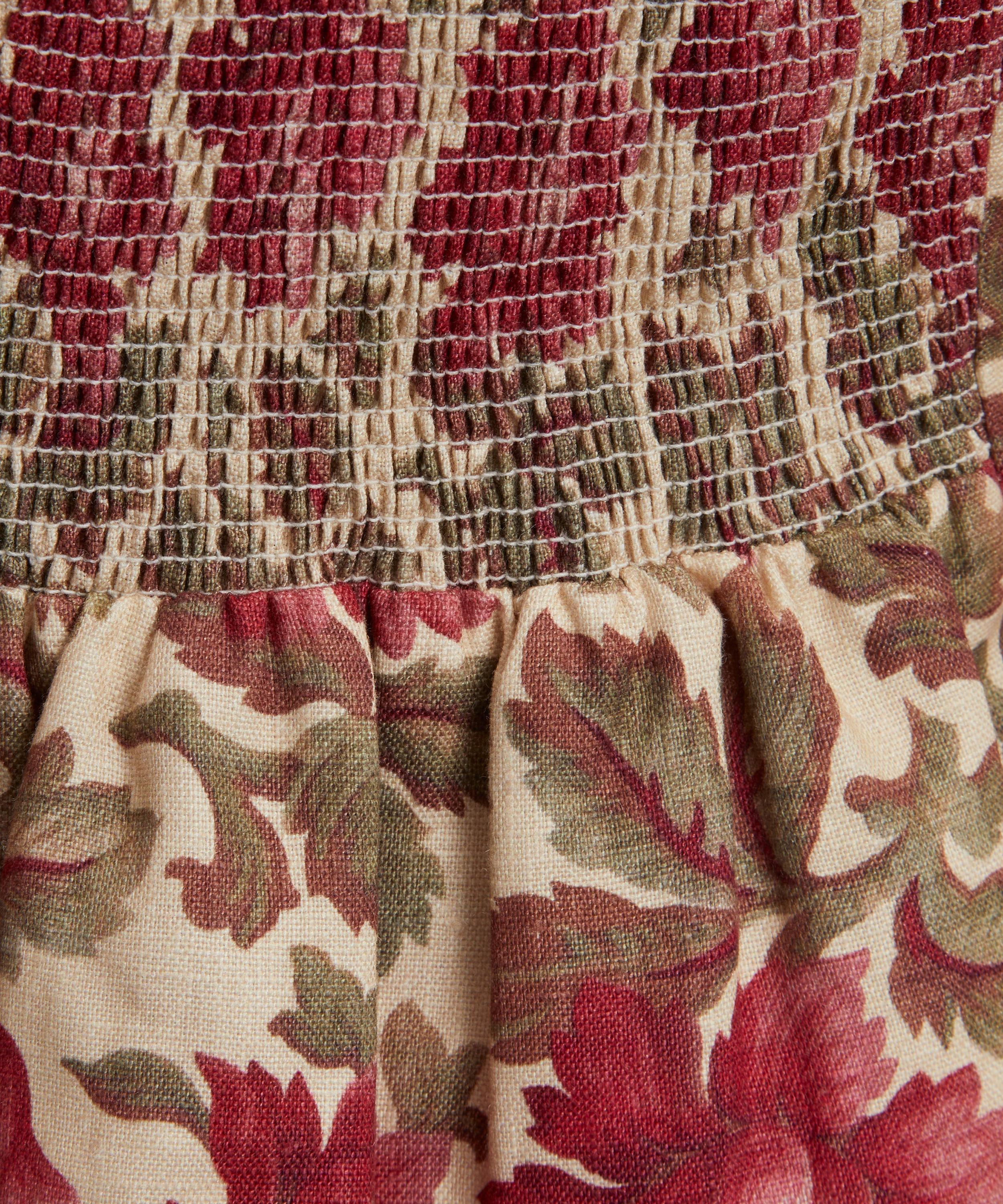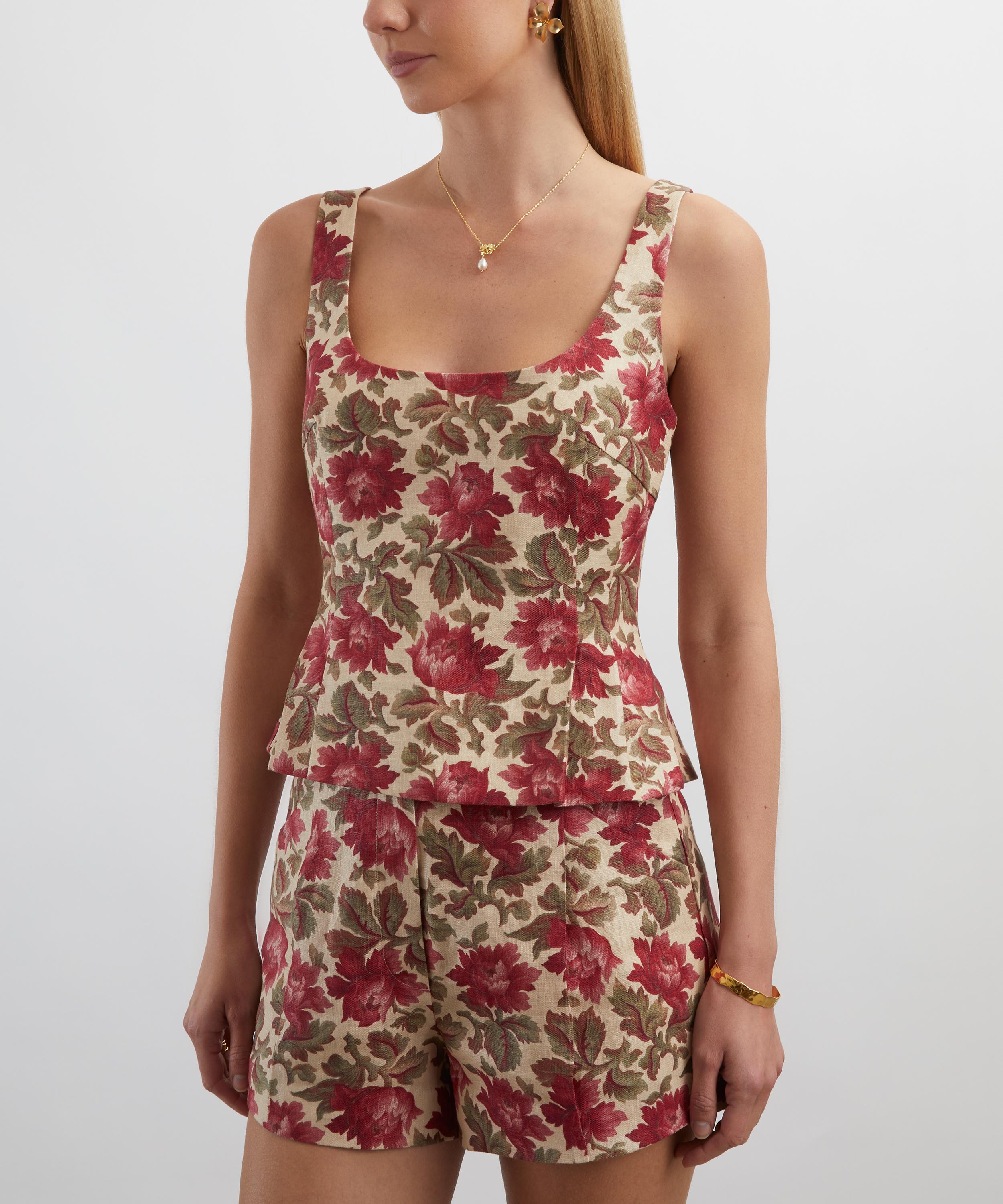 Crafted from premium linen and adorned with antique-inspired florals, the Rosalie Top is tailored for a close, flattering fit. An elegant scoop neckline, peplum hem, and shirred back combine comfort with effortless, feminine charm.