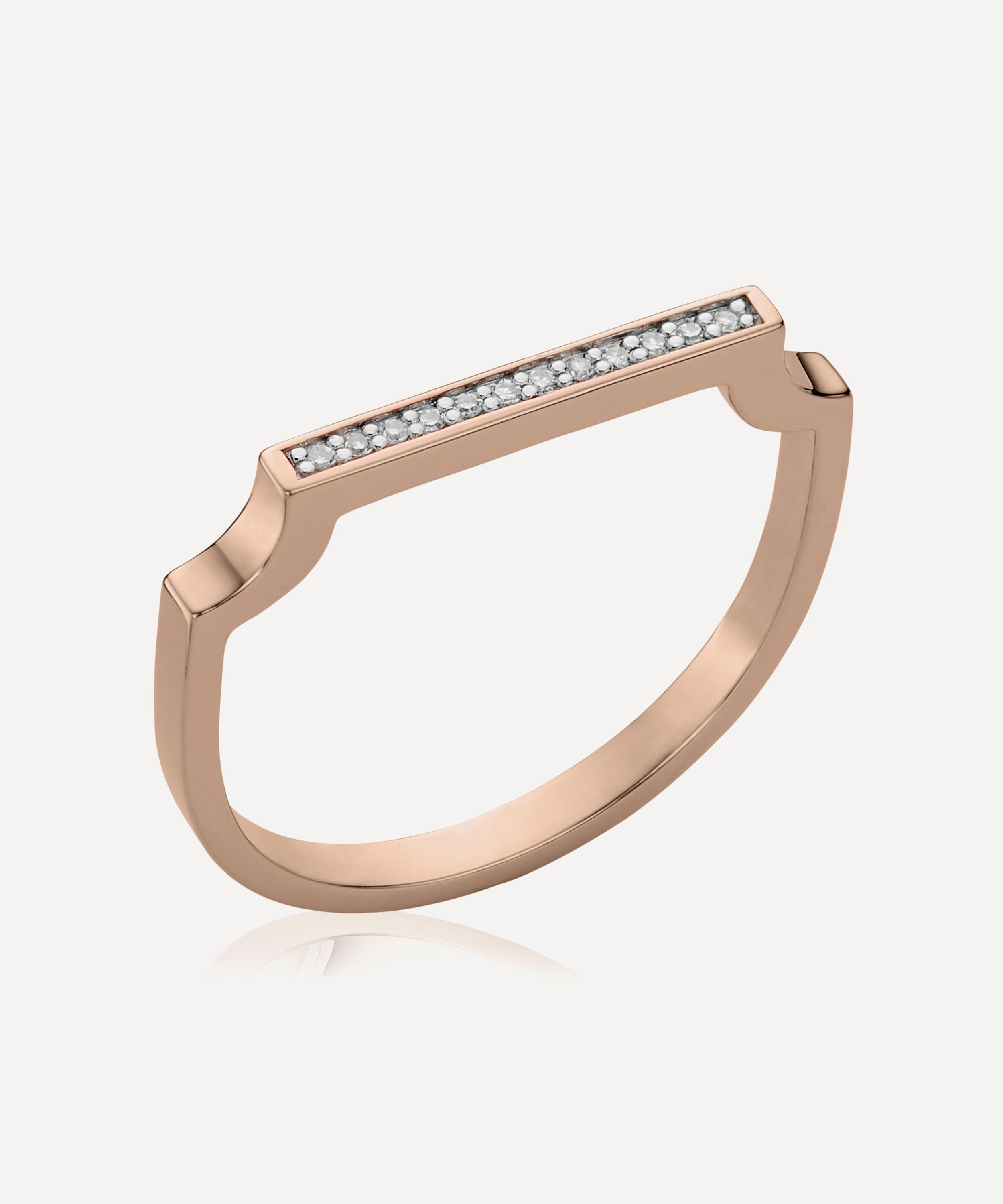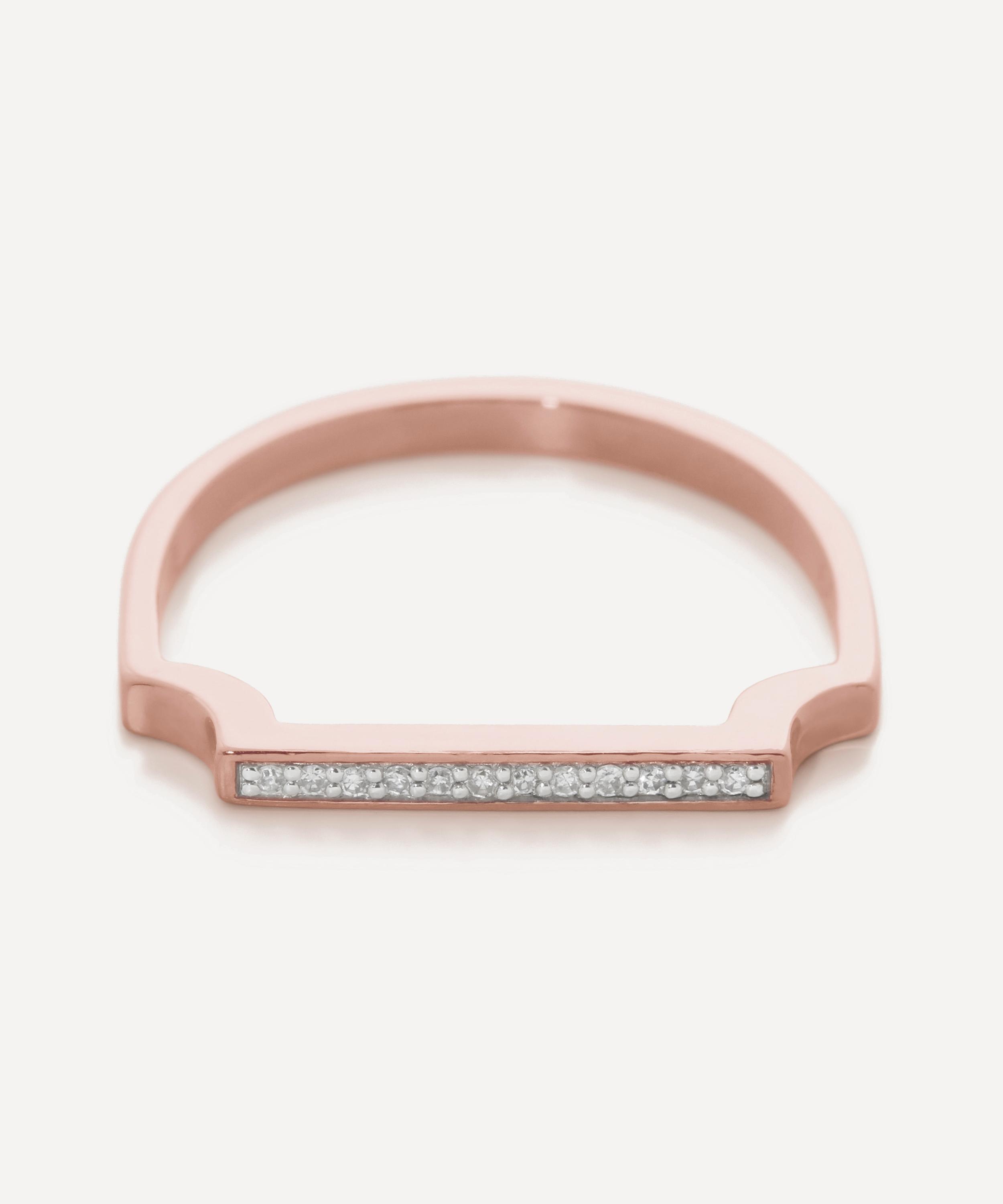 Combining strong clean lines with flowing curves, each piece in Monica Vinader's Signature collection is brimming with modernity and femininity. Crafted from polished 18 carat rose gold plated vermeil silver, this slim ring showcases an elegantly curved design, finished with a pavé white diamond-encrusted bar and inverted corners. Wear it alone as an everyday statement piece or style it as part of a careful curation of glittering bands.