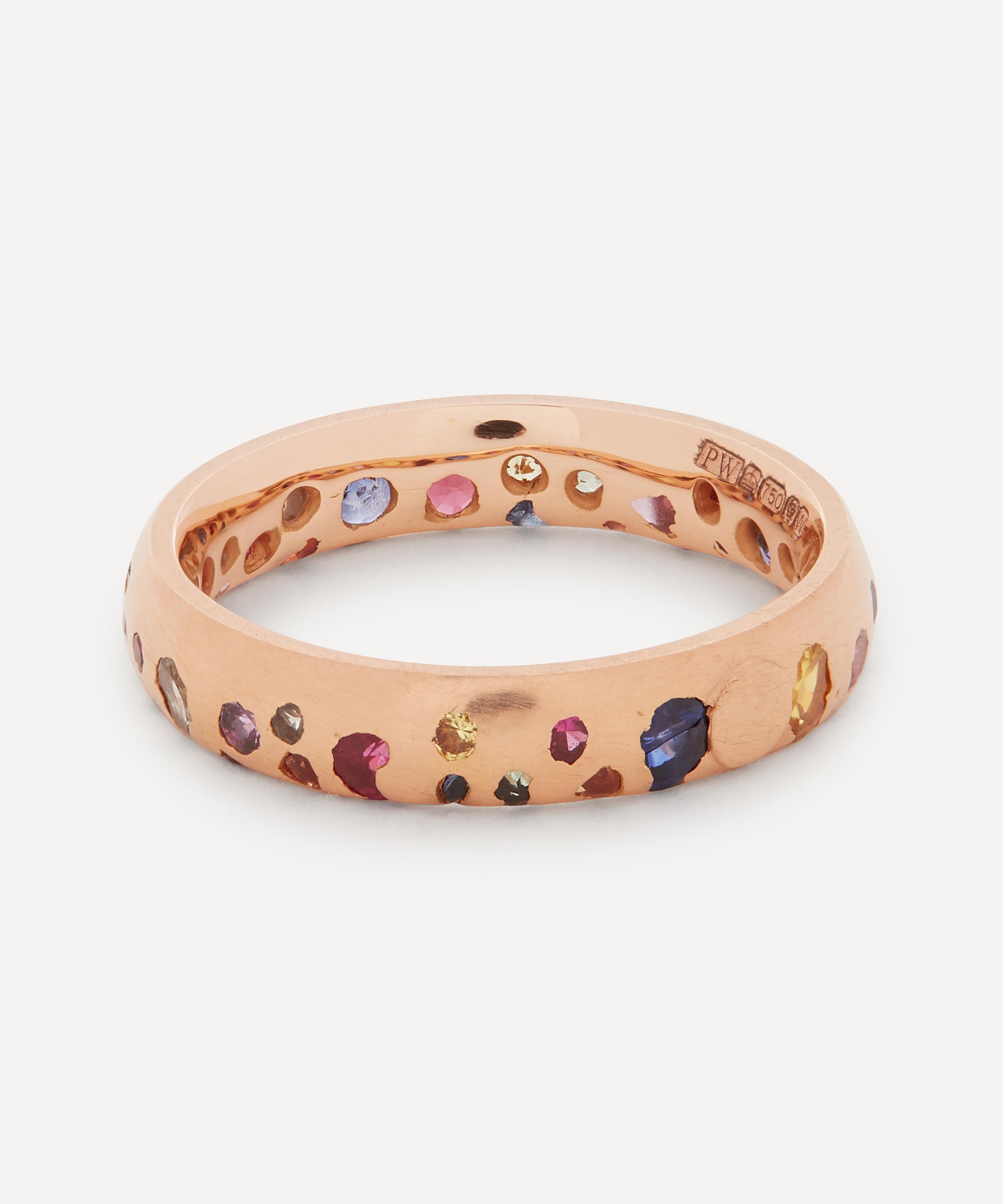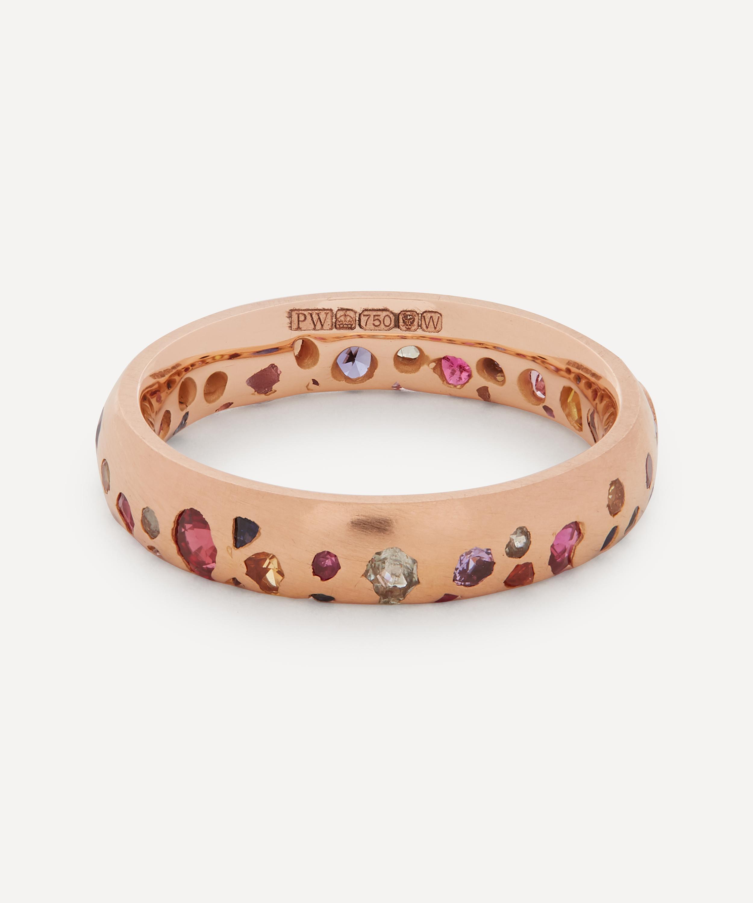 Crafted from solid 20 carat rose gold, this ring features a narrow band encrusted with a glittering assortment of mismatched rainbow sapphires - all jumbled together like confetti. The designer's unconventional casting method means every piece is one of a kind - each stone is 'cast-not-set' into molten gold for a delightfully unpredictable, organic finish. Try stacking several contrasting Confetti rings together for a kaleidoscopic evening curation.