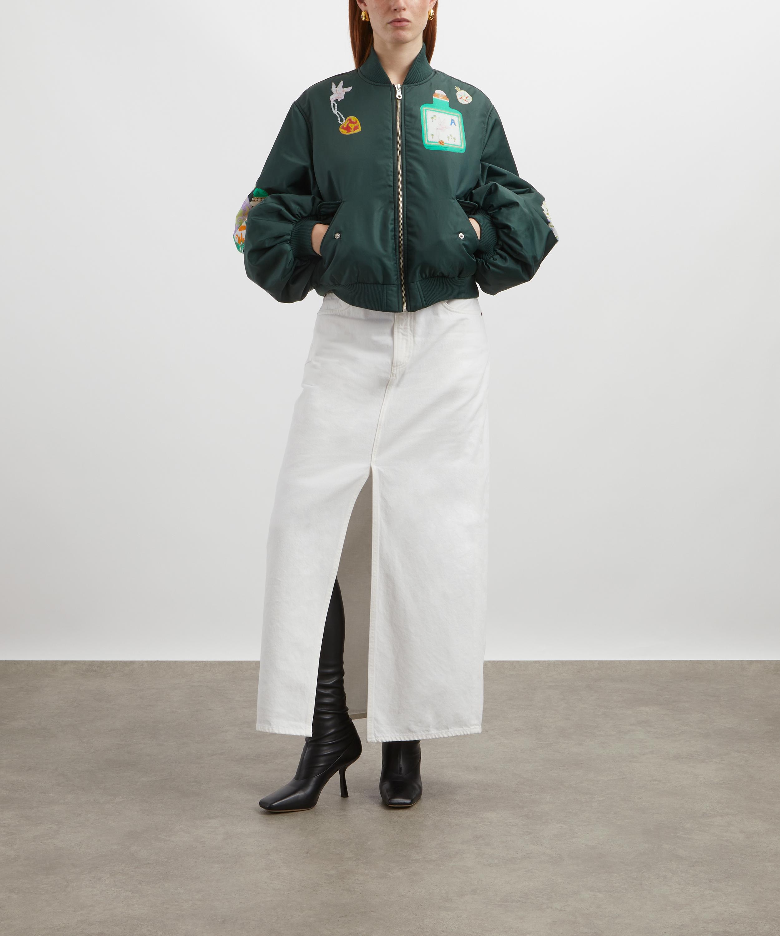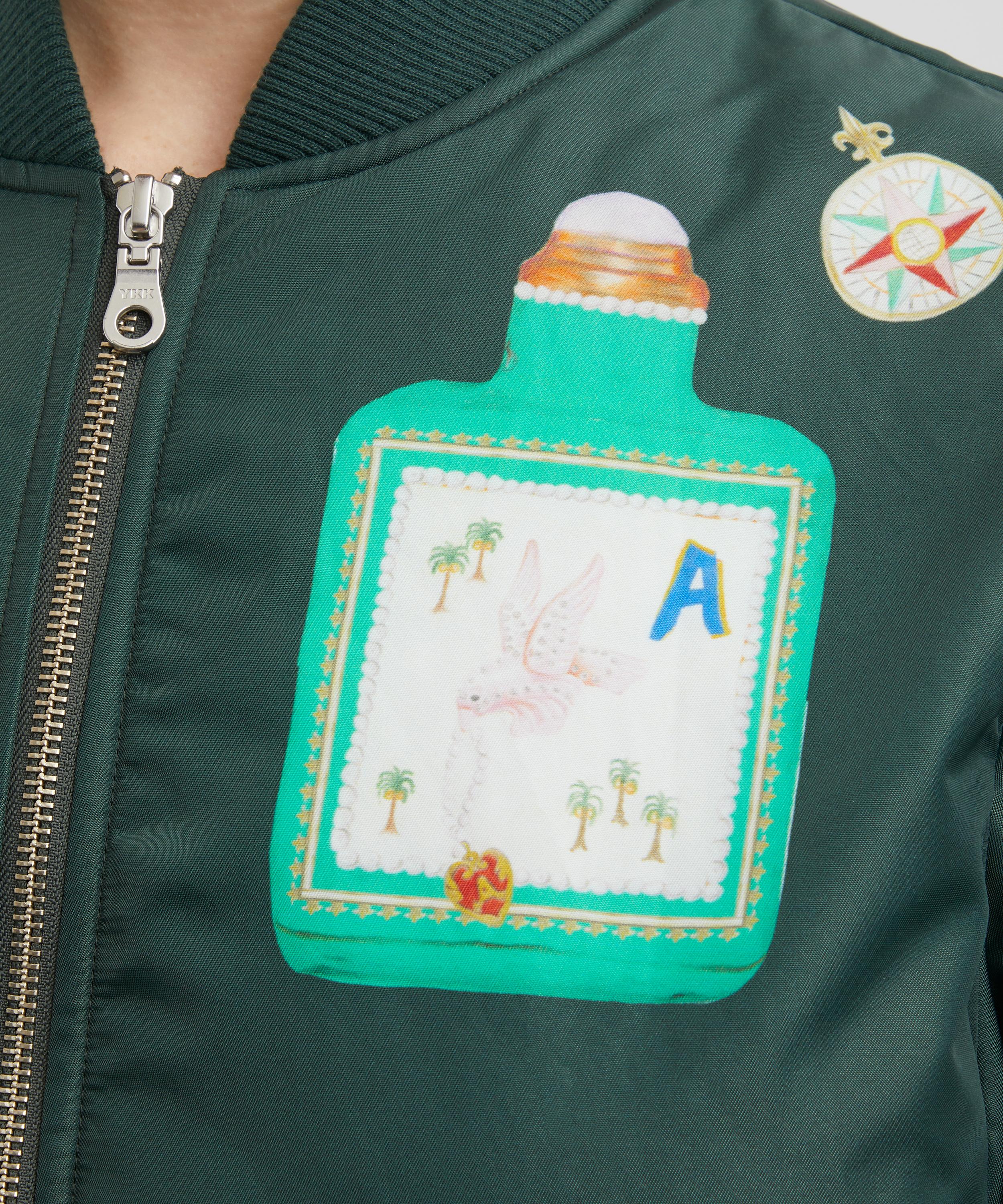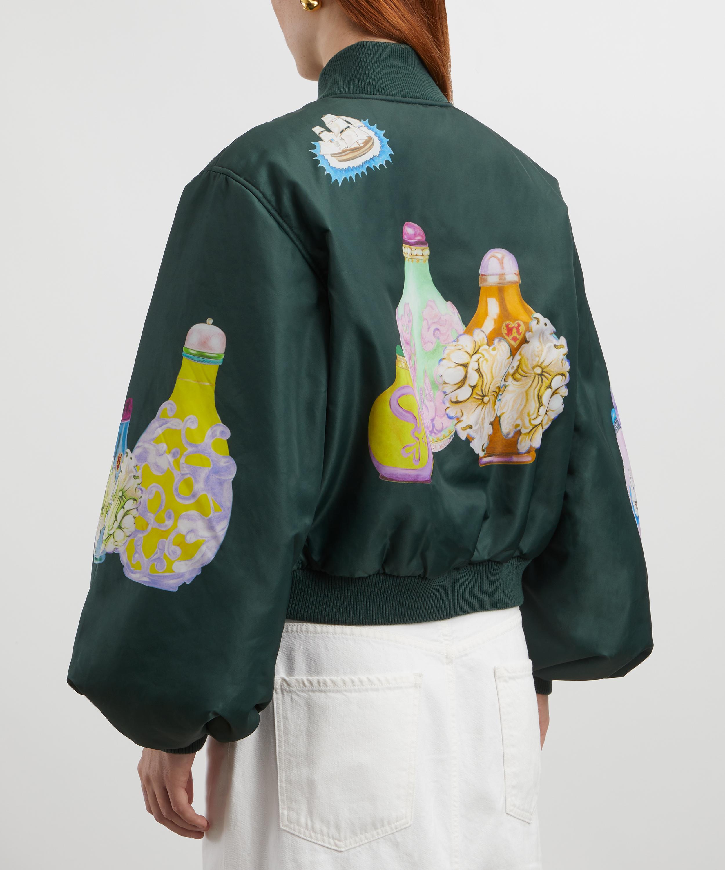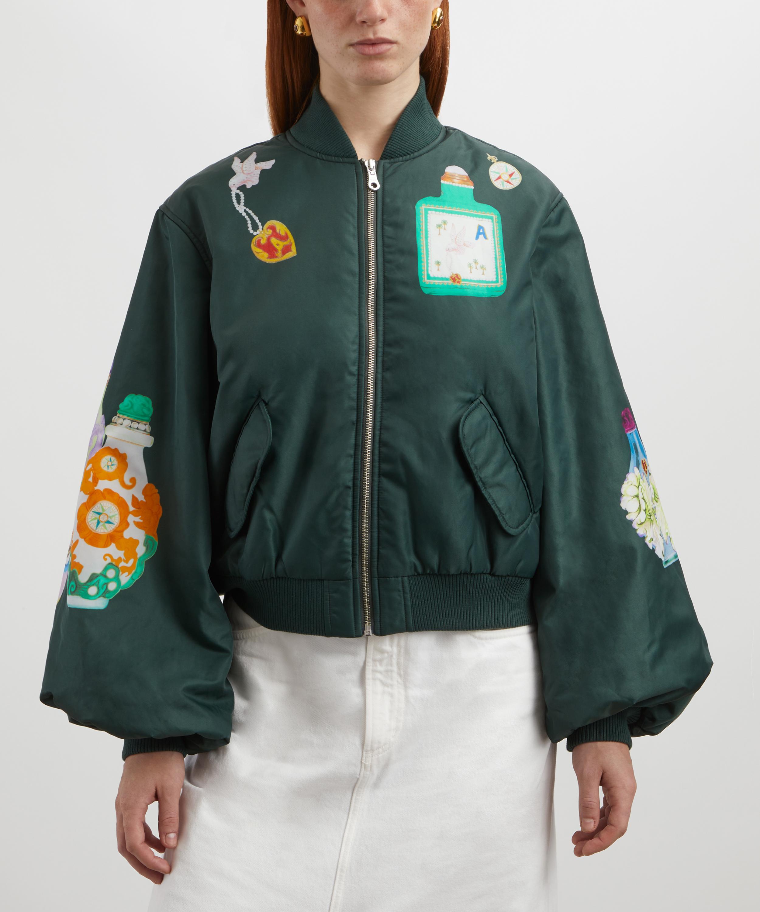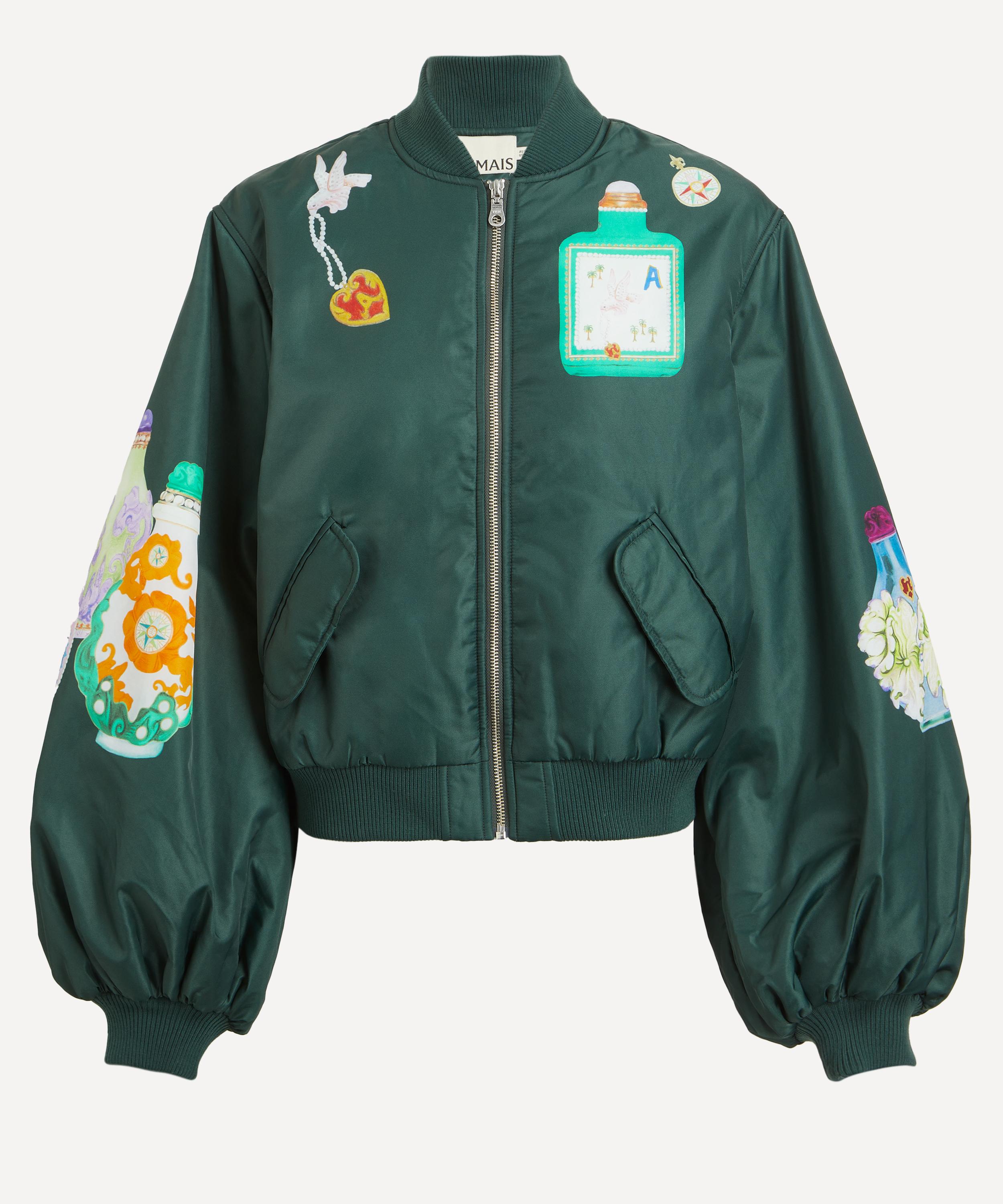 This ALÉMAIS jacket puts a feminine spin on the classic bomber with its voluminous puff sleeves and delightful hand-painted antique scent bottle motifs, making it a true statement piece. Designed for a relaxed fit, this jacket features internal padding for added warmth in cooler months, while the zip closure, jet pockets, and ribbed trims provide a functional finish.