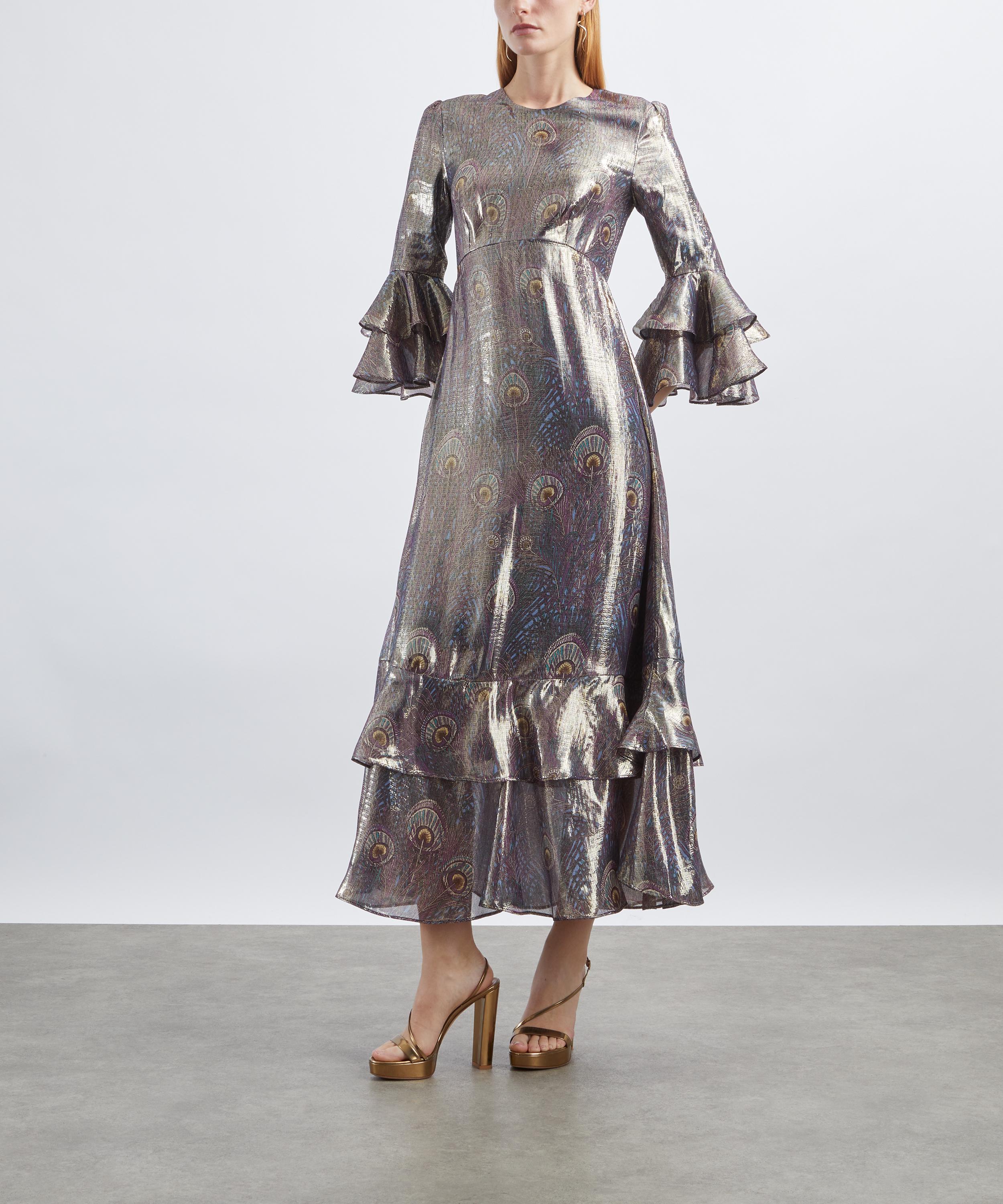 Cut from lustrous silk metallic lamé mousseline, it’s designed to flatter with its elegant empire waist and sweeping A-line silhouette. A true statement piece, it’s defined by flouncy pagoda sleeves and a softly tiered hem - blending timeless femininity with a playful edge.