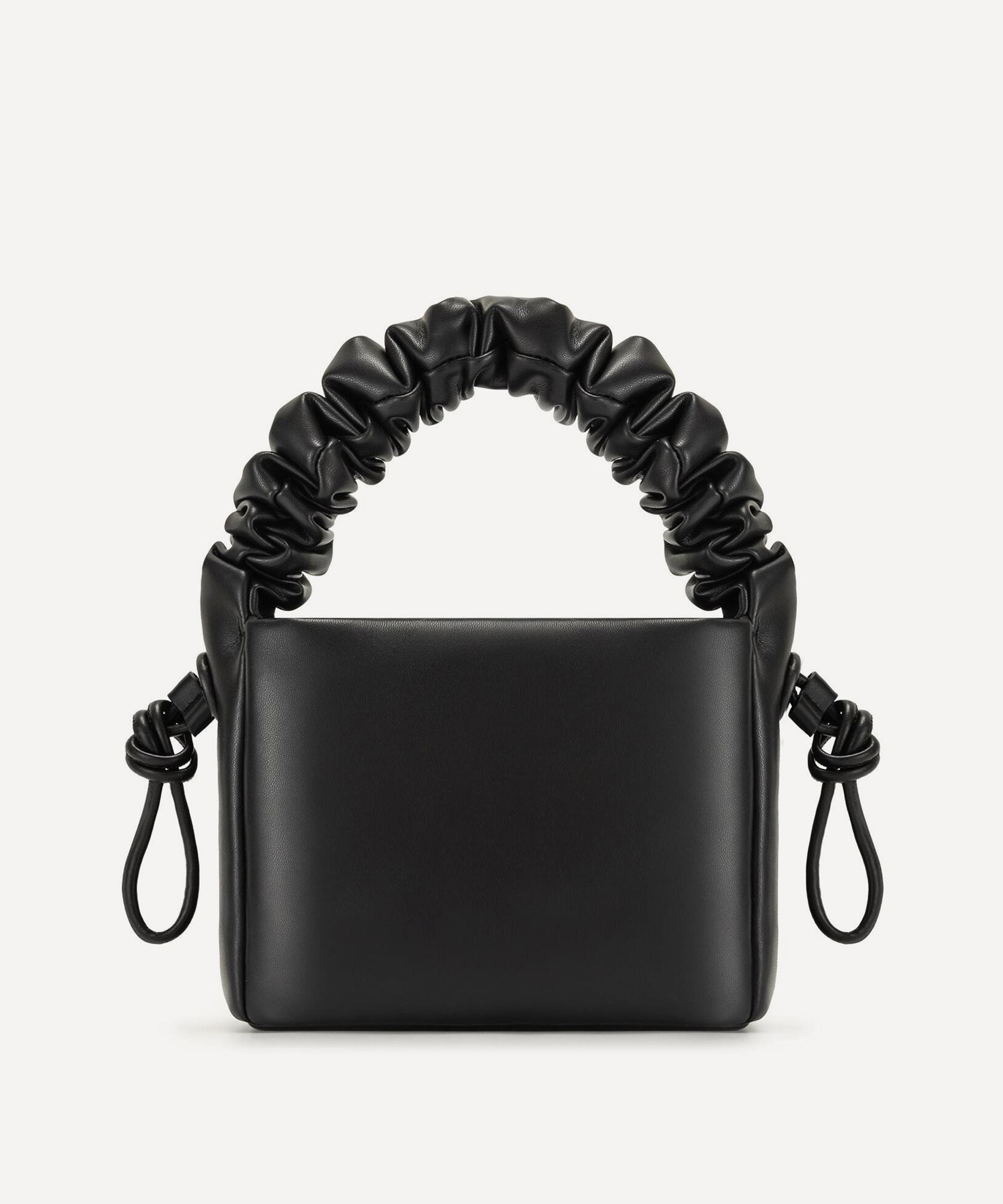 Capturing a tactile aesthetic, this vegan leather bag showcases a compact silhouette with a ruched drawstring top handle. Complete with silver-tone hardware and an internal slip pocket, it’s a stylish companion for both day and night.