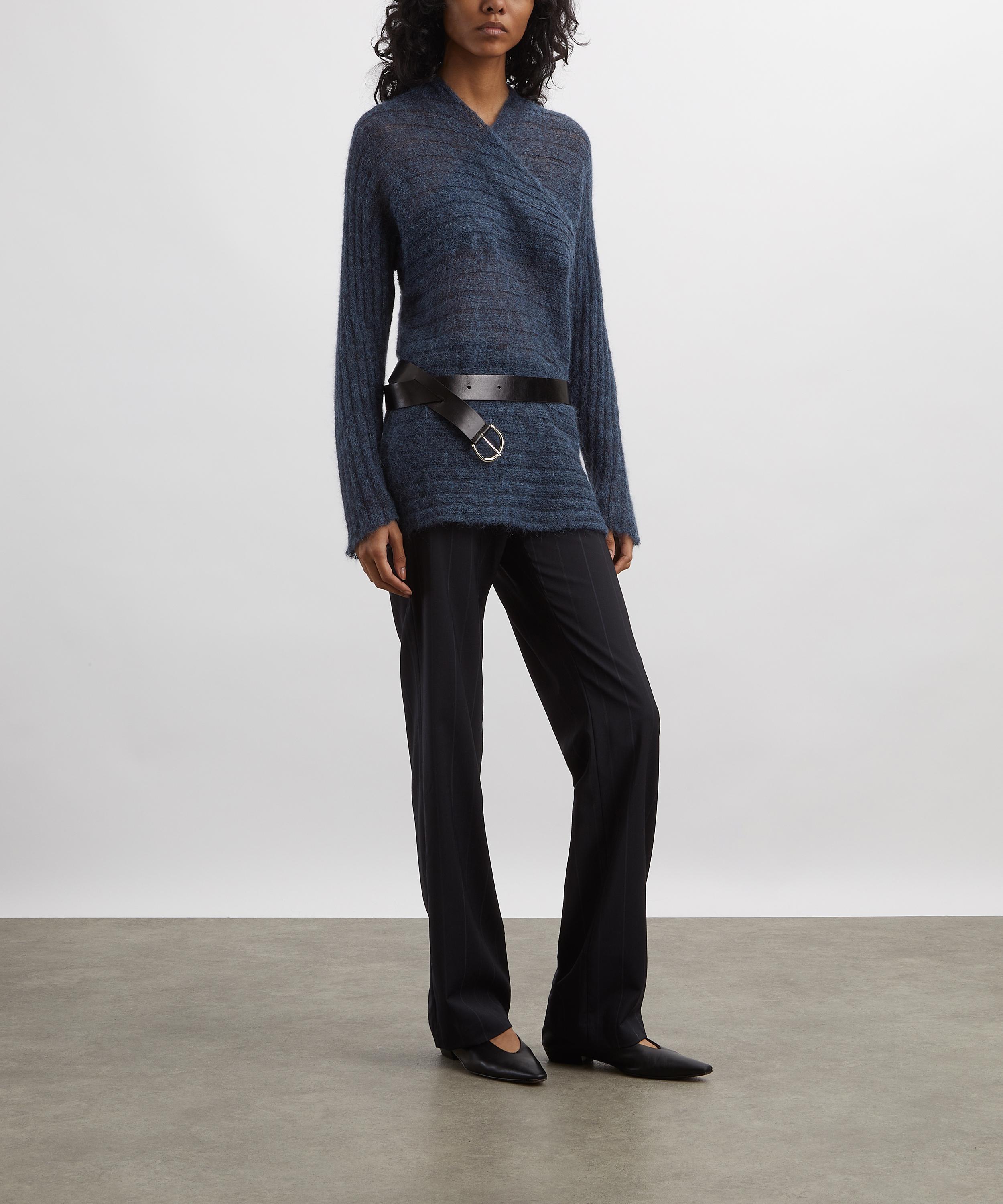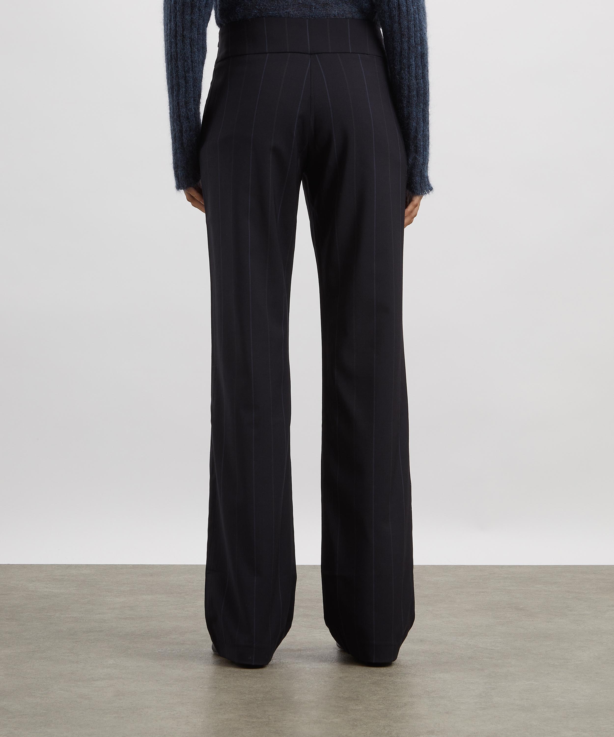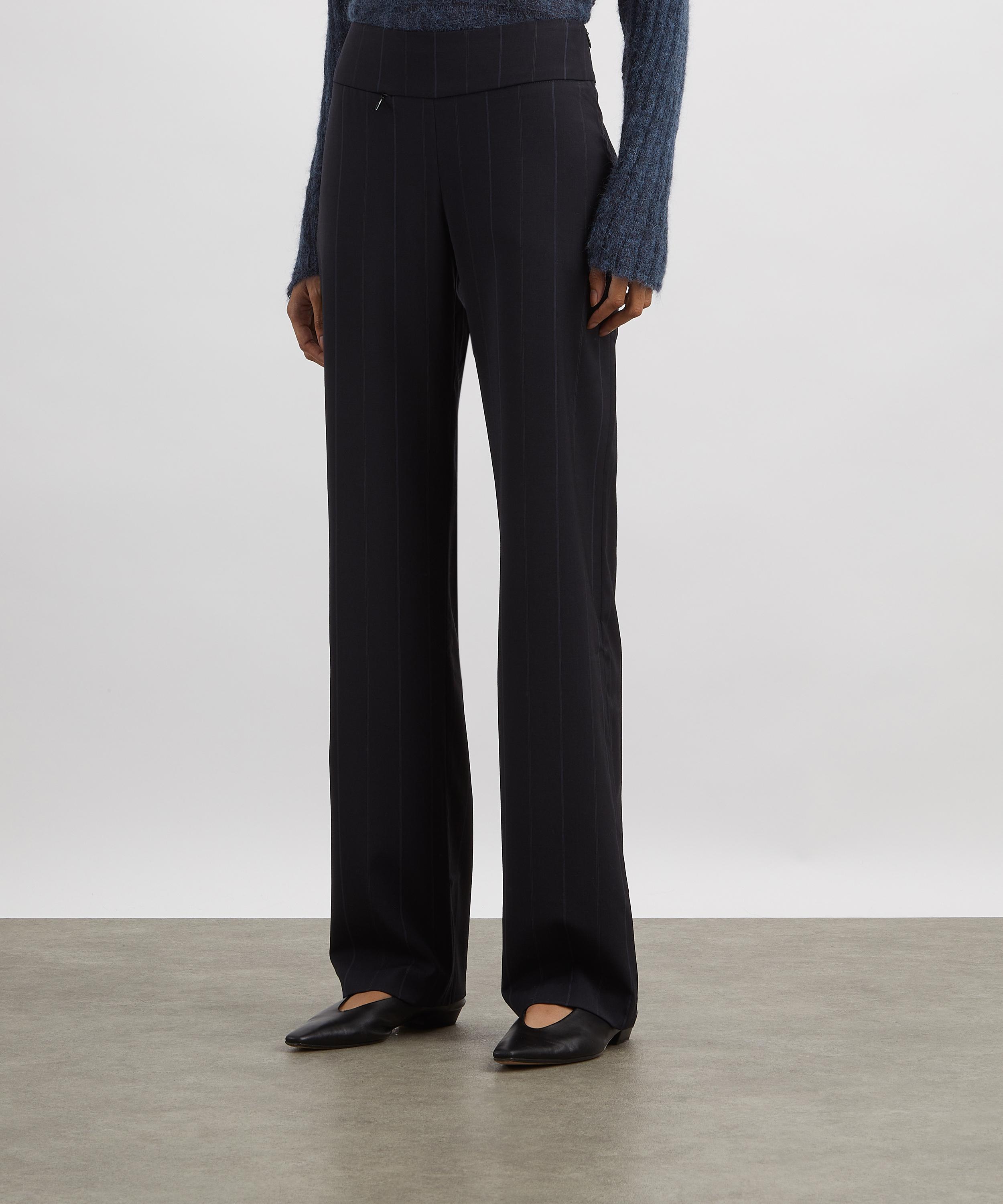 Cut from pinstripe fabric in a straight-leg fit with a low-rise waist, they are finished with subtle cut-out detailing and tailored seams, creating a contemporary edge while maintaining timeless sophistication.