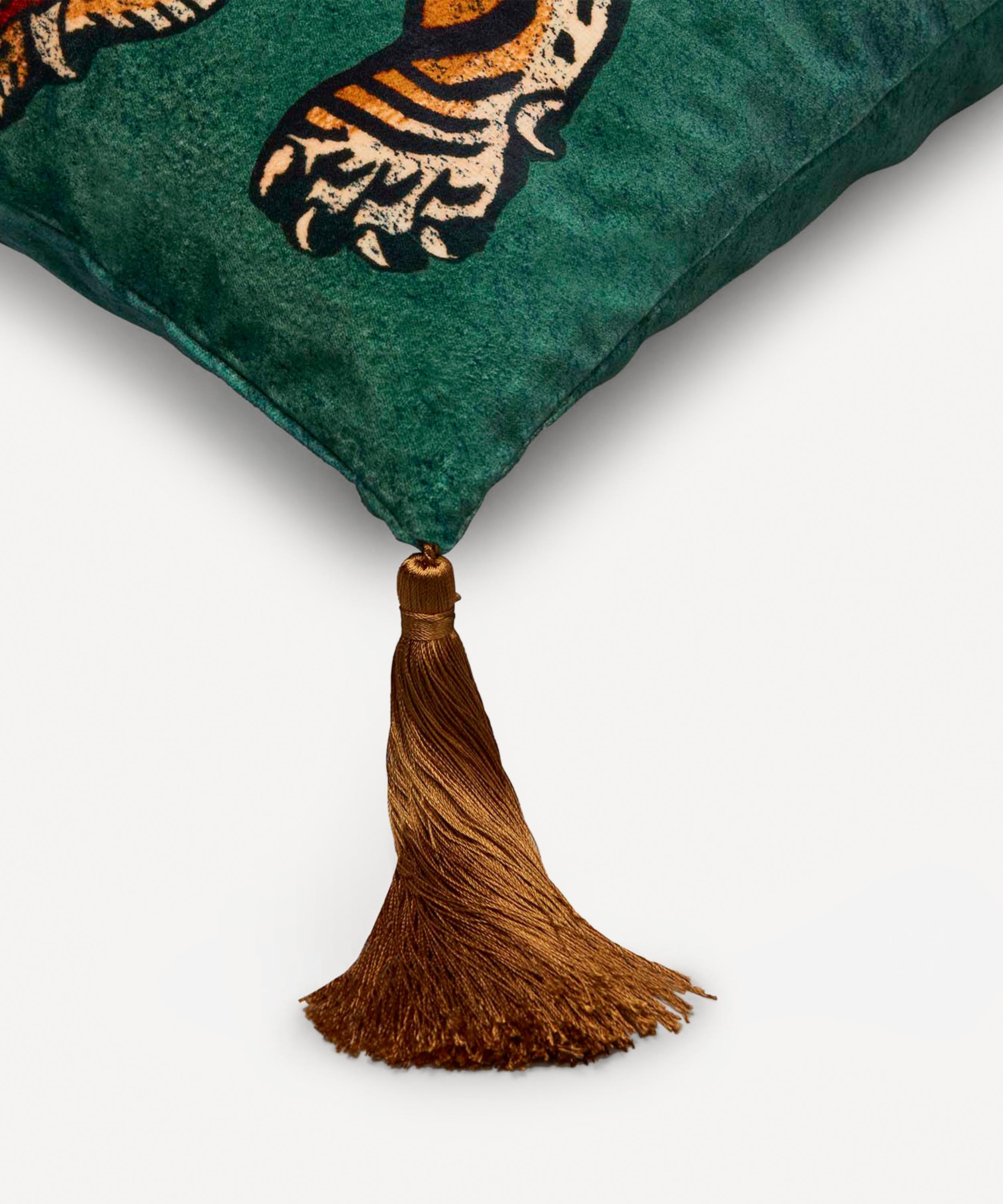 Cloaked in luxurious velvet, this tasselled cushion will delight animal lovers and interiors enthusiasts alike with its embroidered Tibetan tiger motif. Made in Britain using time-honoured manufacturing techniques, the distinctive design will breathe life into love-worn sofas and chairs, beautifully enhancing any room to opulent new heights.