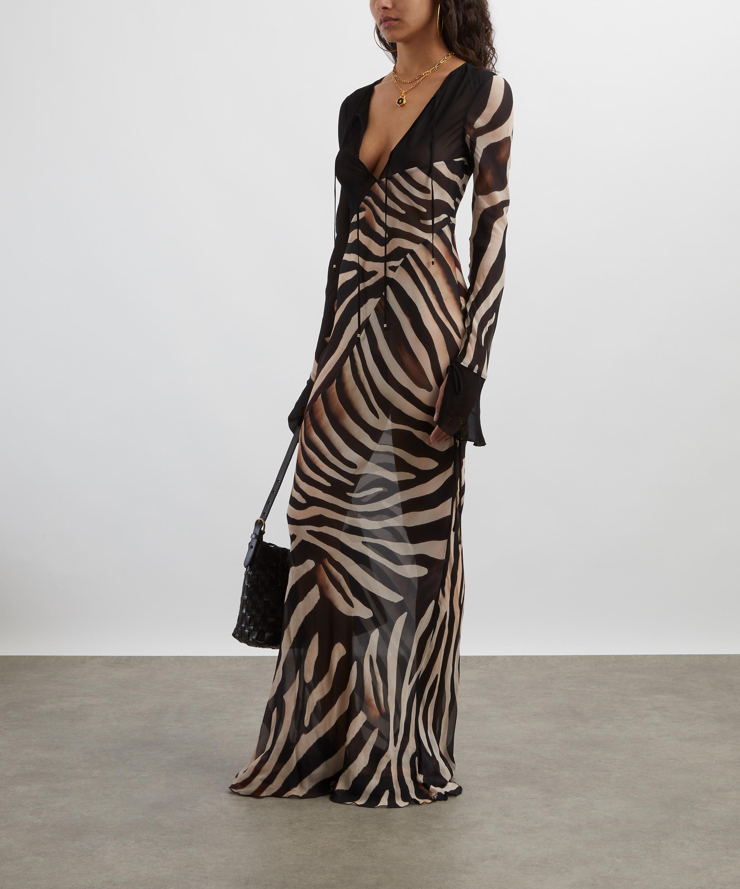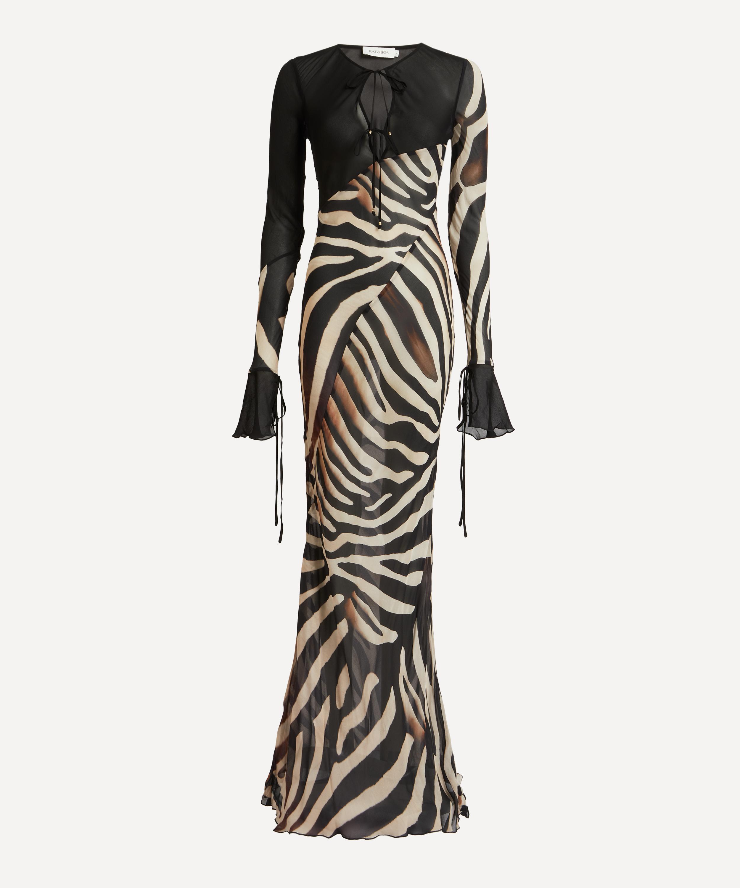 Crafted from semi-sheer viscose georgette and emblazoned with a striking zebra print, this maxi dress exudes sophistication with its figure-skimming mermaid silhouette, keyhole neckline, and long, flared sleeves.