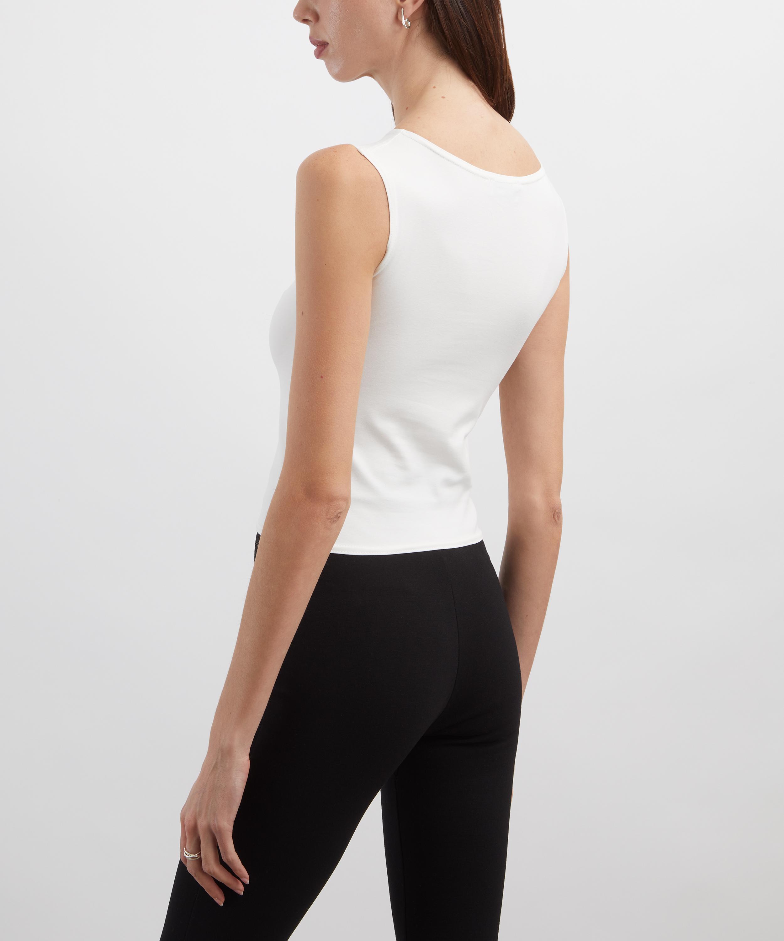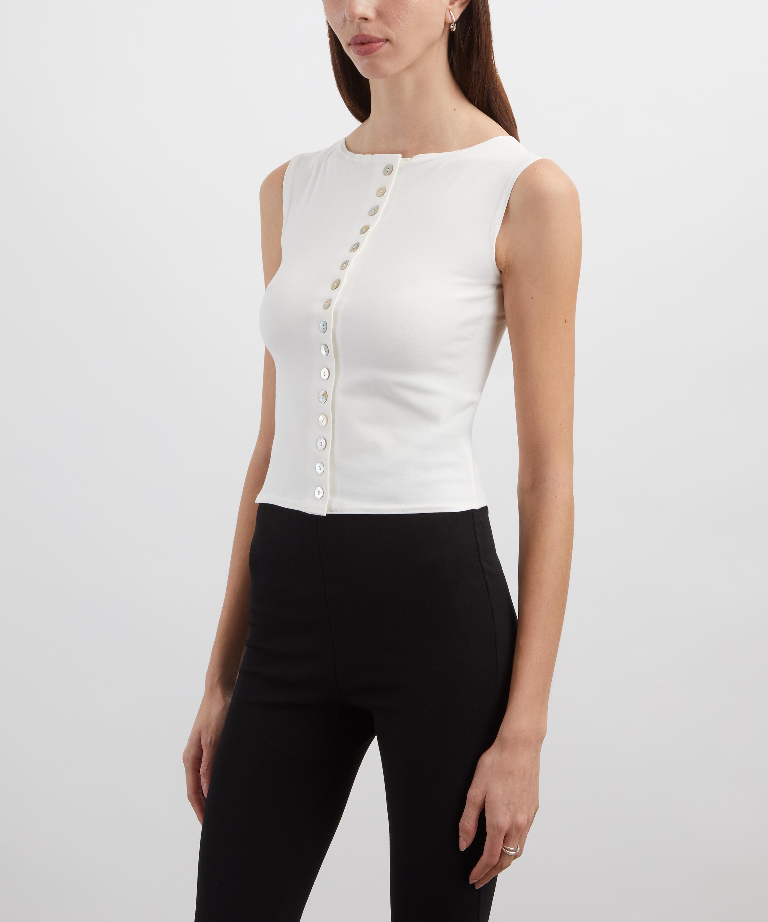 Crafted in London from soft cotton-stretch jersey, this slim-fit sleeveless top is defined by its elegant boat neckline and a full row of 16 mother-of-pearl buttons, creating a refined, flattering silhouette.