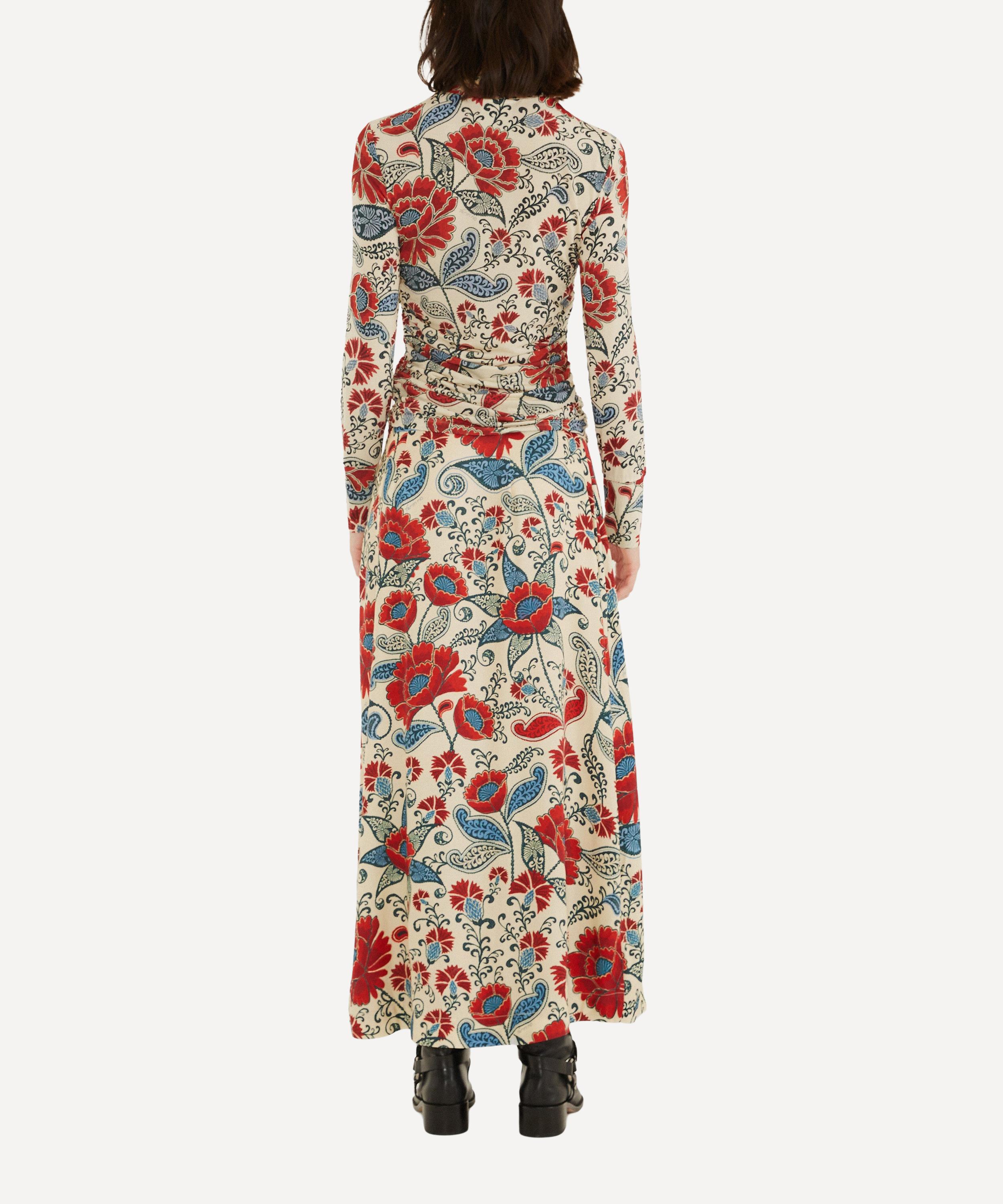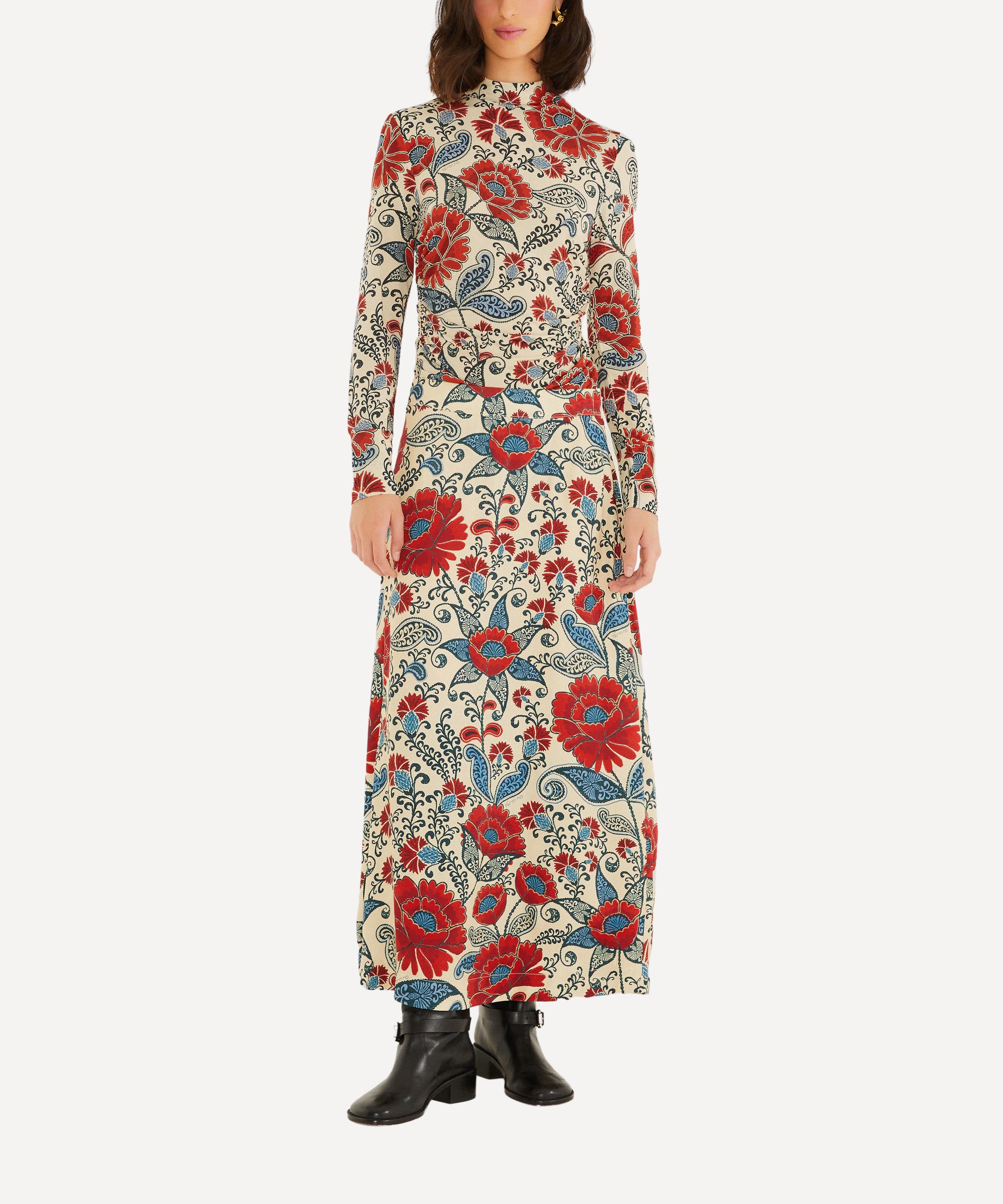 Flowing in a serene maxi silhouette, this skirt showcases a generous floral print in warm reds and soft blues over a sandy backdrop. Crafted from Lenzing® Ecovero® viscose, it drapes beautifully, while a side tie detail adds charm and movement for an effortless, playful finish.