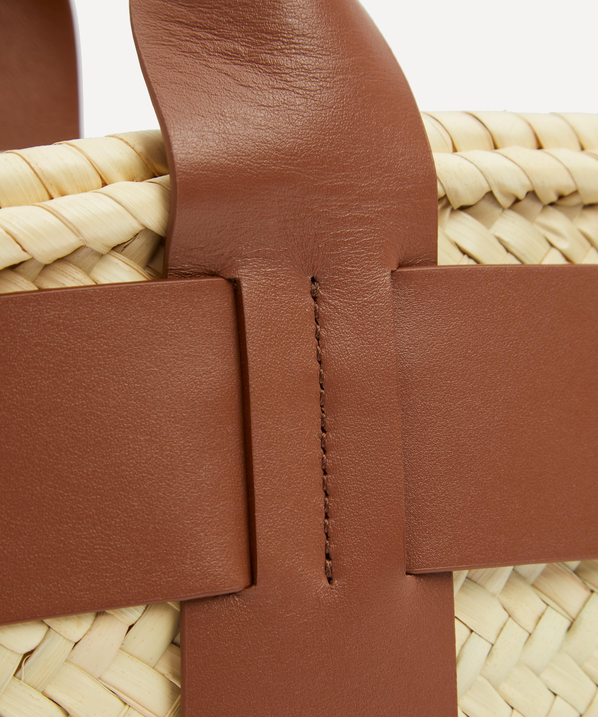 Handwoven by artisans in Morocco from palm leaves, it boasts a unique finish. The spacious silhouette is wrapped in a leather harness and features two tubular leather top handles. Embossed with a foiled logo, it offers an ideal size to carry all your essentials to the beach and beyond.