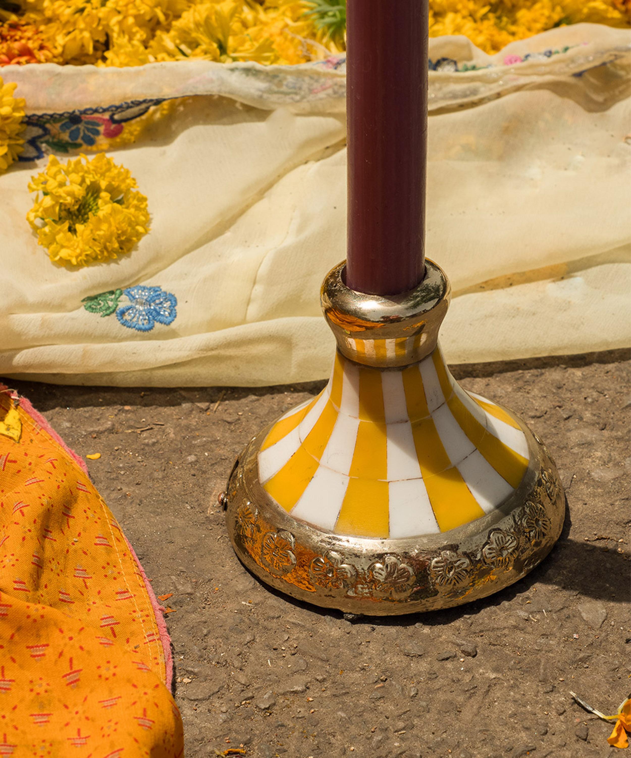 Inspired by traditional candleholders, it’s impeccably handcrafted from a blend of brass and resin and stands on an engraved gold-tone base – note the ornate floral detailing, a nod to Doing Goods’ meticulous attention to detail and artisanal flair. Patterned with eye-catching yellow and white stripes, it lends a luxurious feel to your tabletop, shelves or mantlepiece.