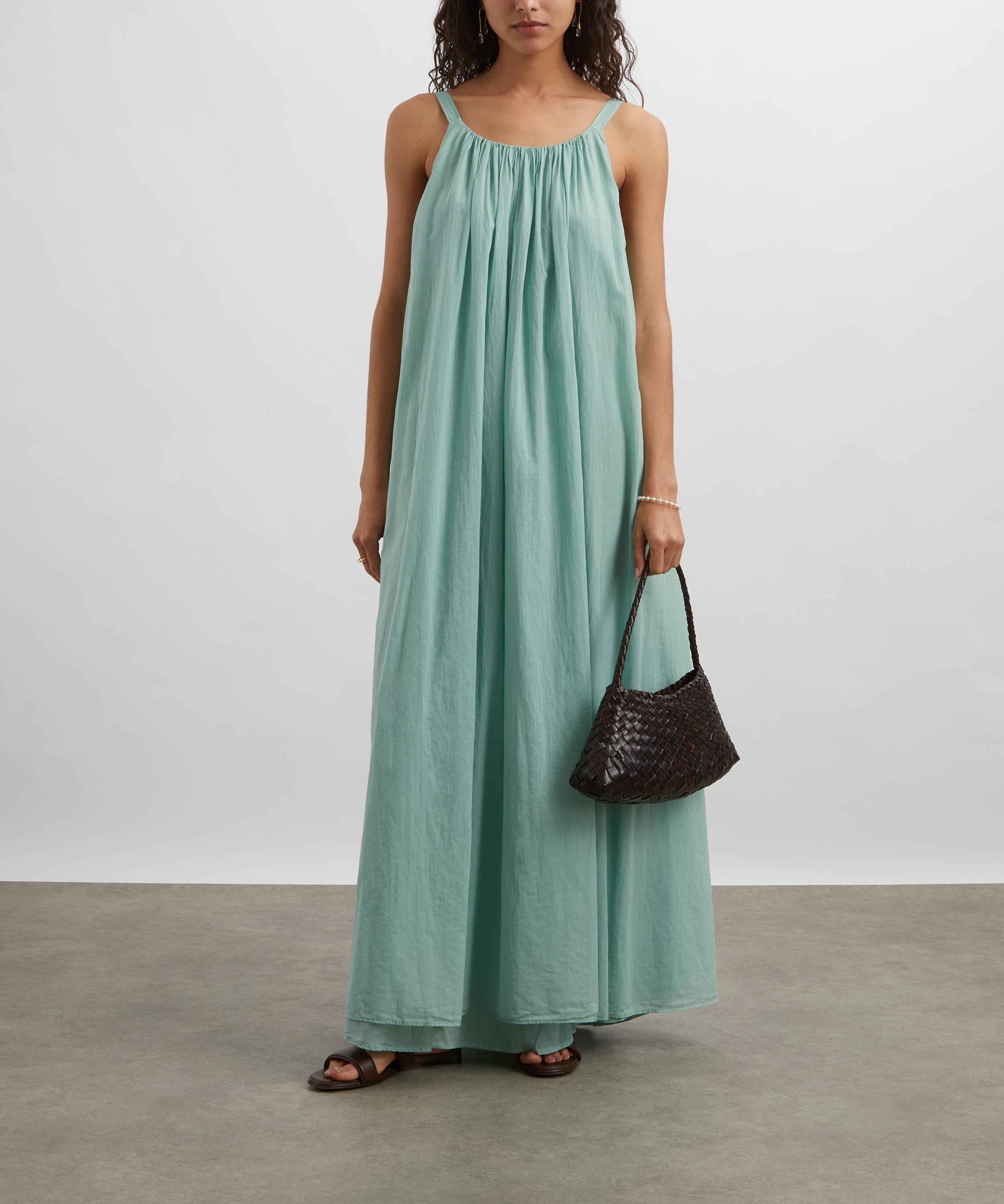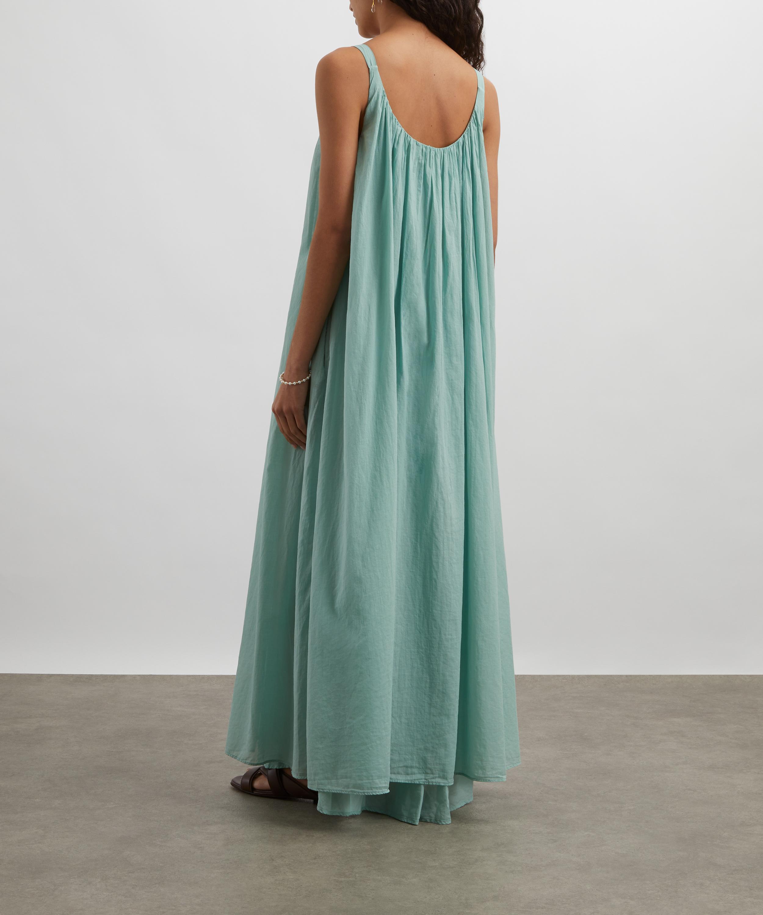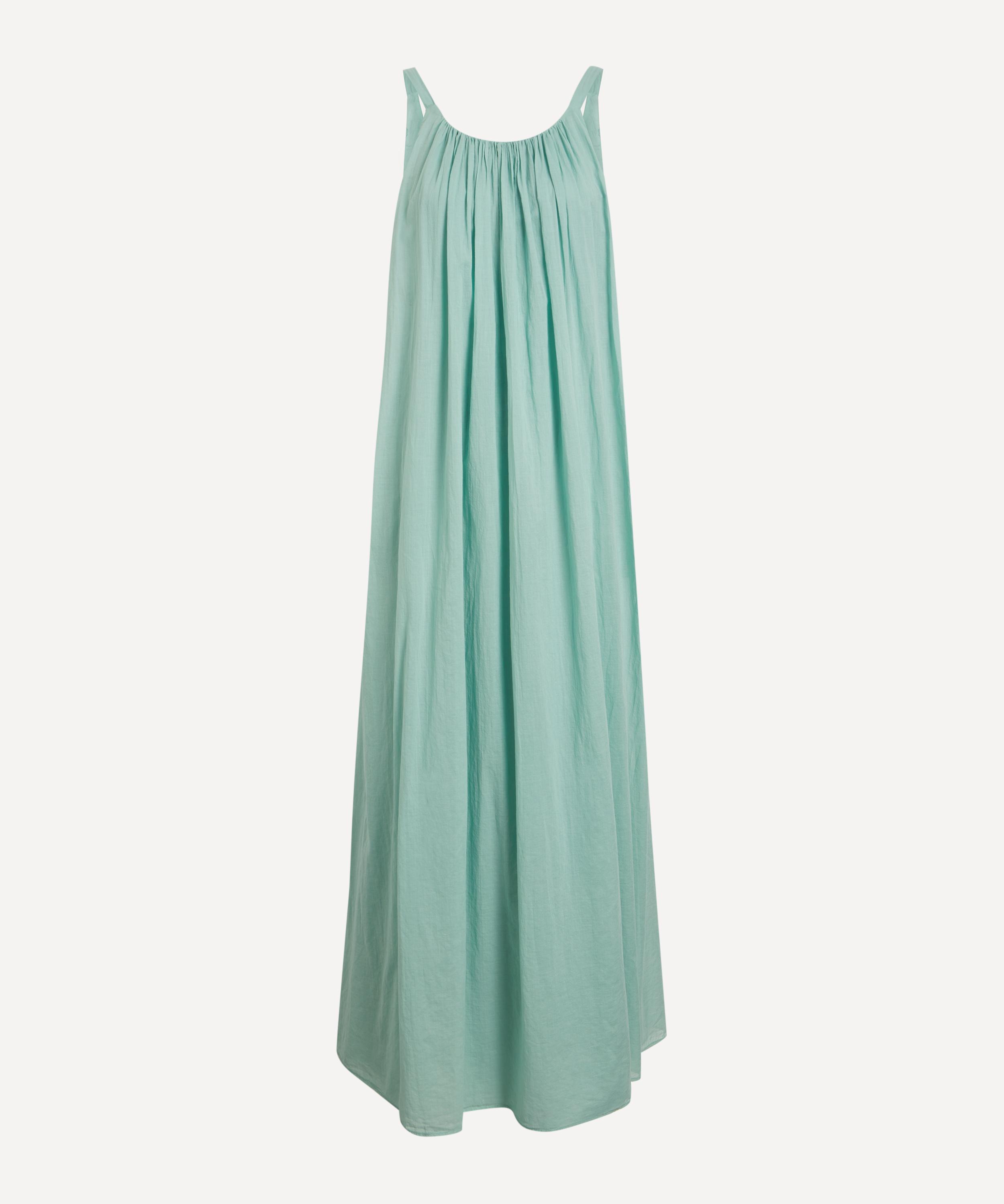 Crafted from lightweight cotton, this breezy maxi dress radiates effortless elegance with a gathered scoop neckline and a flowing silhouette that drapes gracefully below the ankle.