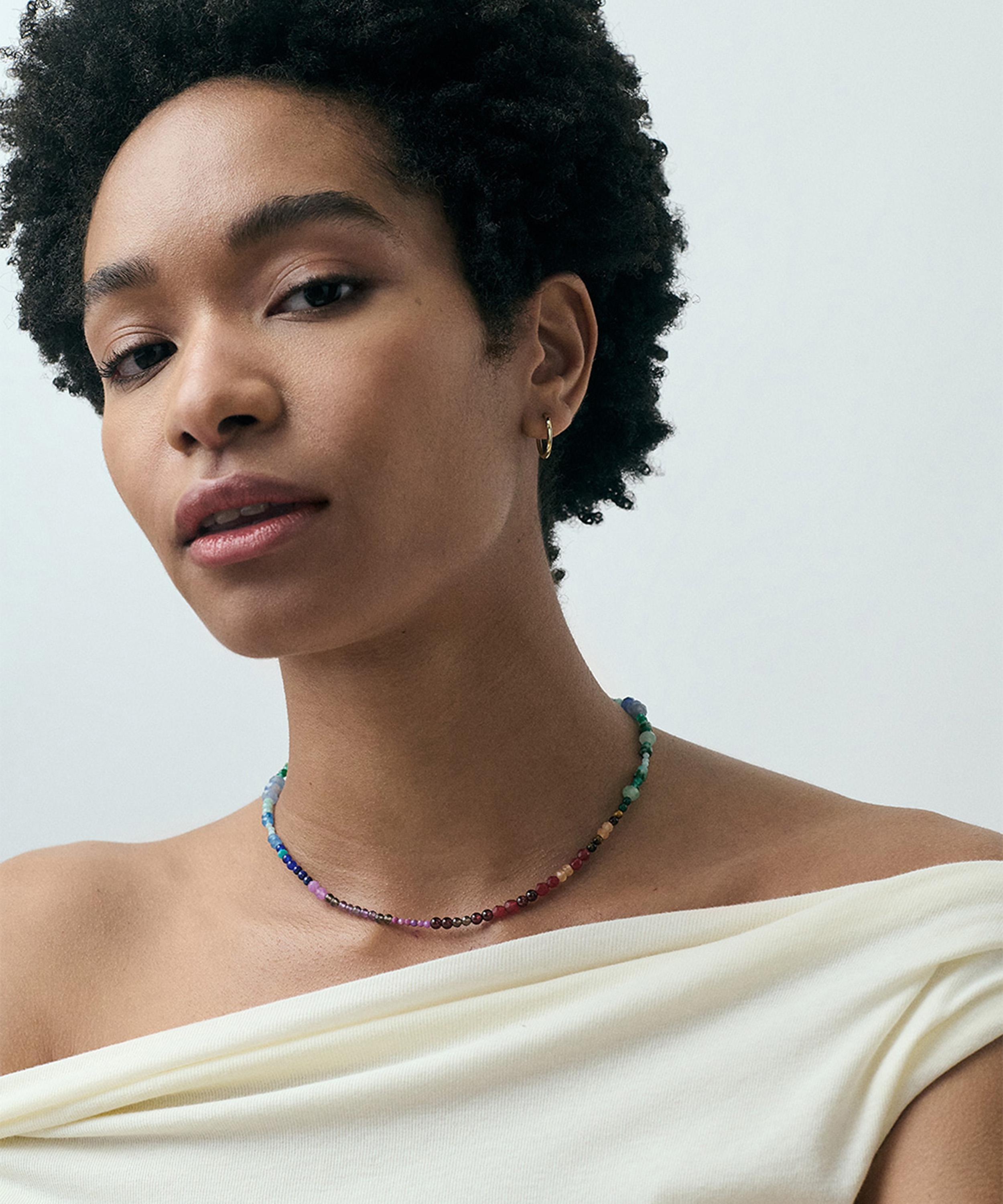 Crafted from sterling silver plated in 18ct gold vermeil, it features an array of mixed semi-precious rainbow gemstones, repurposed from left over beads. Designed to be layered with chains for a dynamic stack, it can also be worn alone for a subtle pop of colour.
