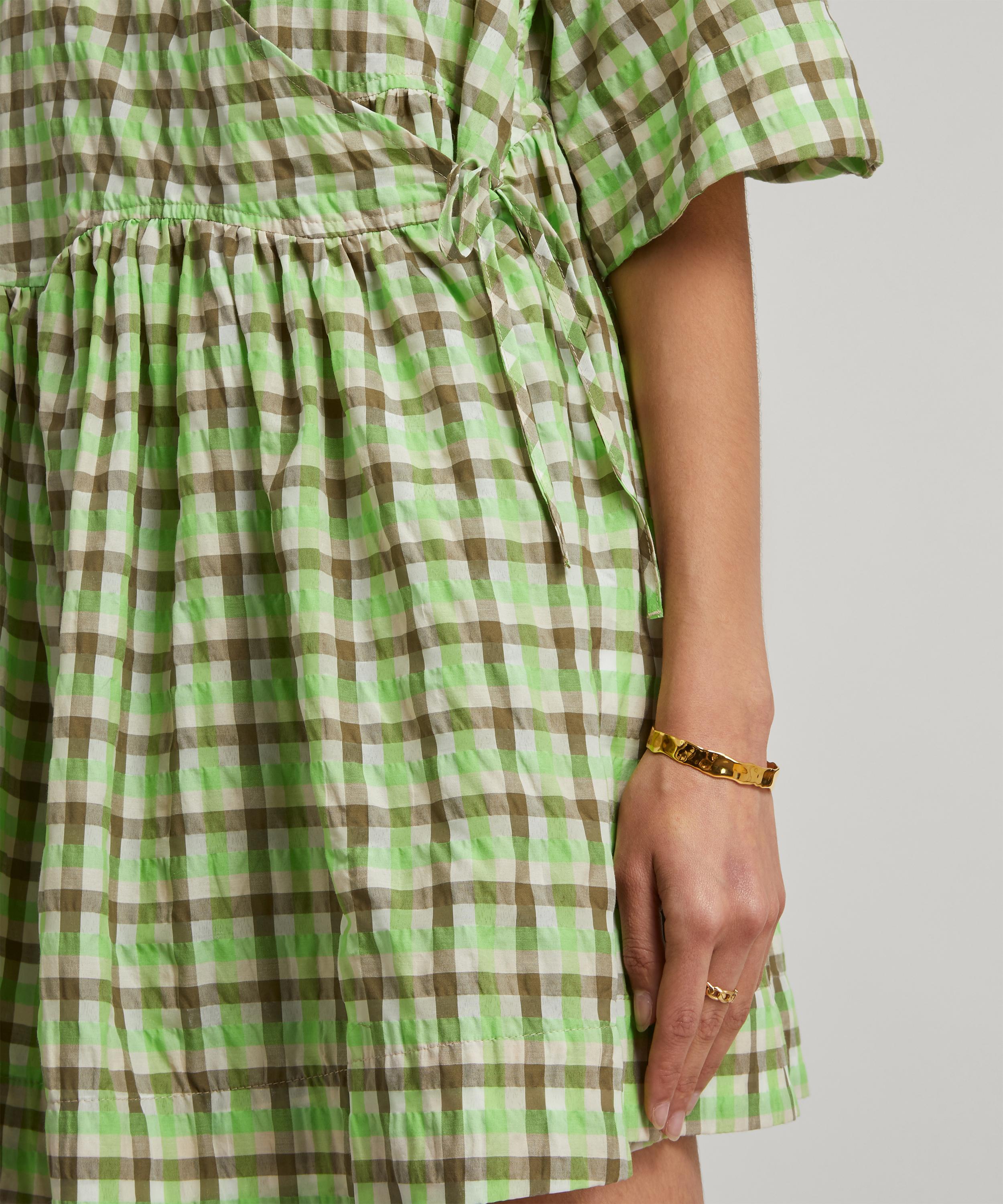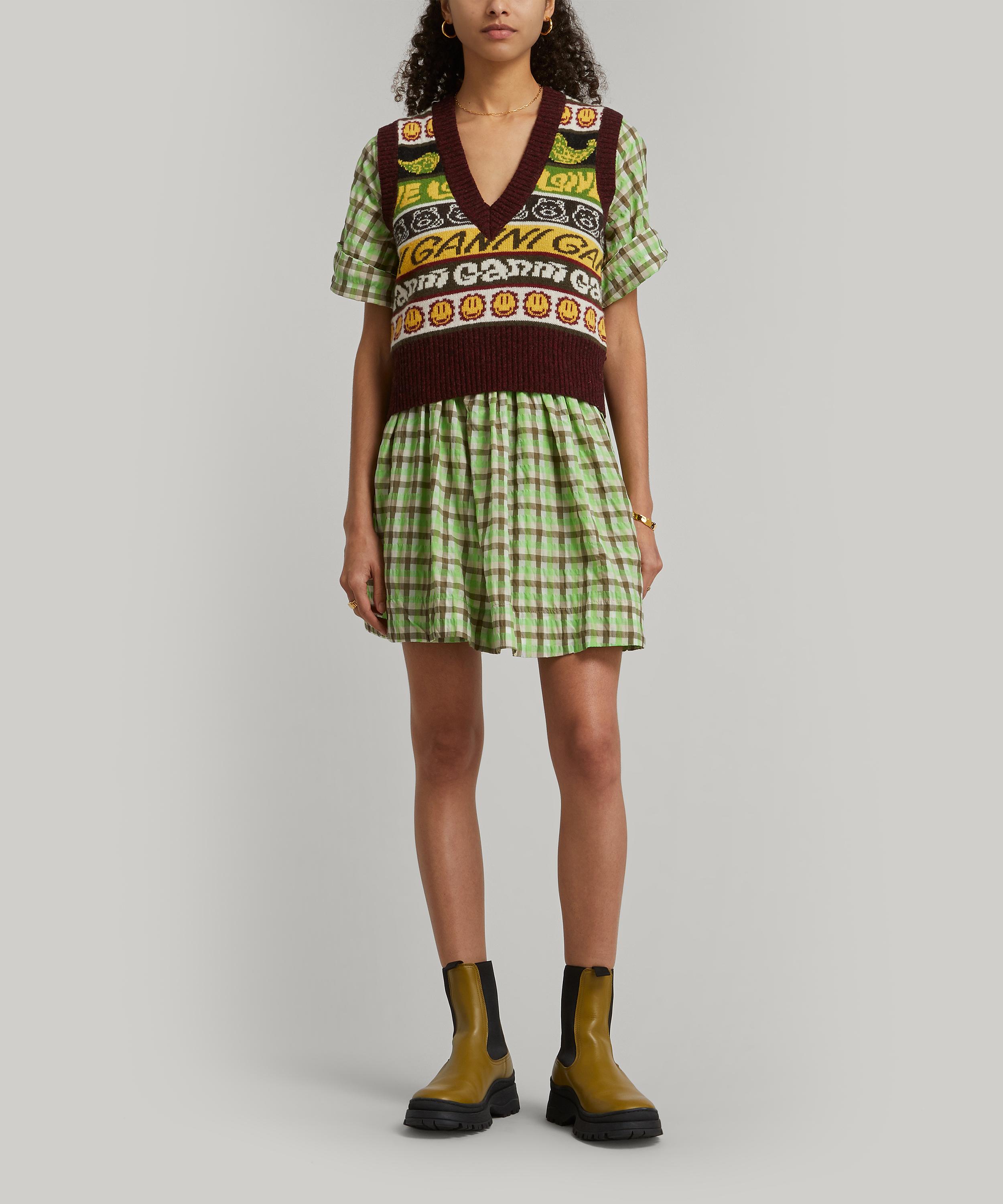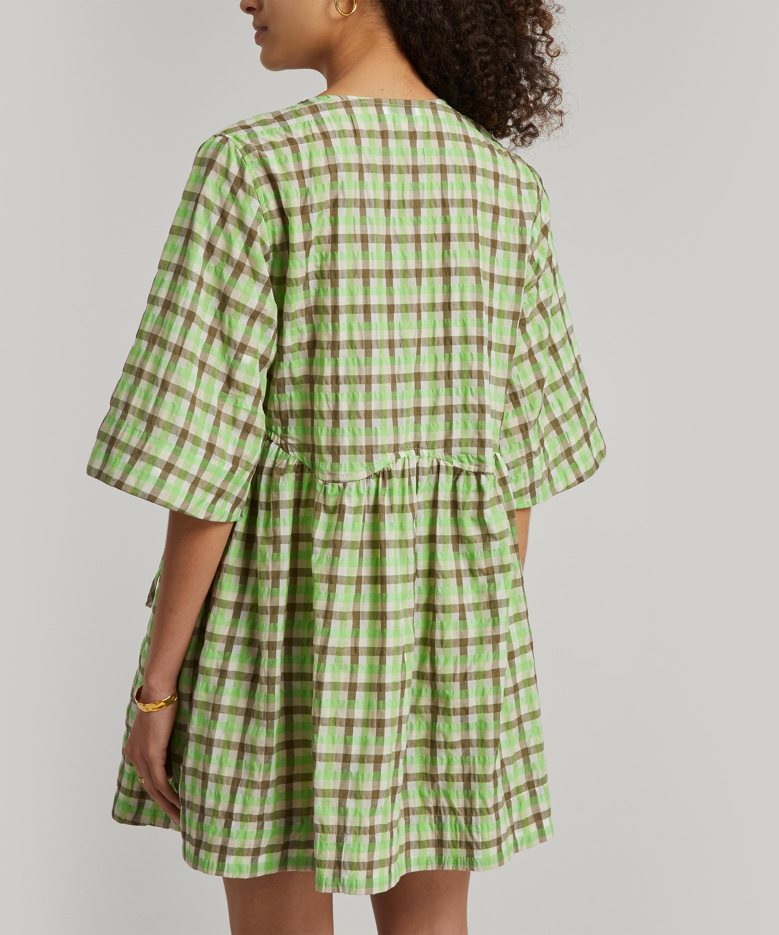 This mini-length dress from Ganni is crafted from an organic cotton and recycled polyester blend with a check print throughout. With half-length sleeves and a gathered waistline, it’s a flirty style with that effortless Ganni cool – try layering under a knit vest for a layered transitional look.